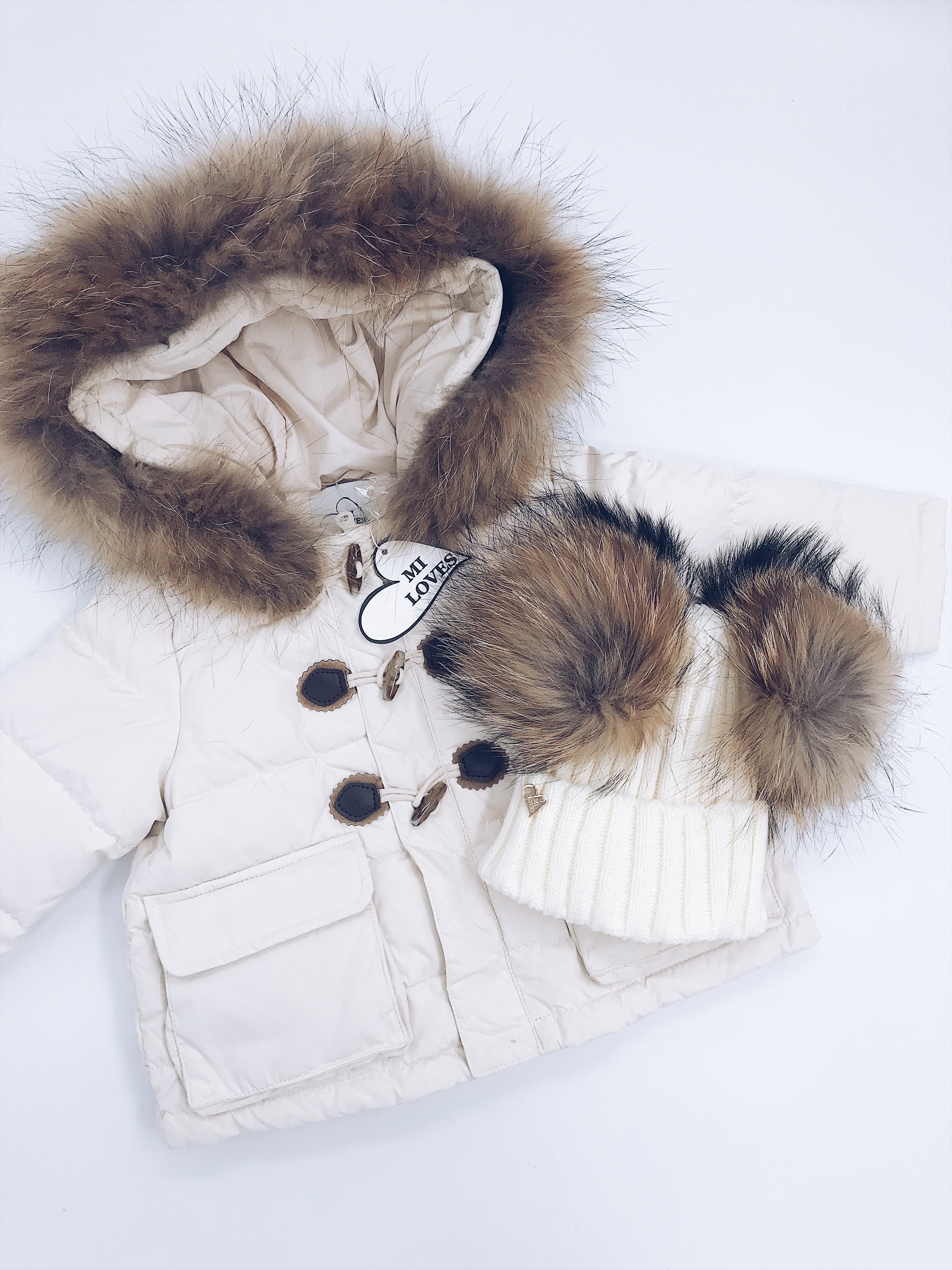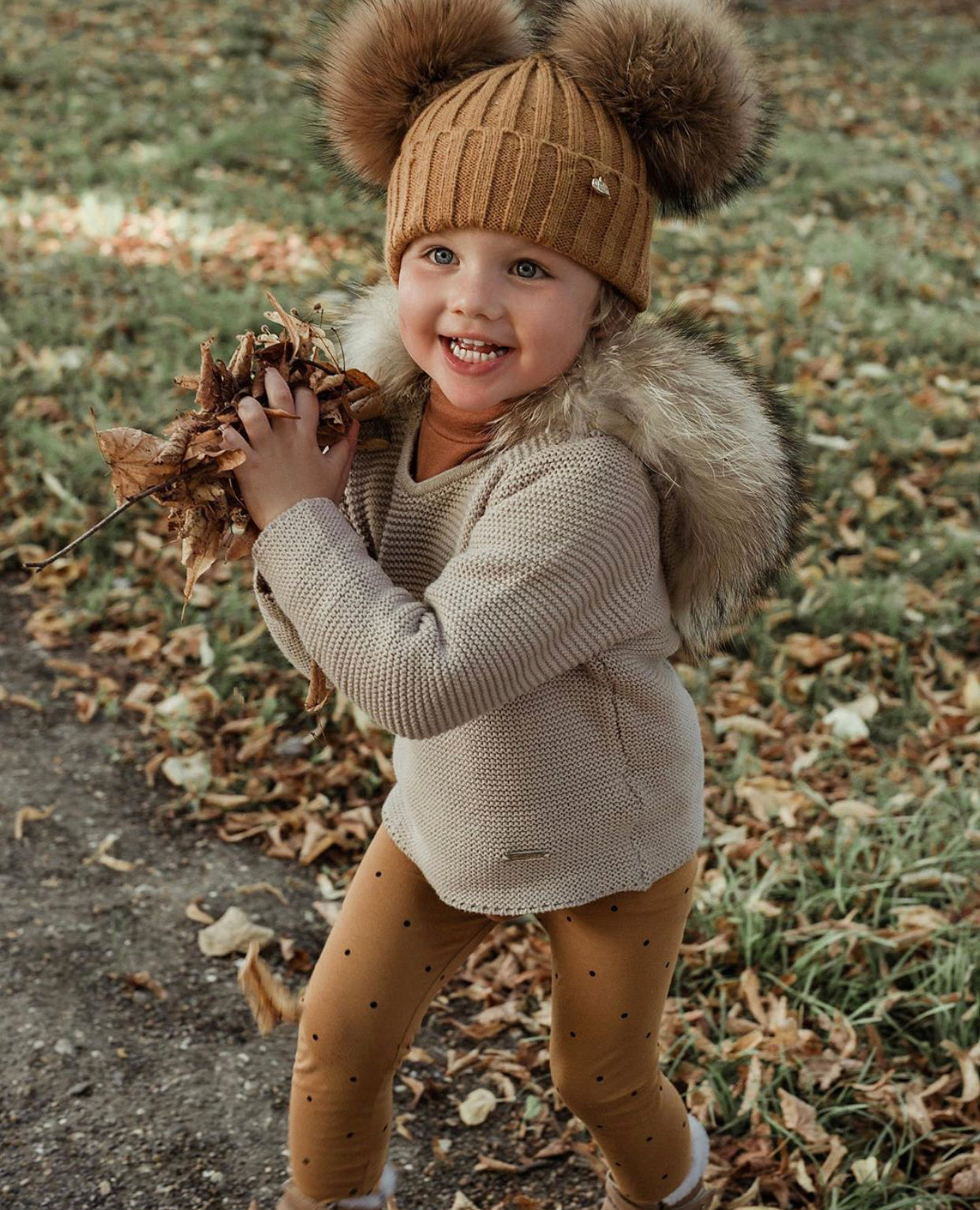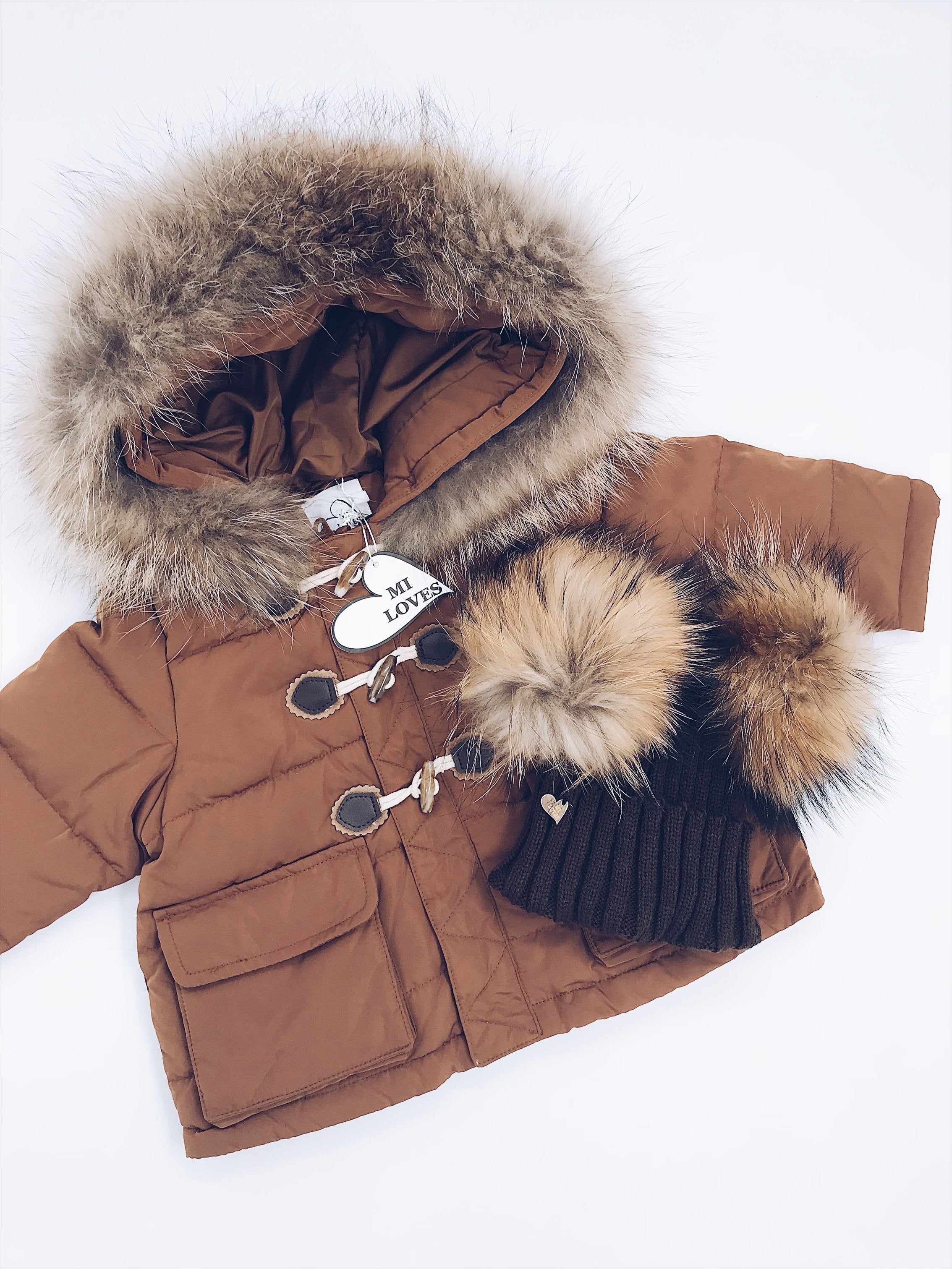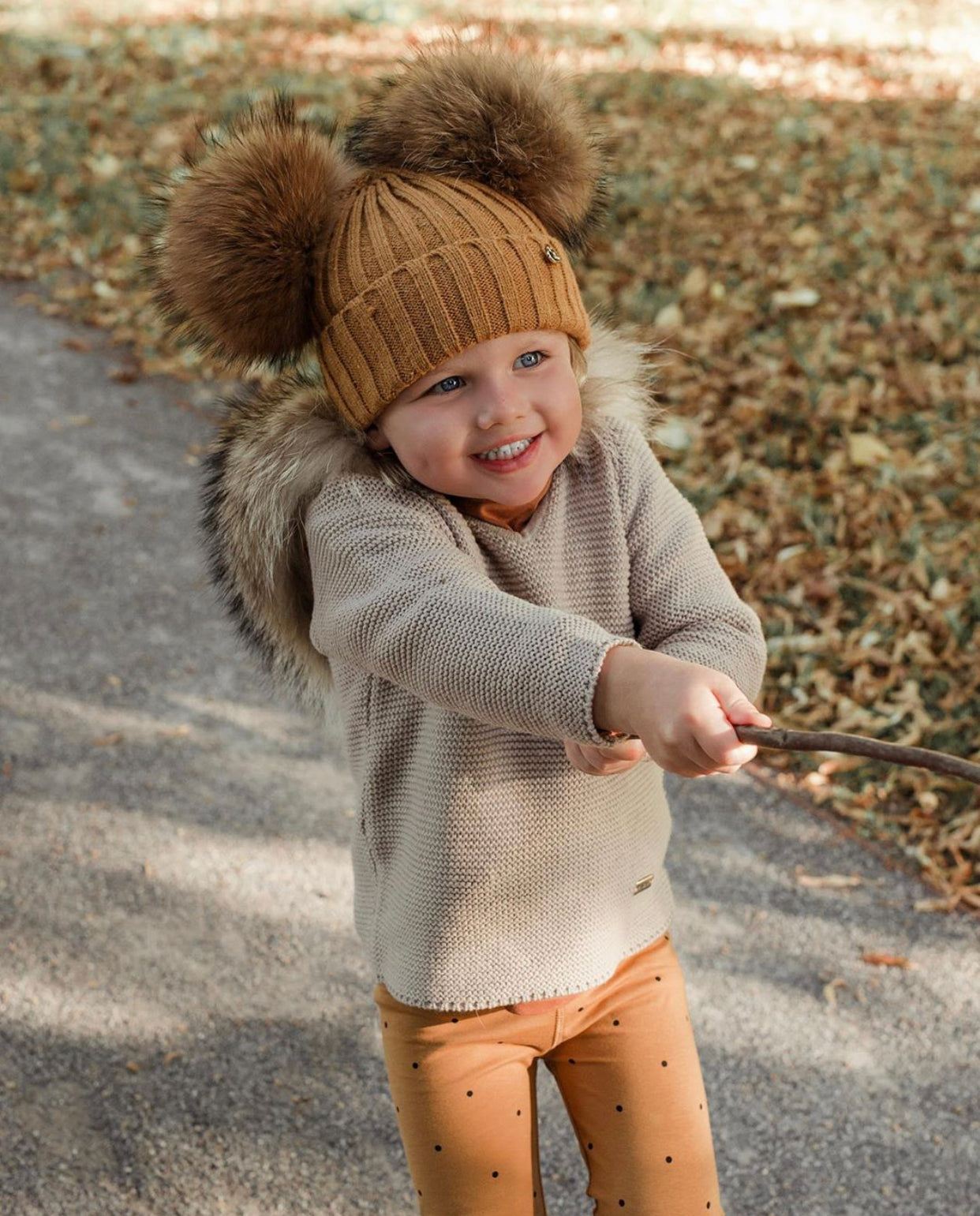 Mi Loves Signature Double pompom hat with brown/Natural pompoms