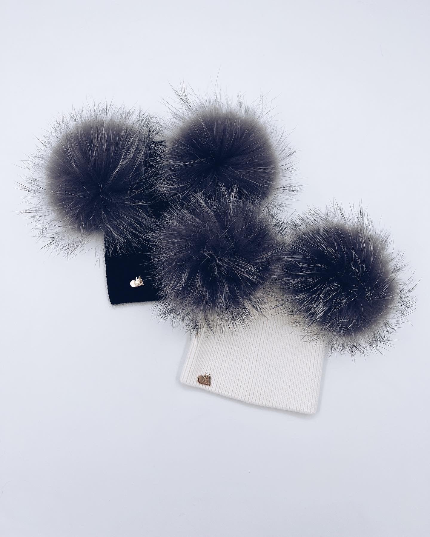MI LOVES Signature Adults Angora Double pompom hat will silver pompoms