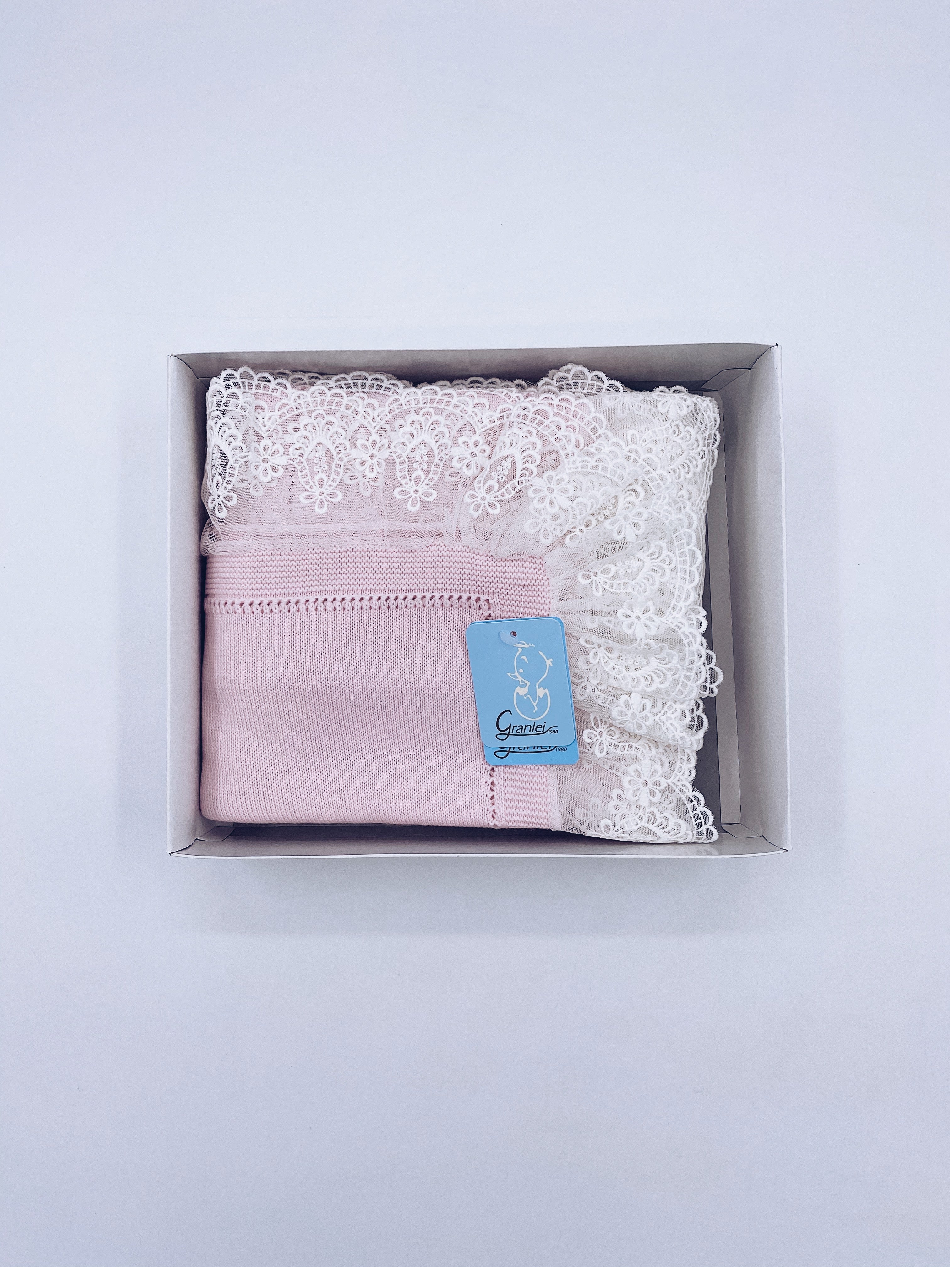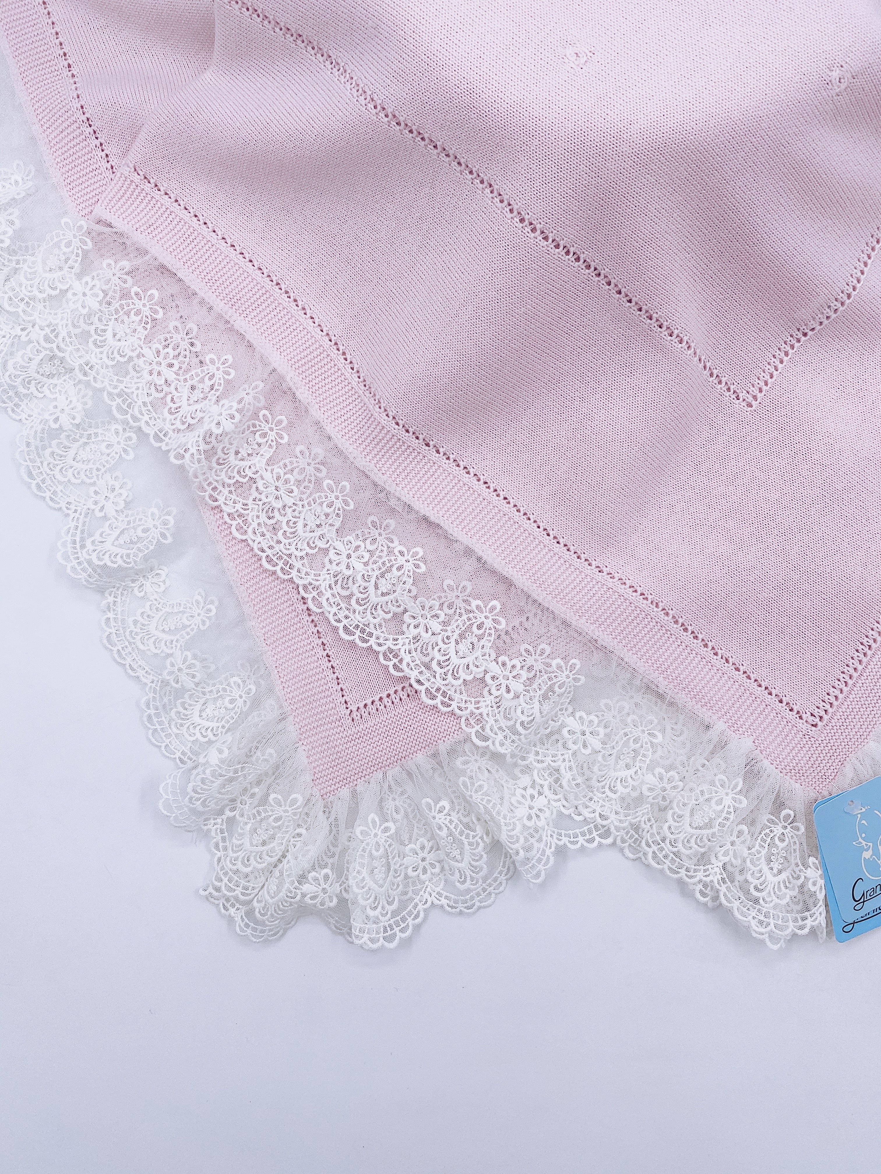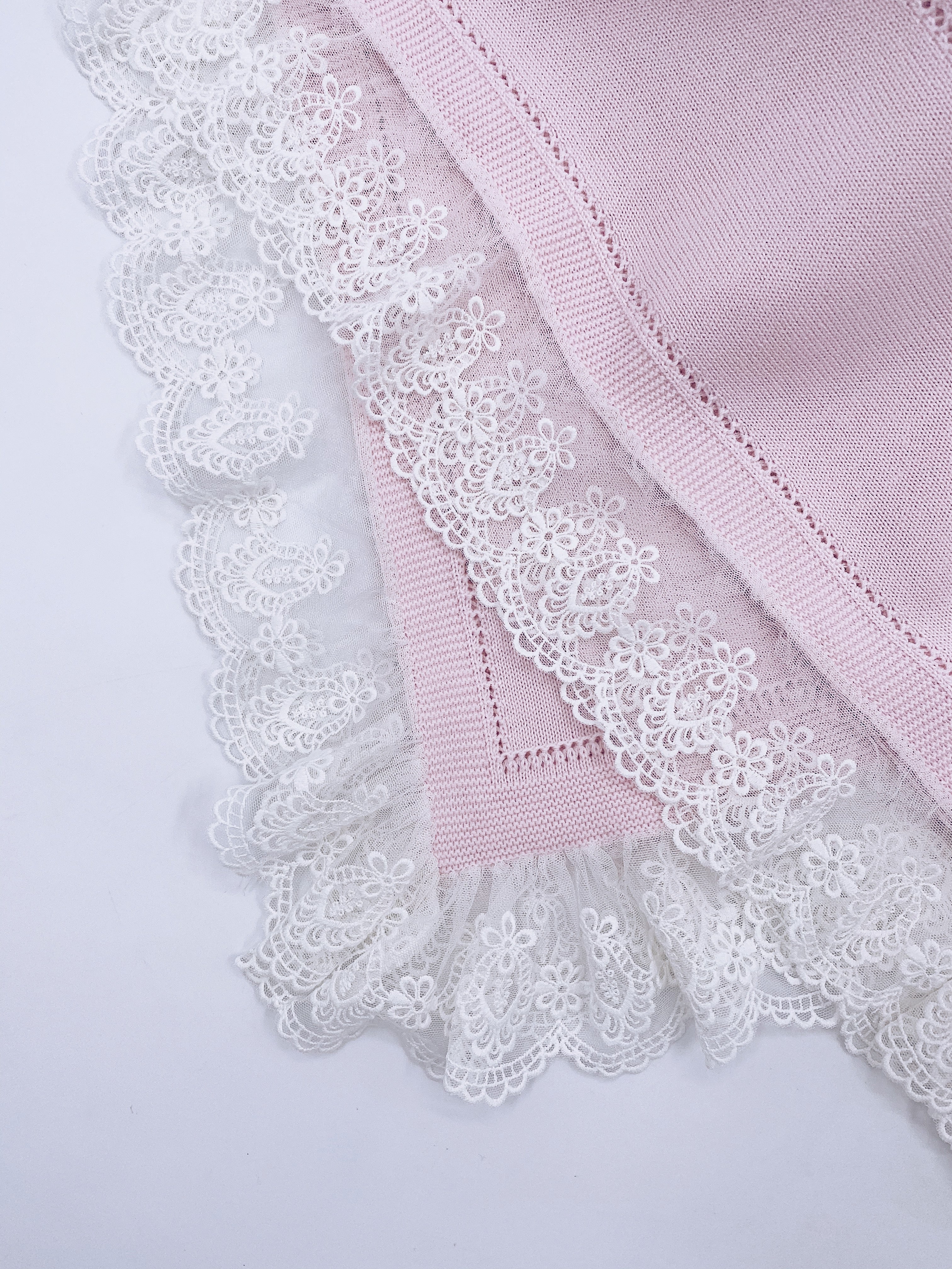 Beautiful Dusty pink knitted blanket with lace trim(98cm).Suitable for boys and girls.