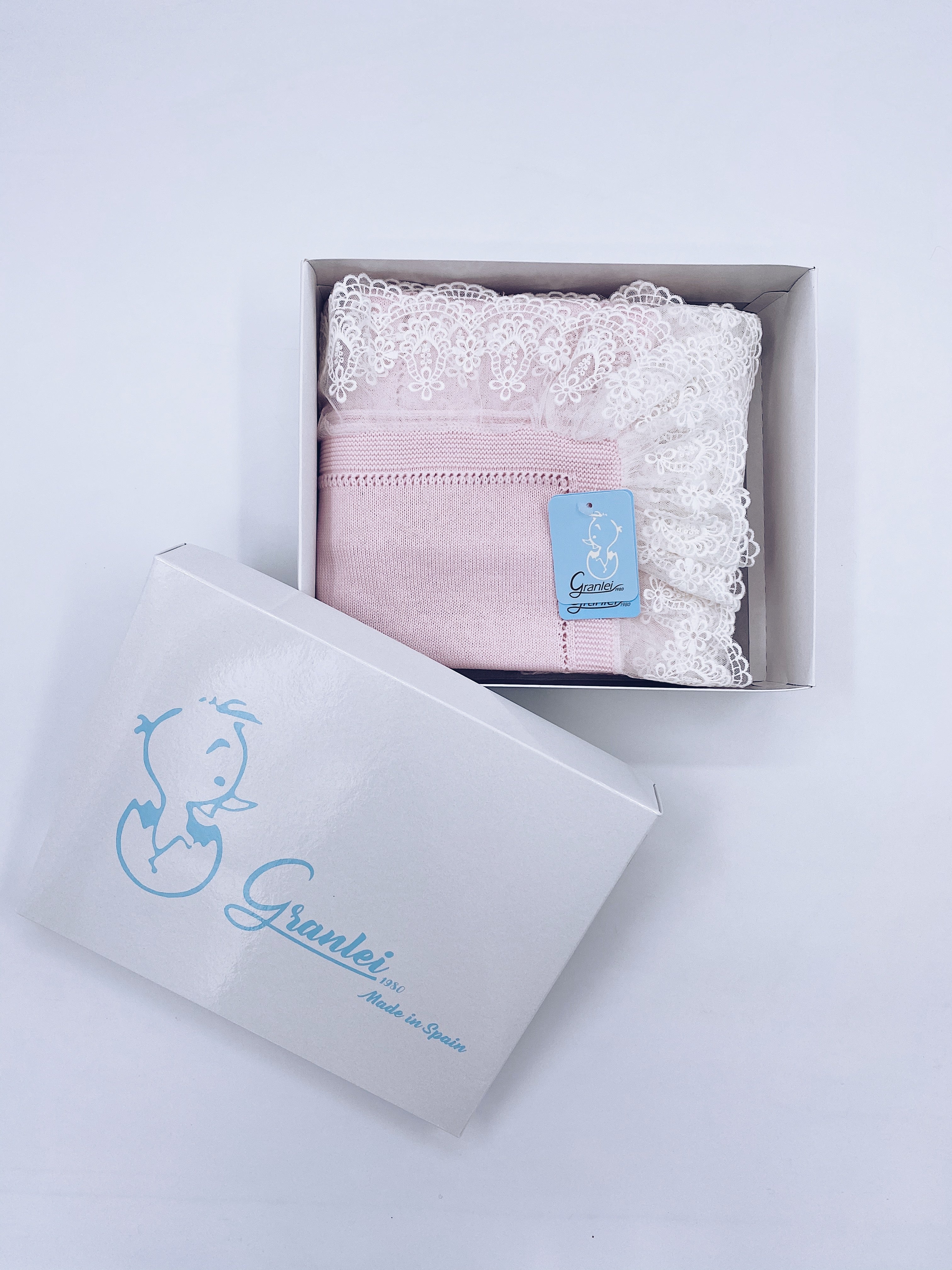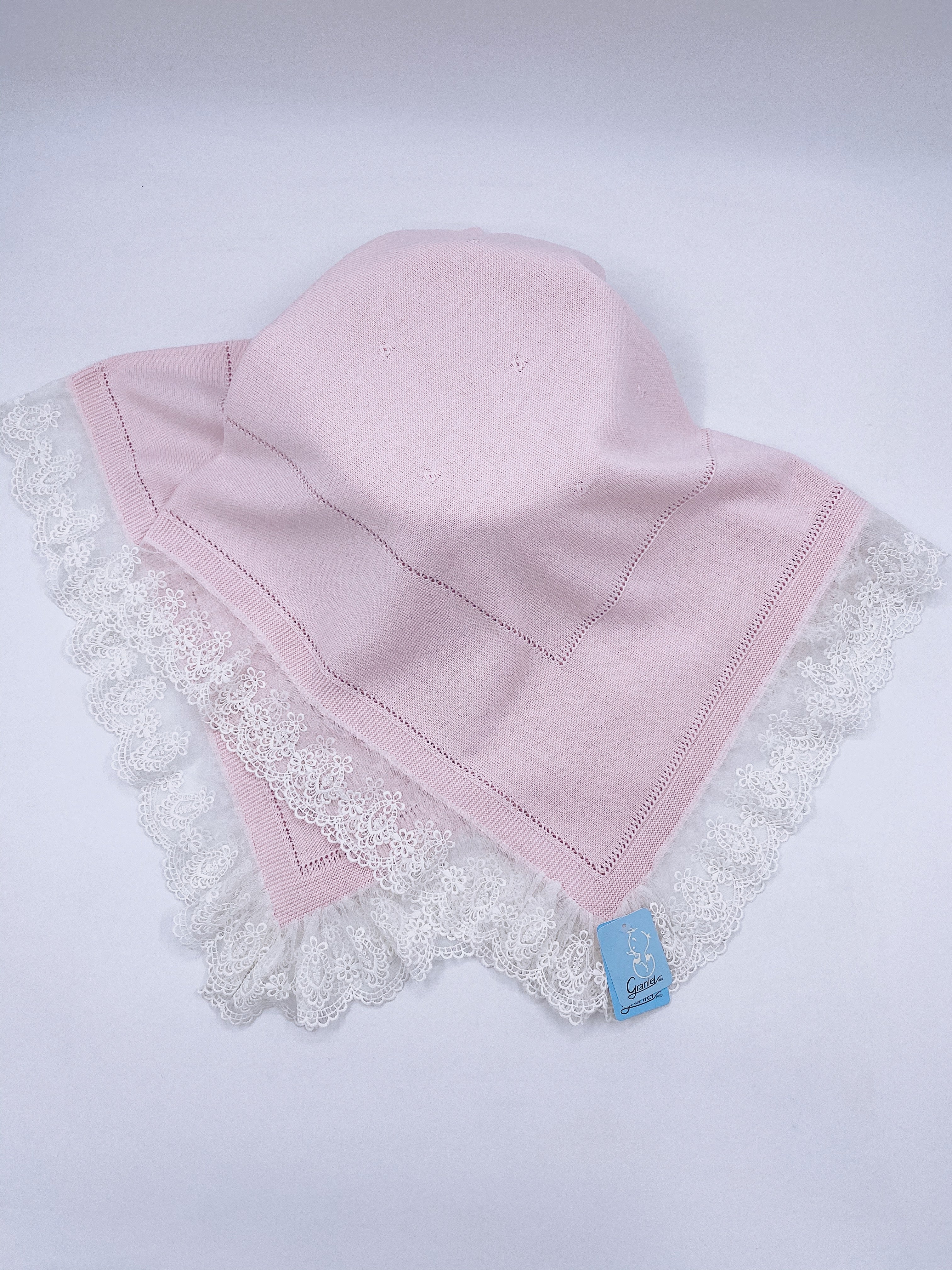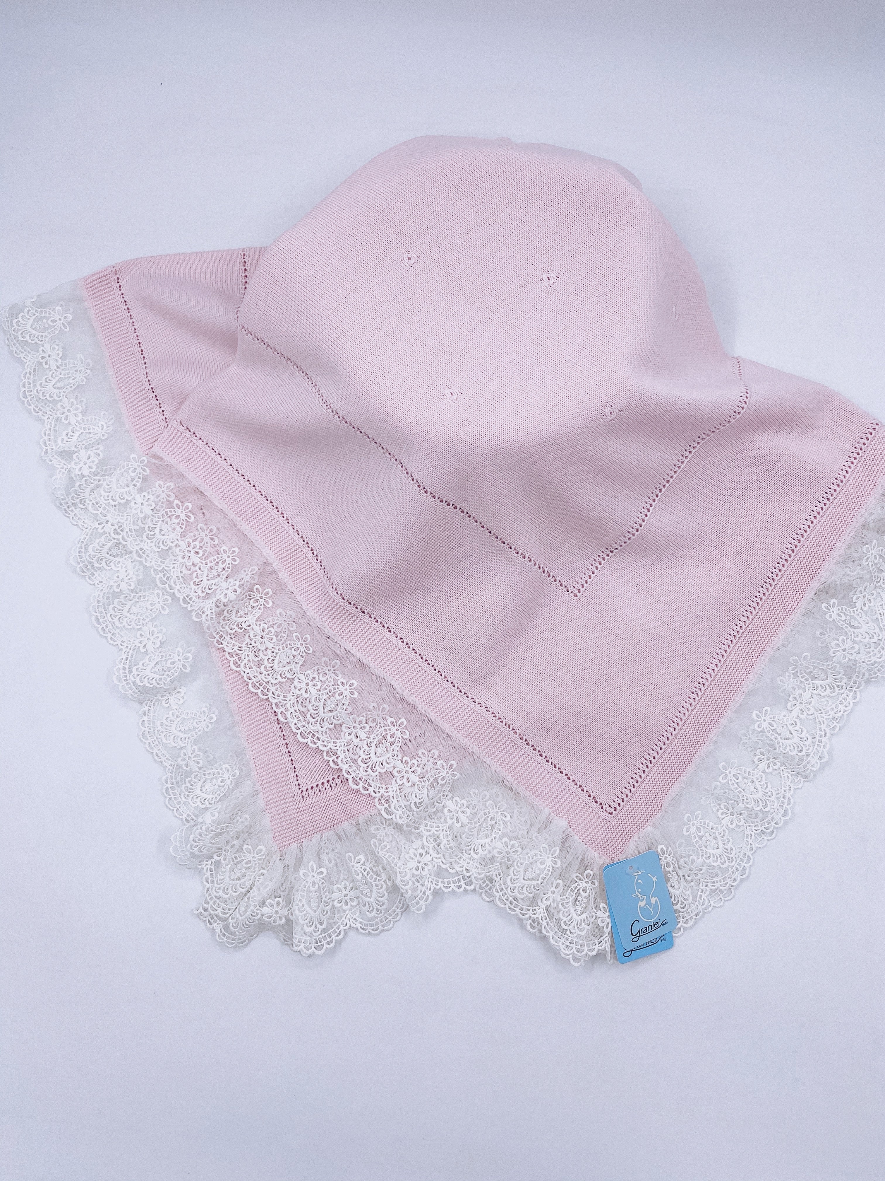 Beautiful Dusty pink knitted blanket with lace trim(98cm).Suitable for boys and girls.