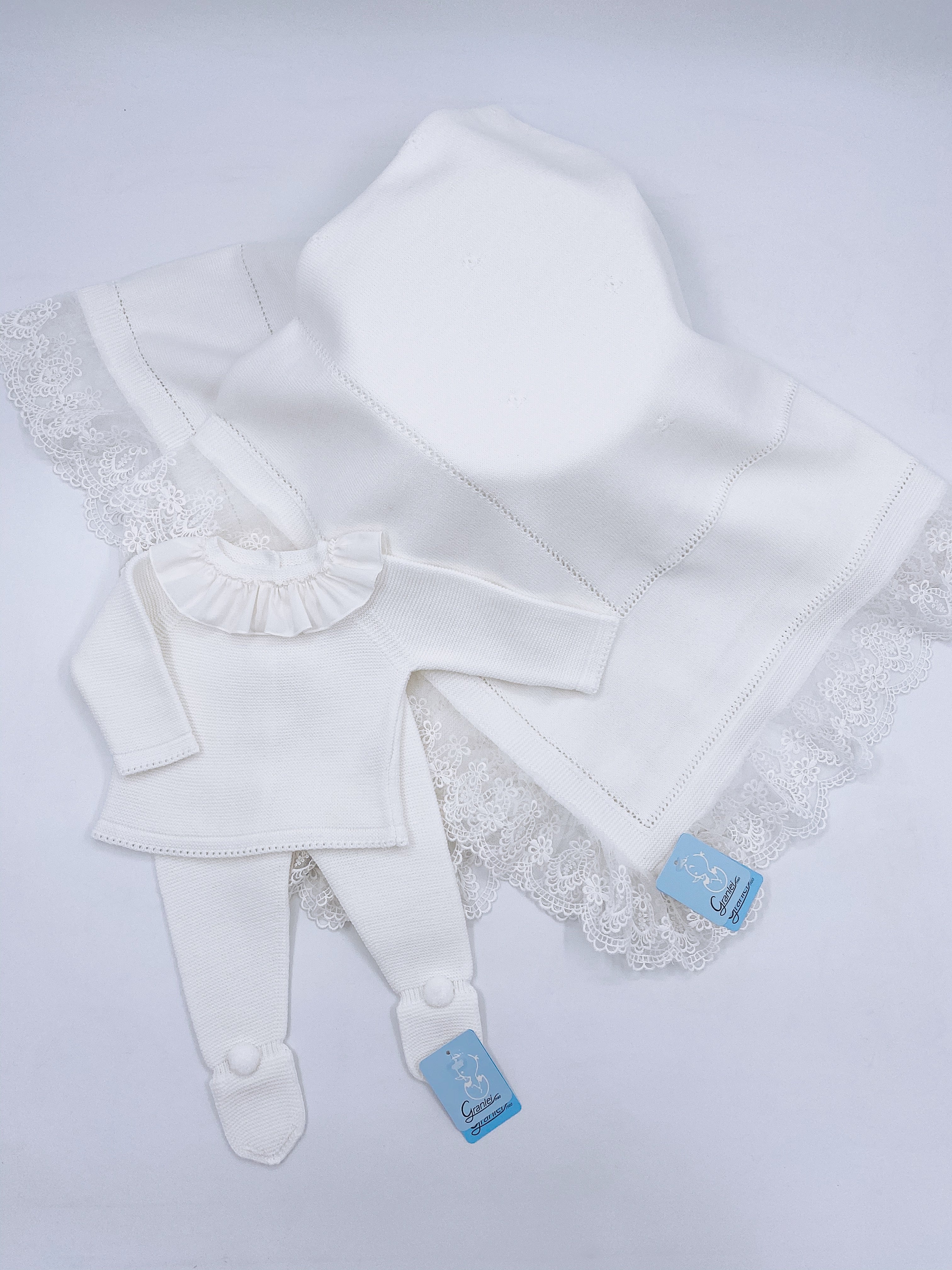 Beautiful Ivory knitted blanket with lace trim(98cm).Suitable for boys and girls.