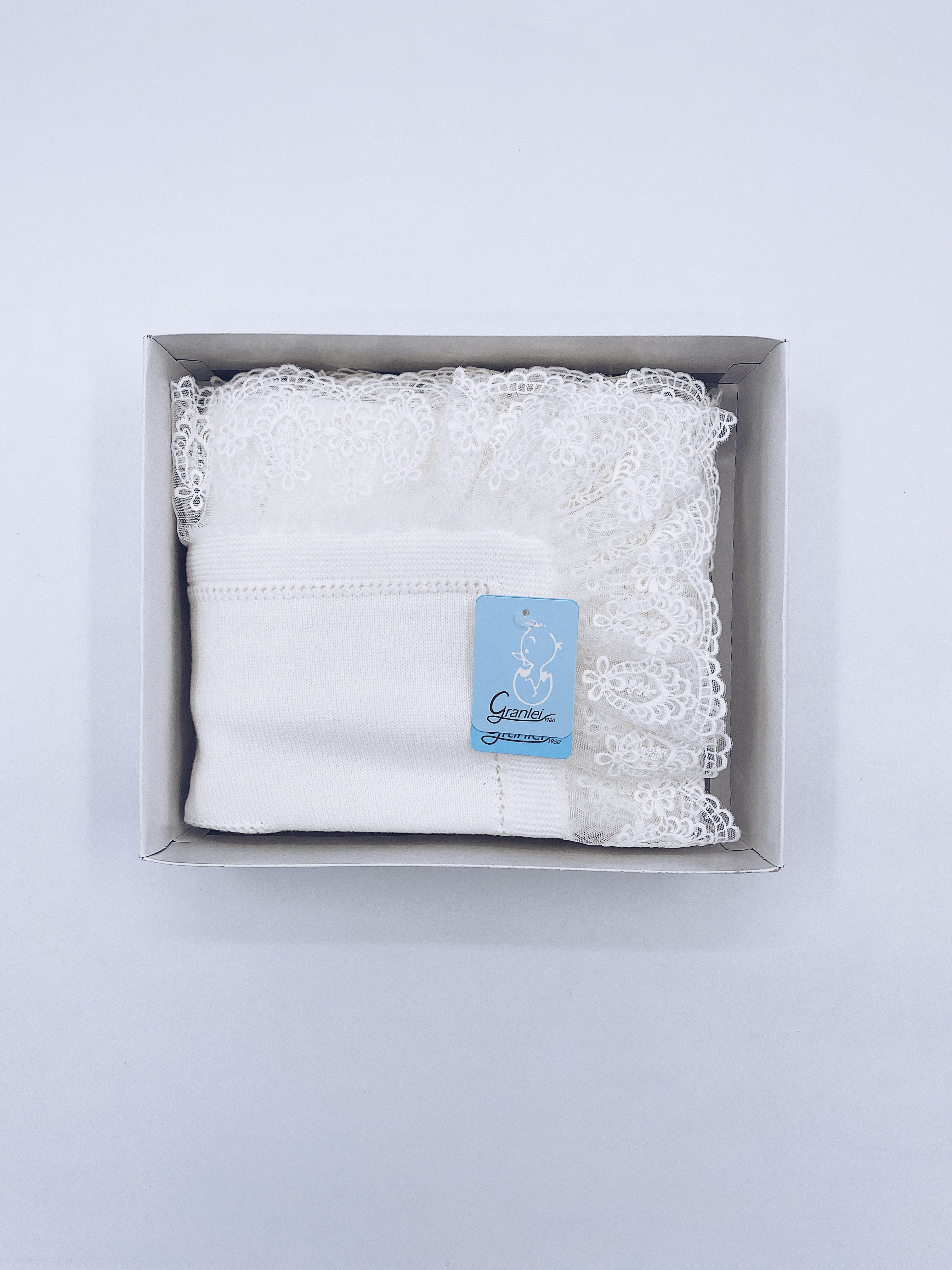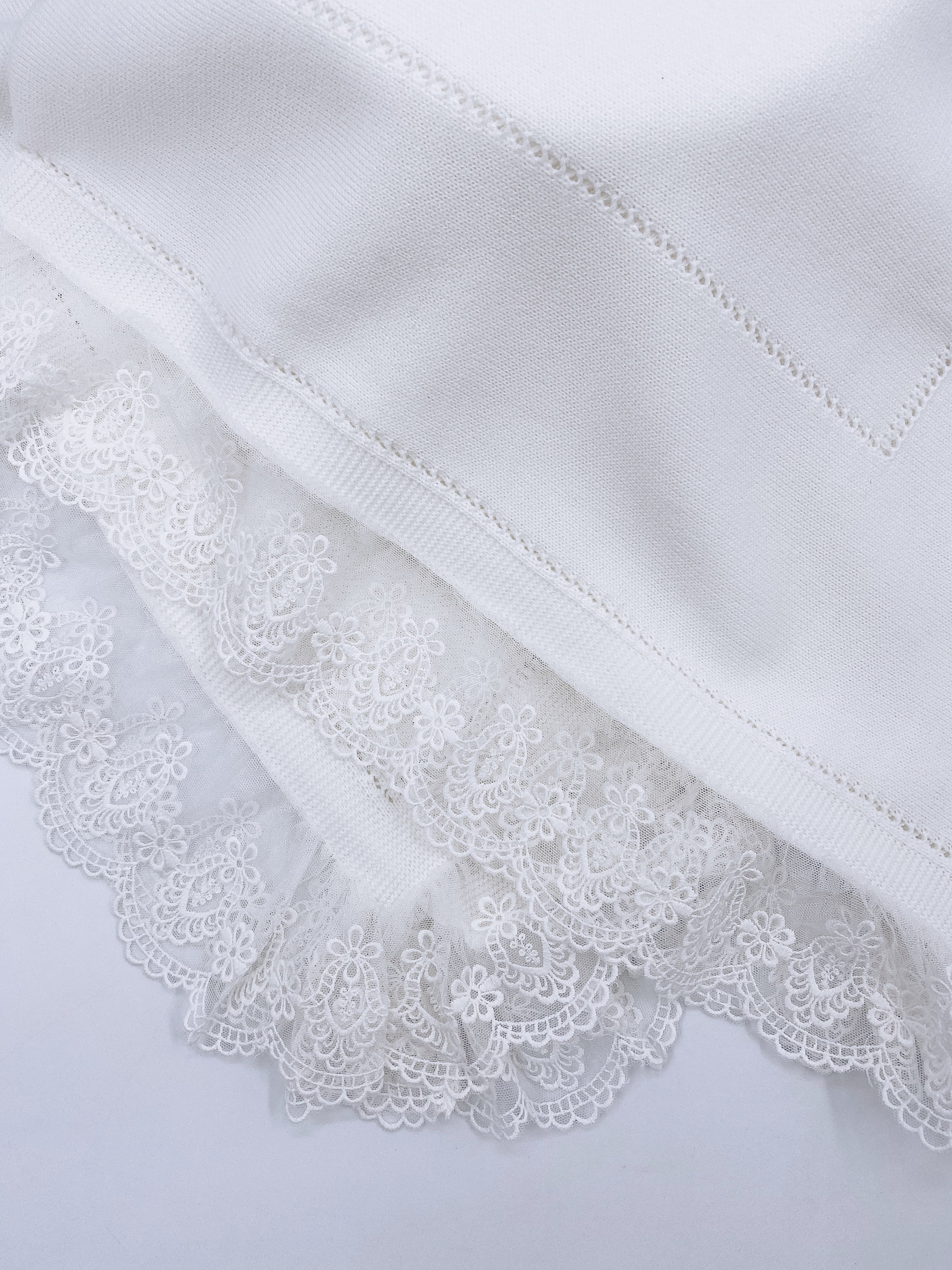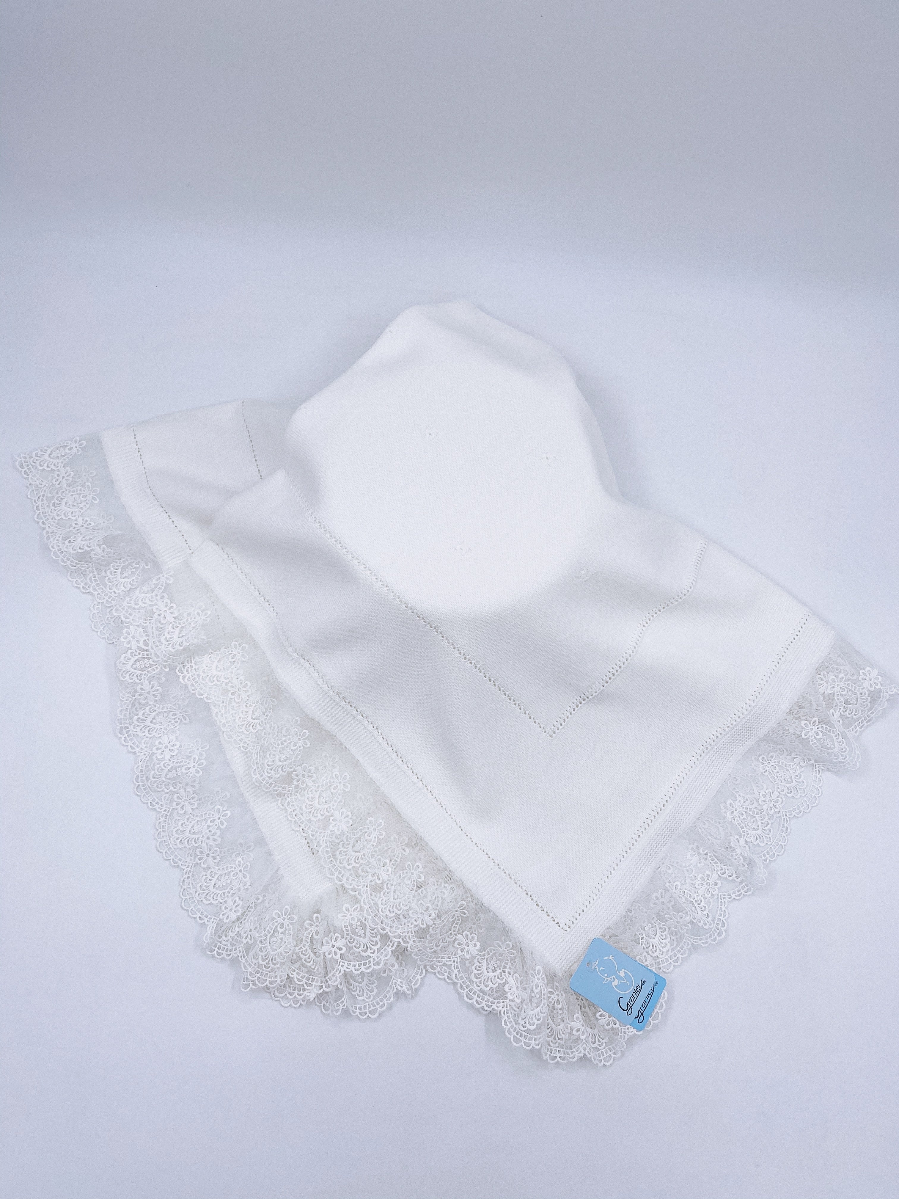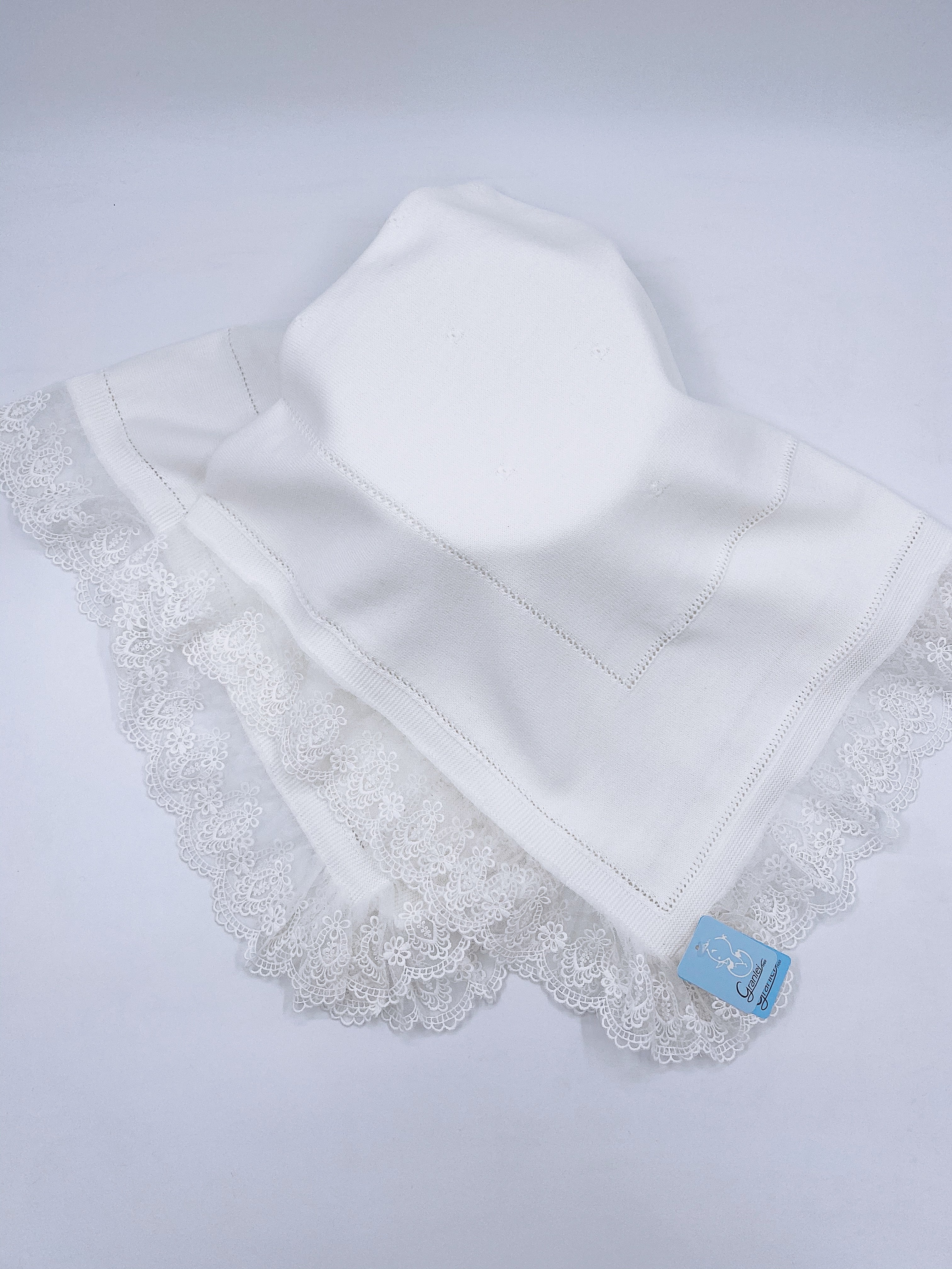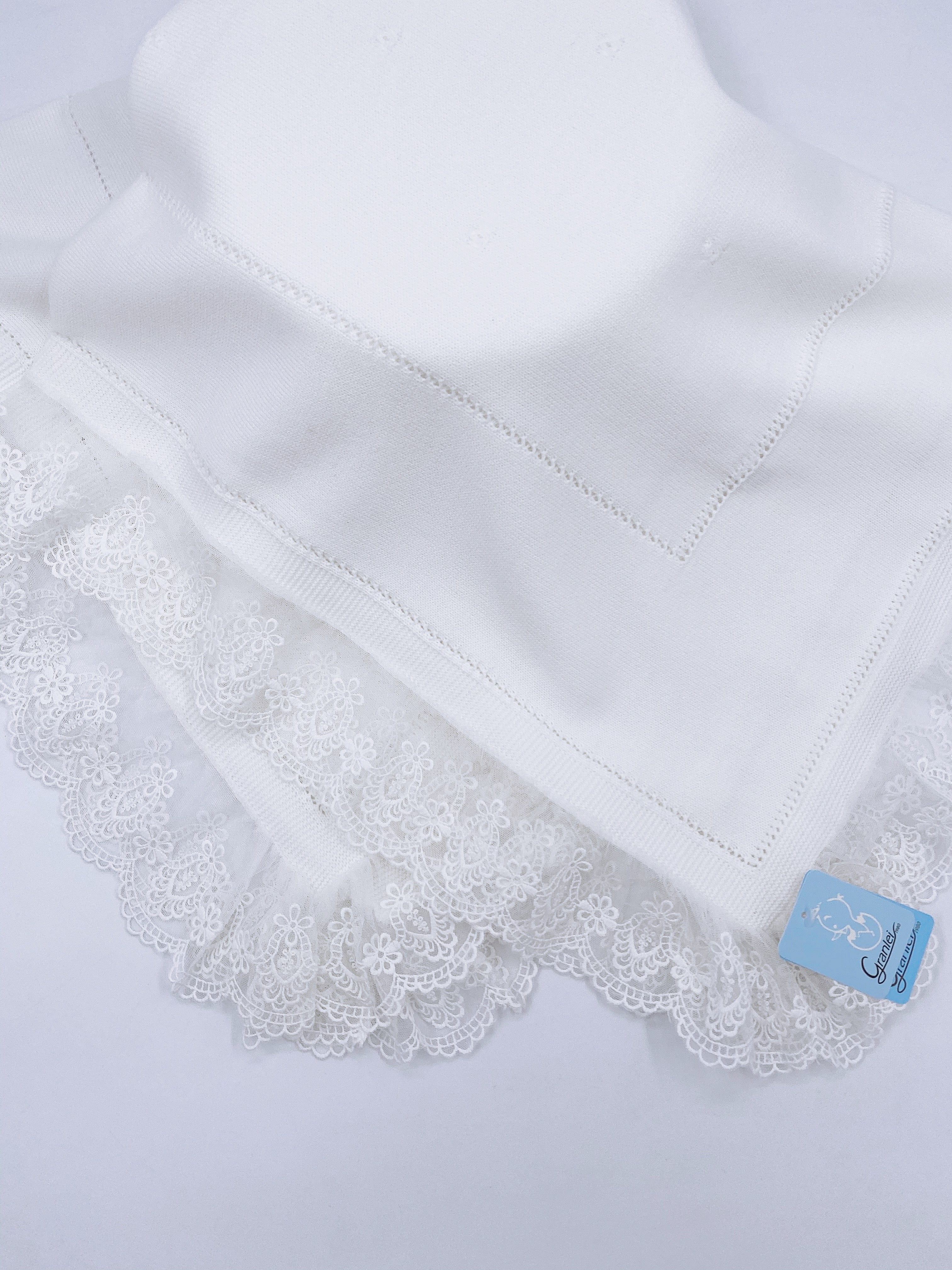 Beautiful Ivory knitted blanket with lace trim(98cm)
