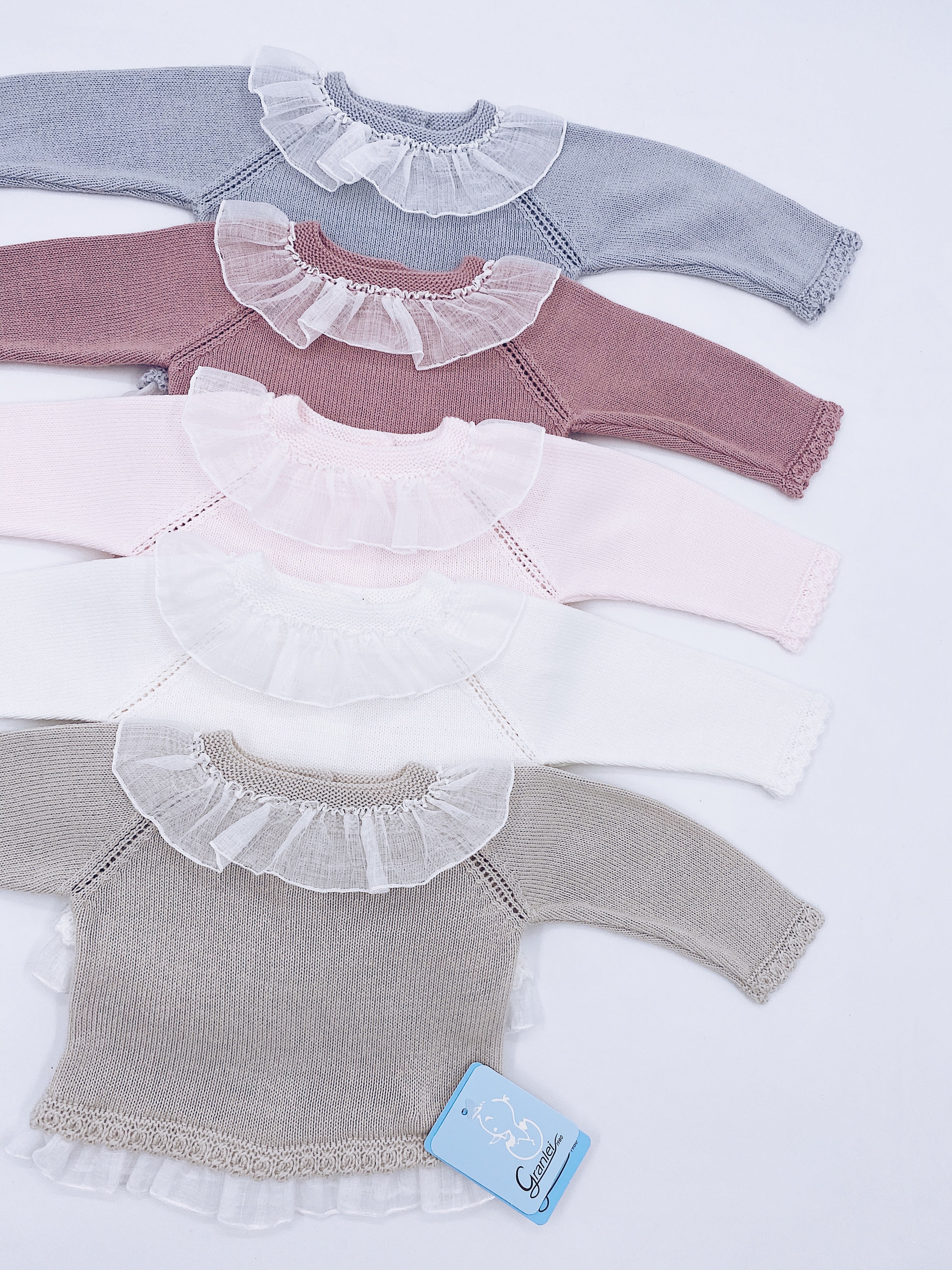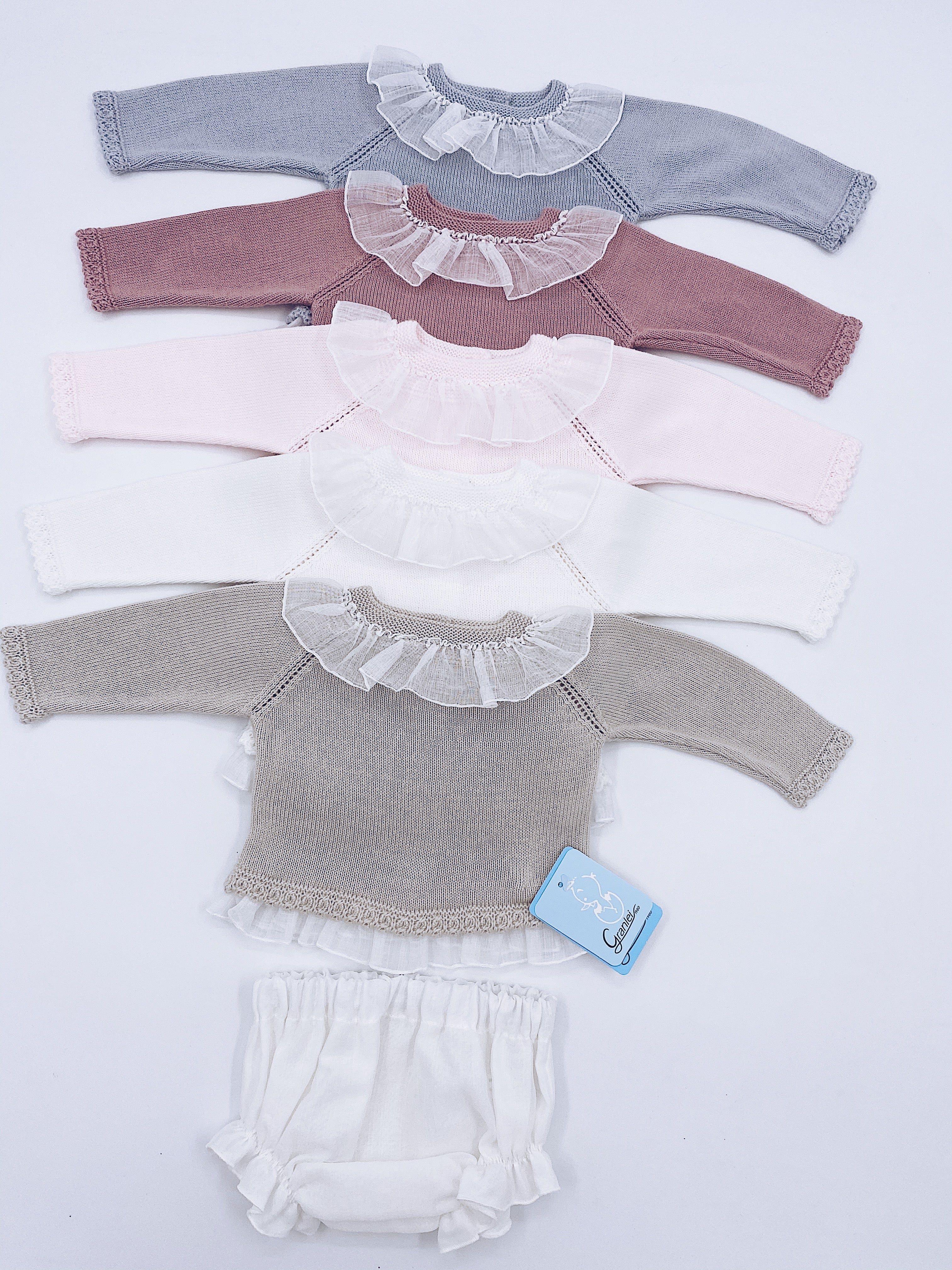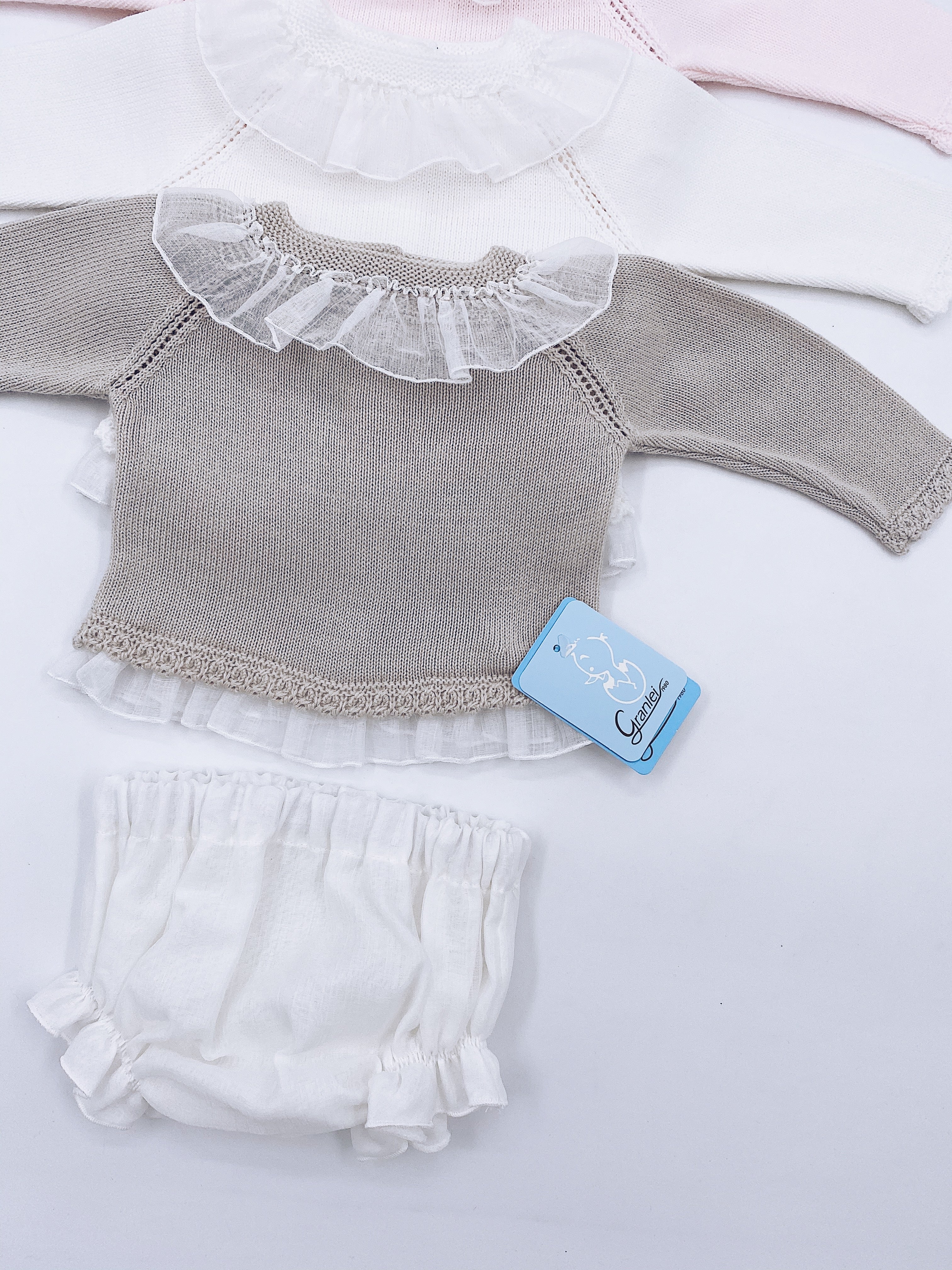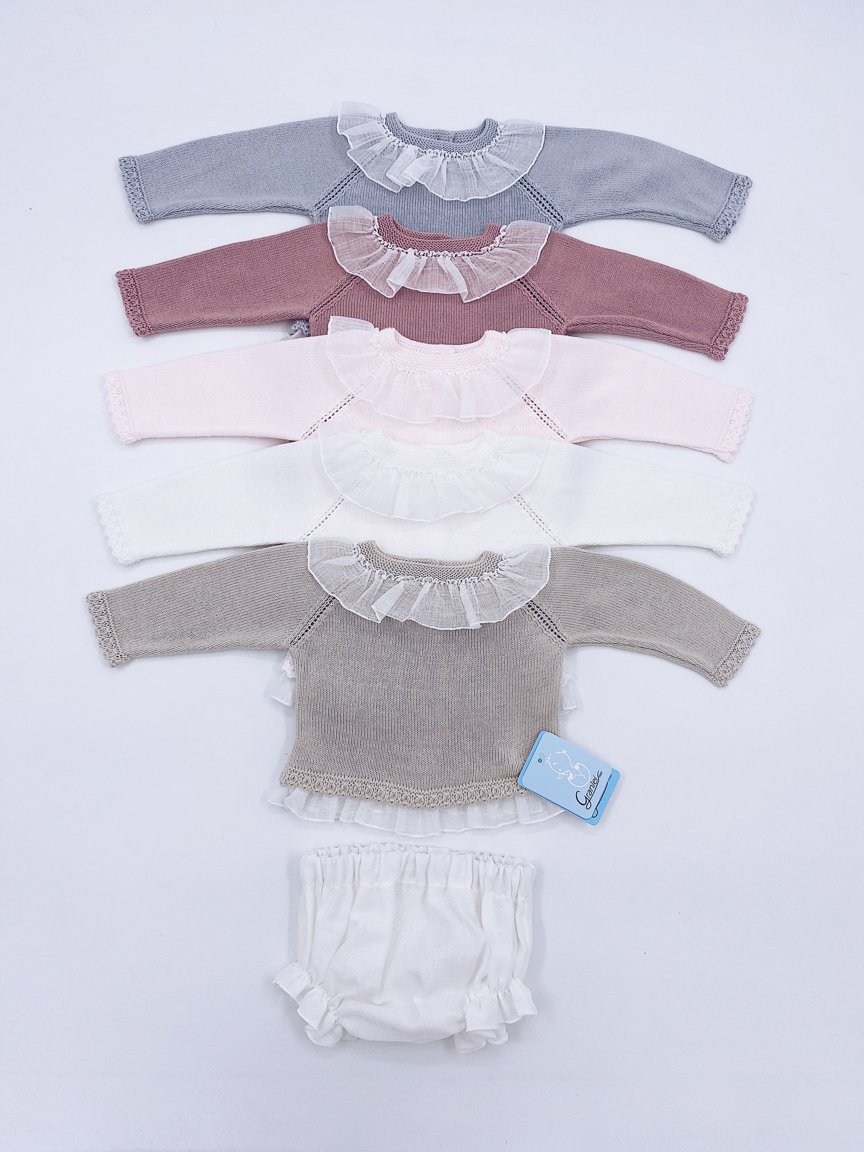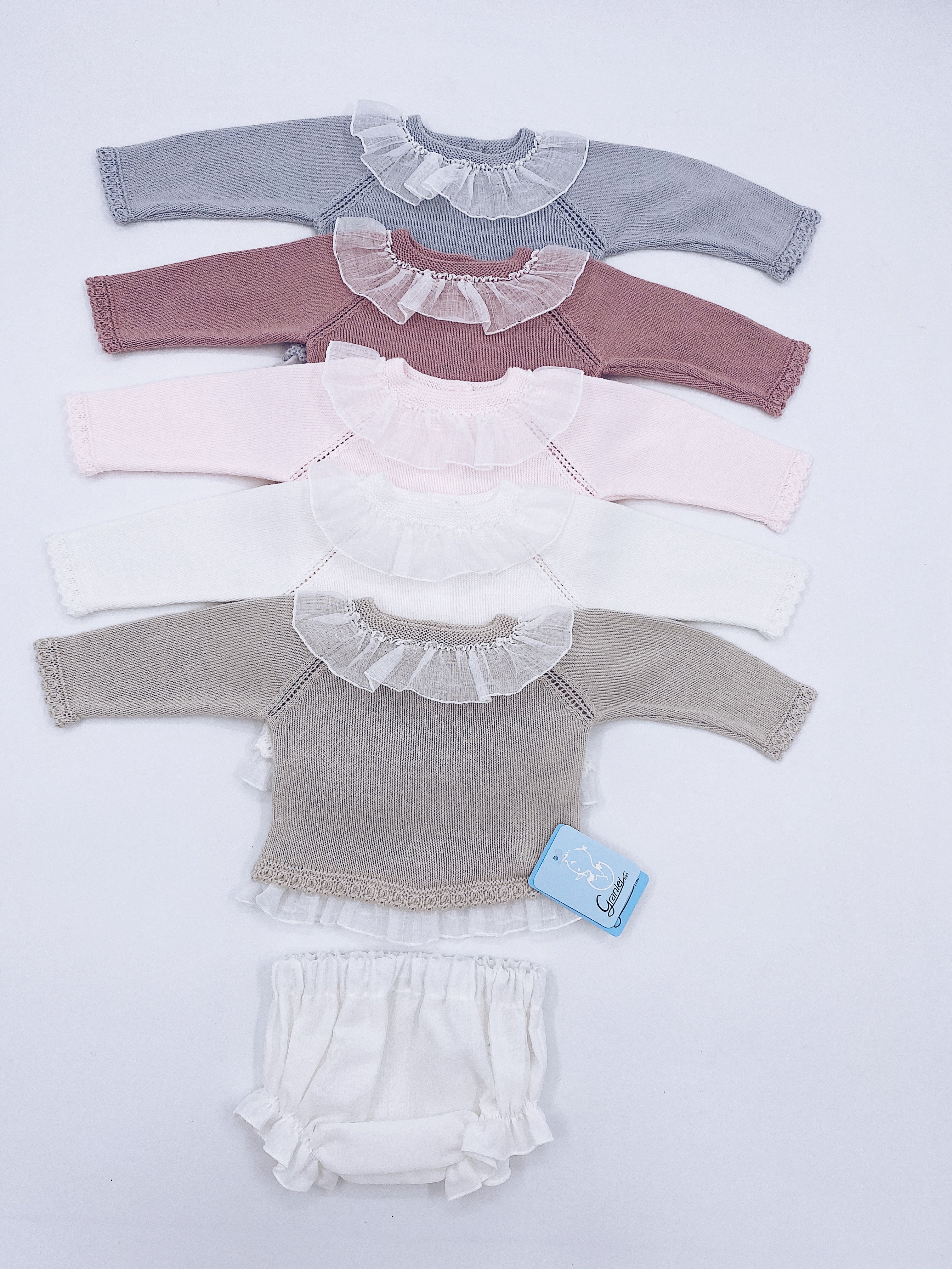 Beautiful knitted jumper with frilly collar details and ivory shorts 2 piece set .
