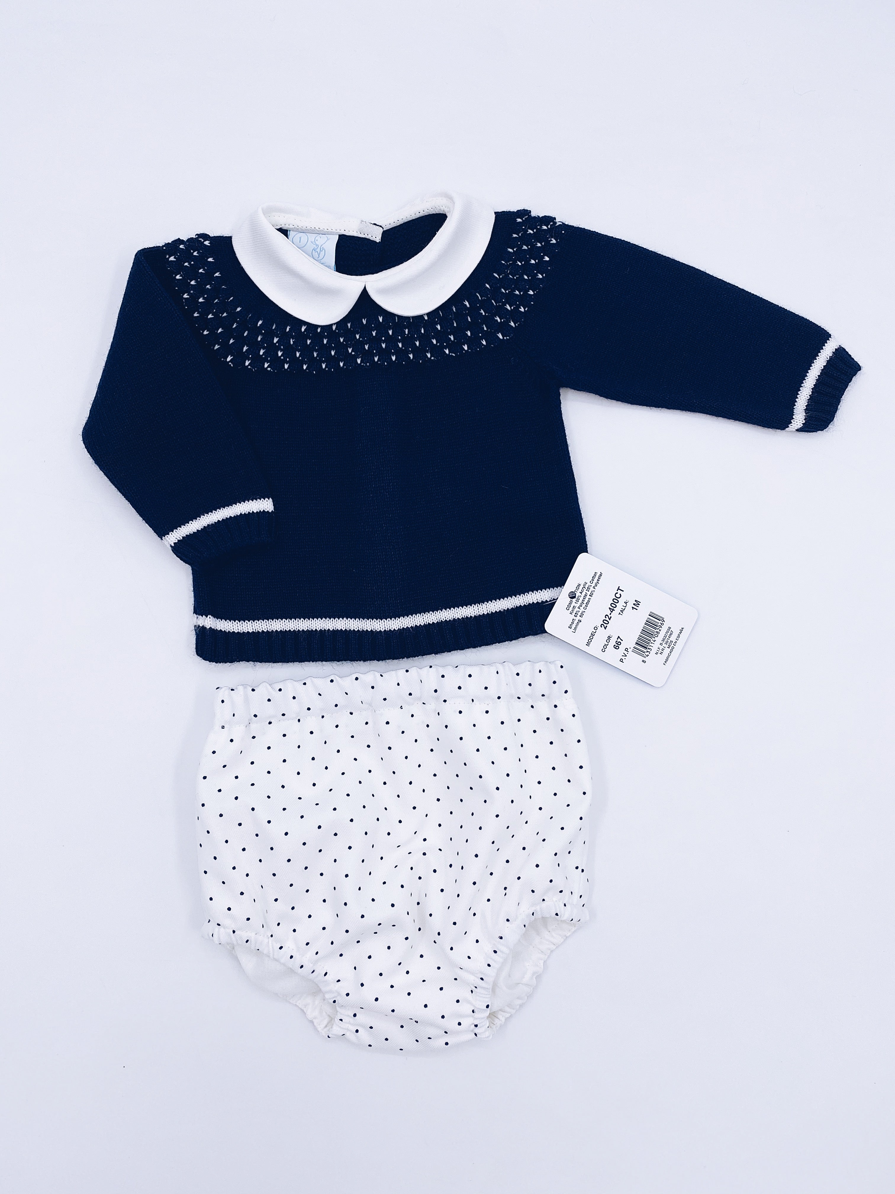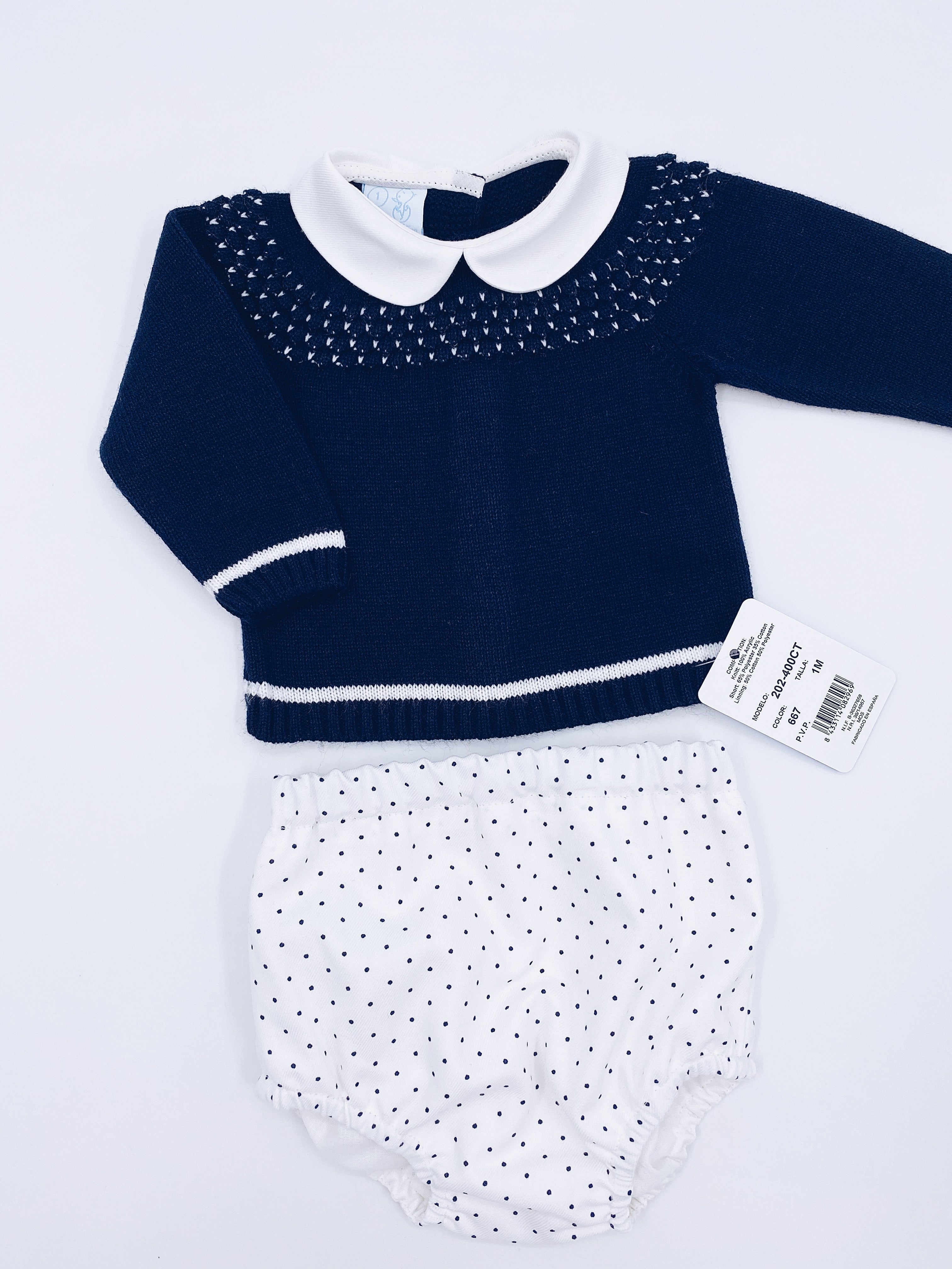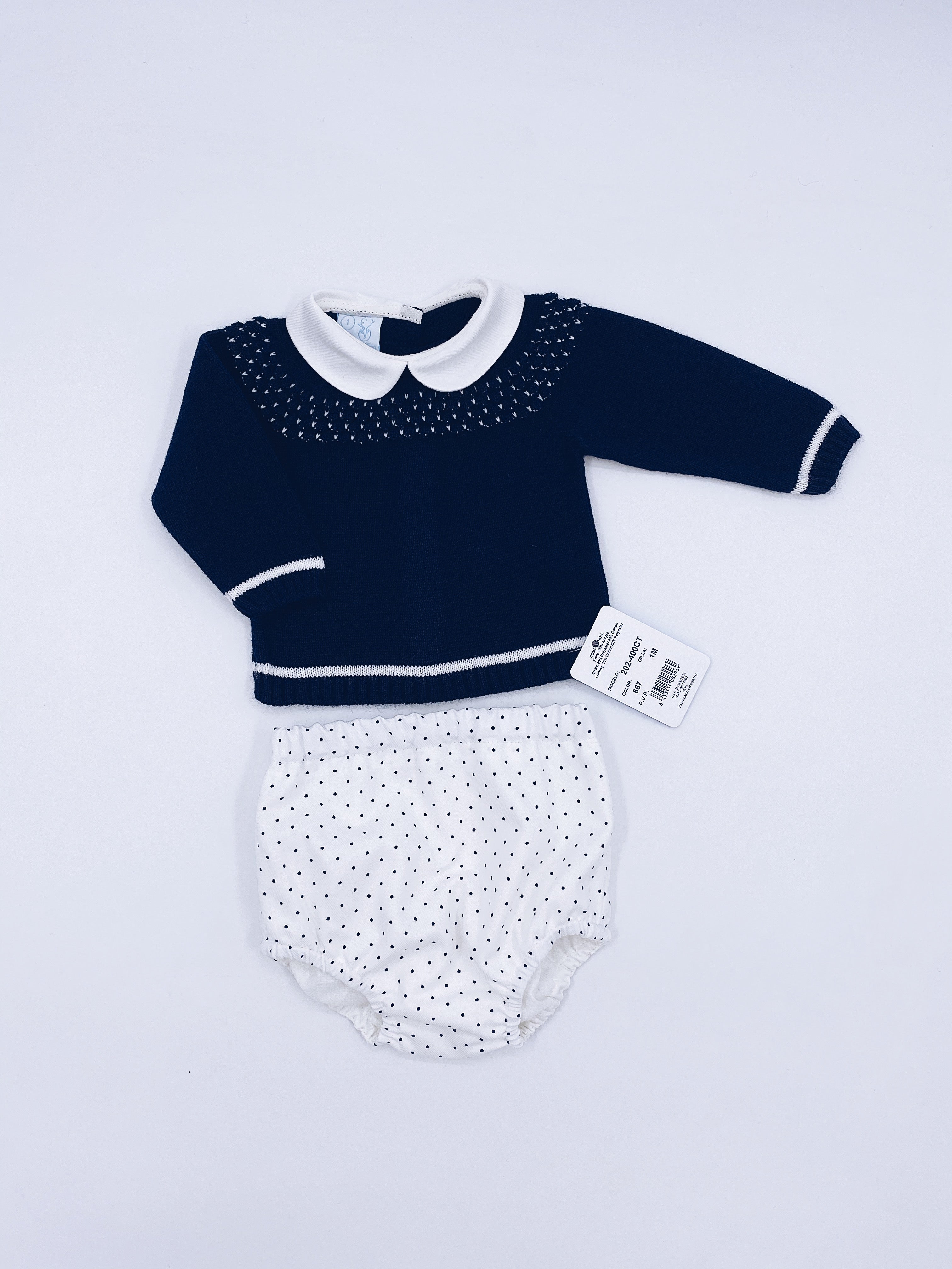 Beautiful Navy knitted jumper with Peter Pan collar and white shorts set for baby boy.