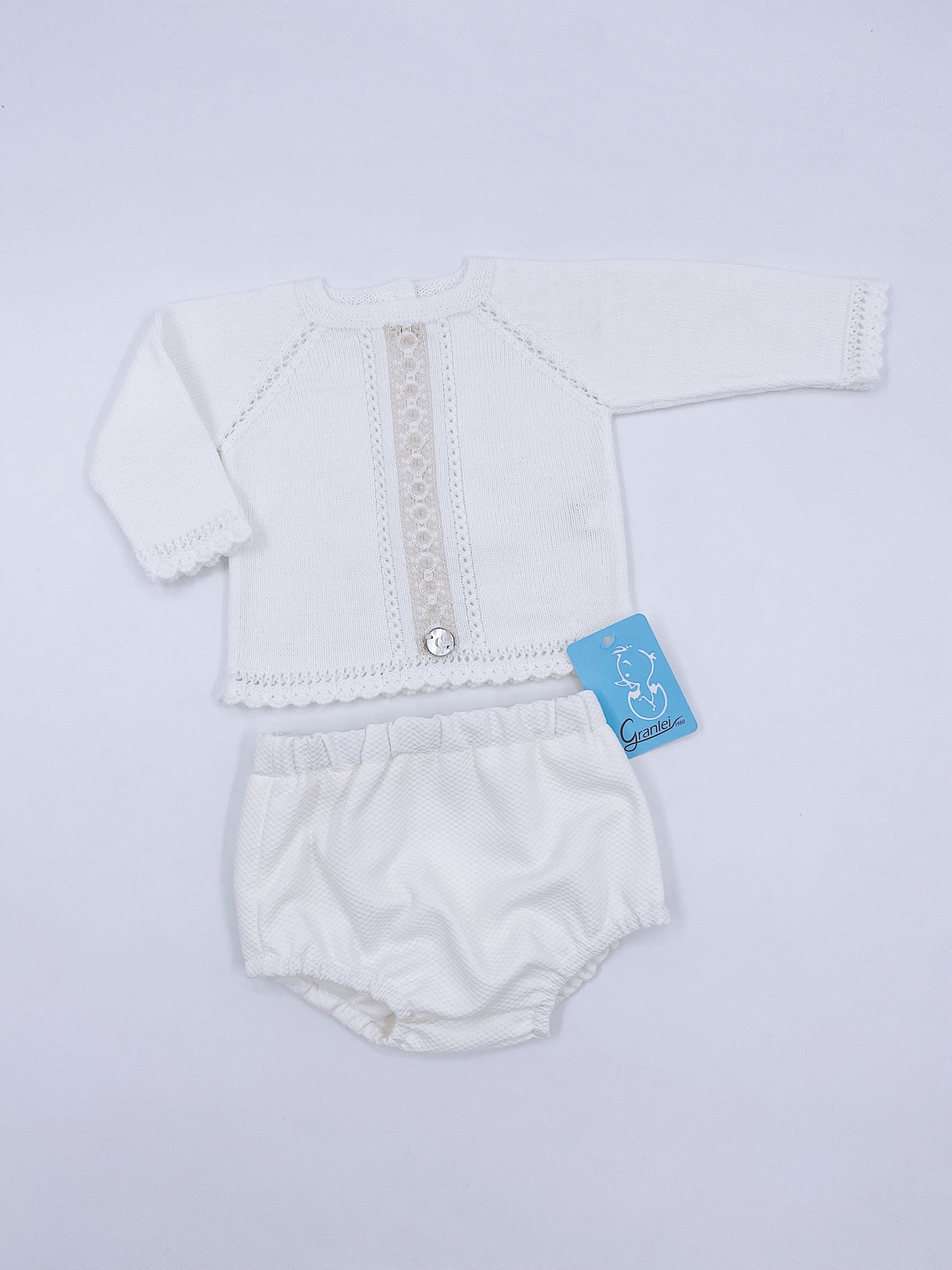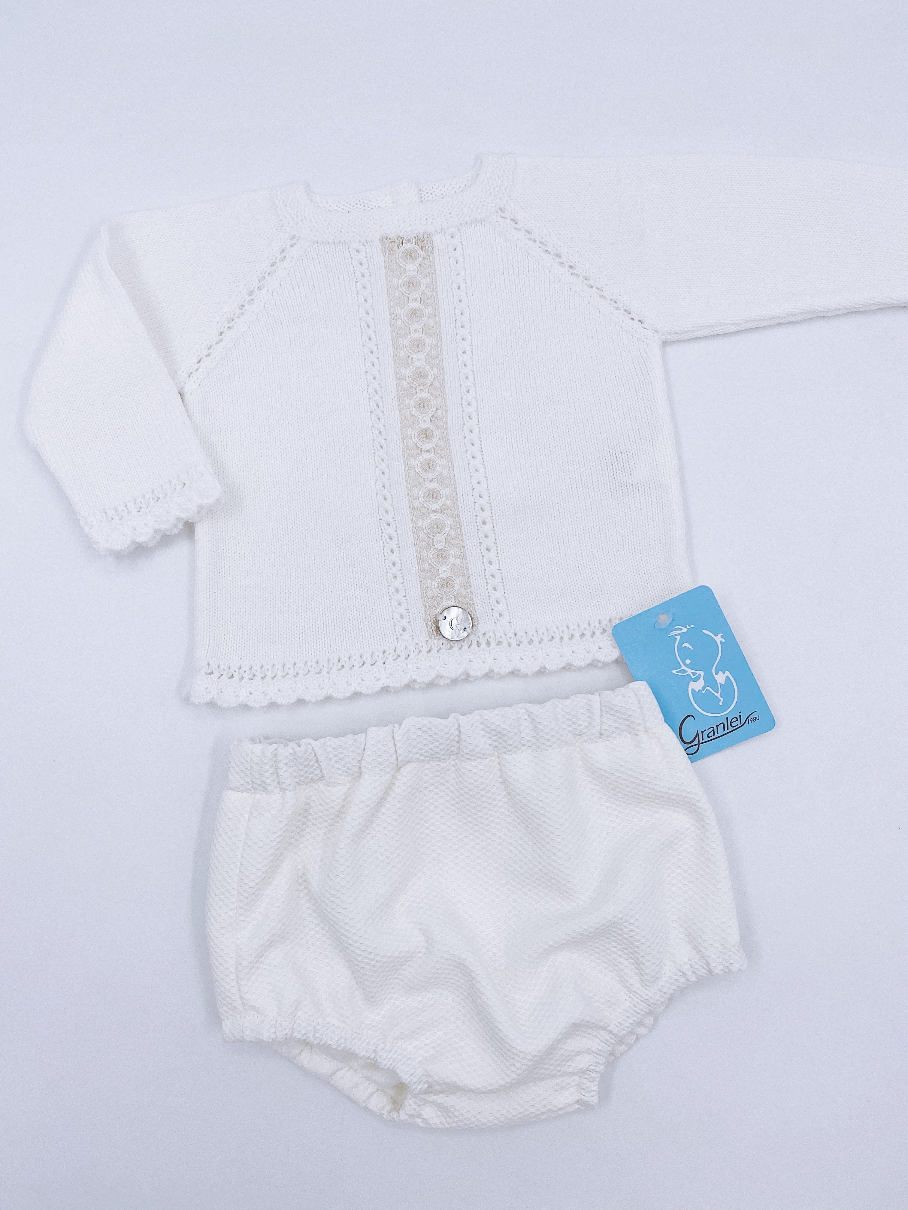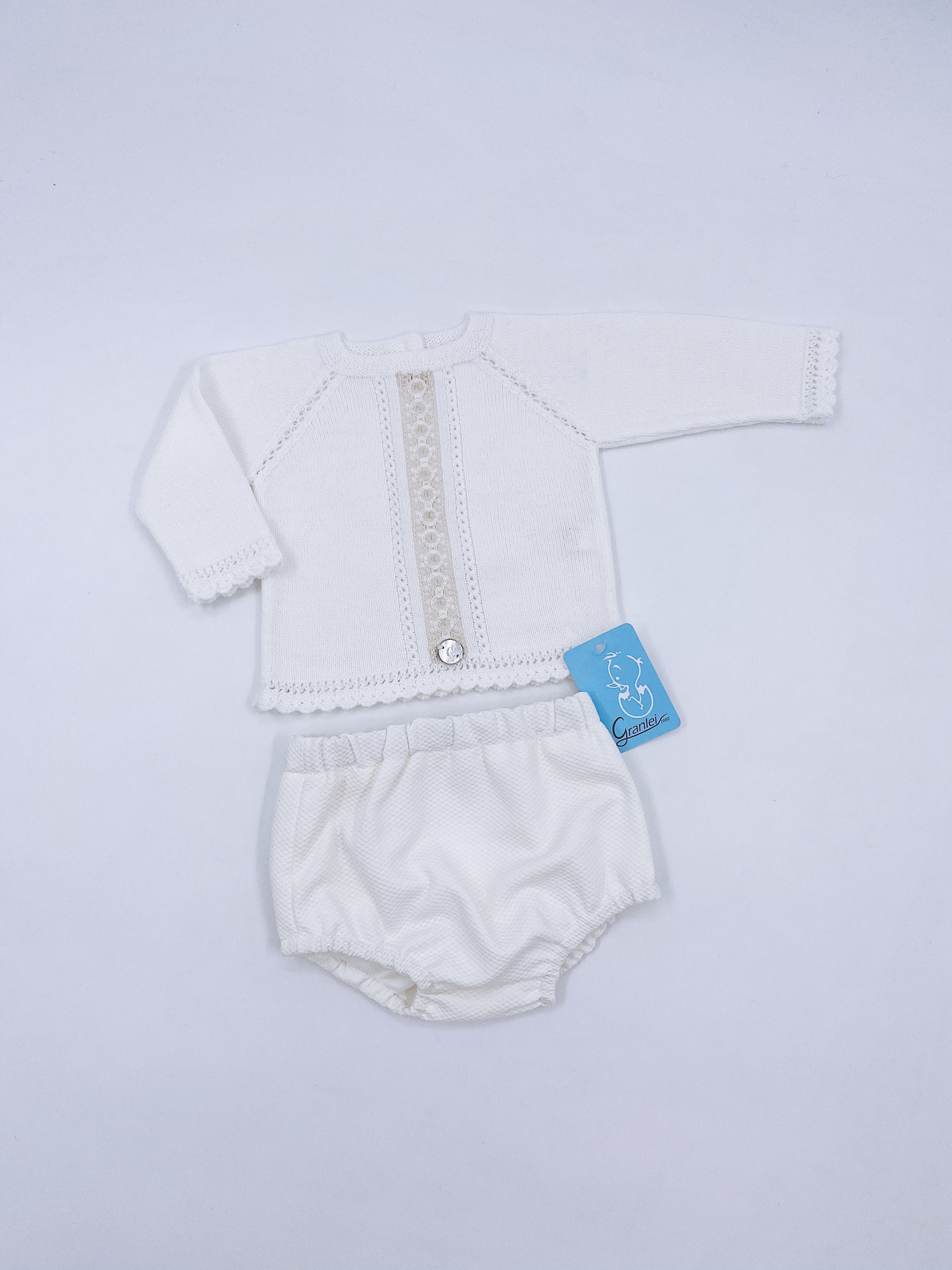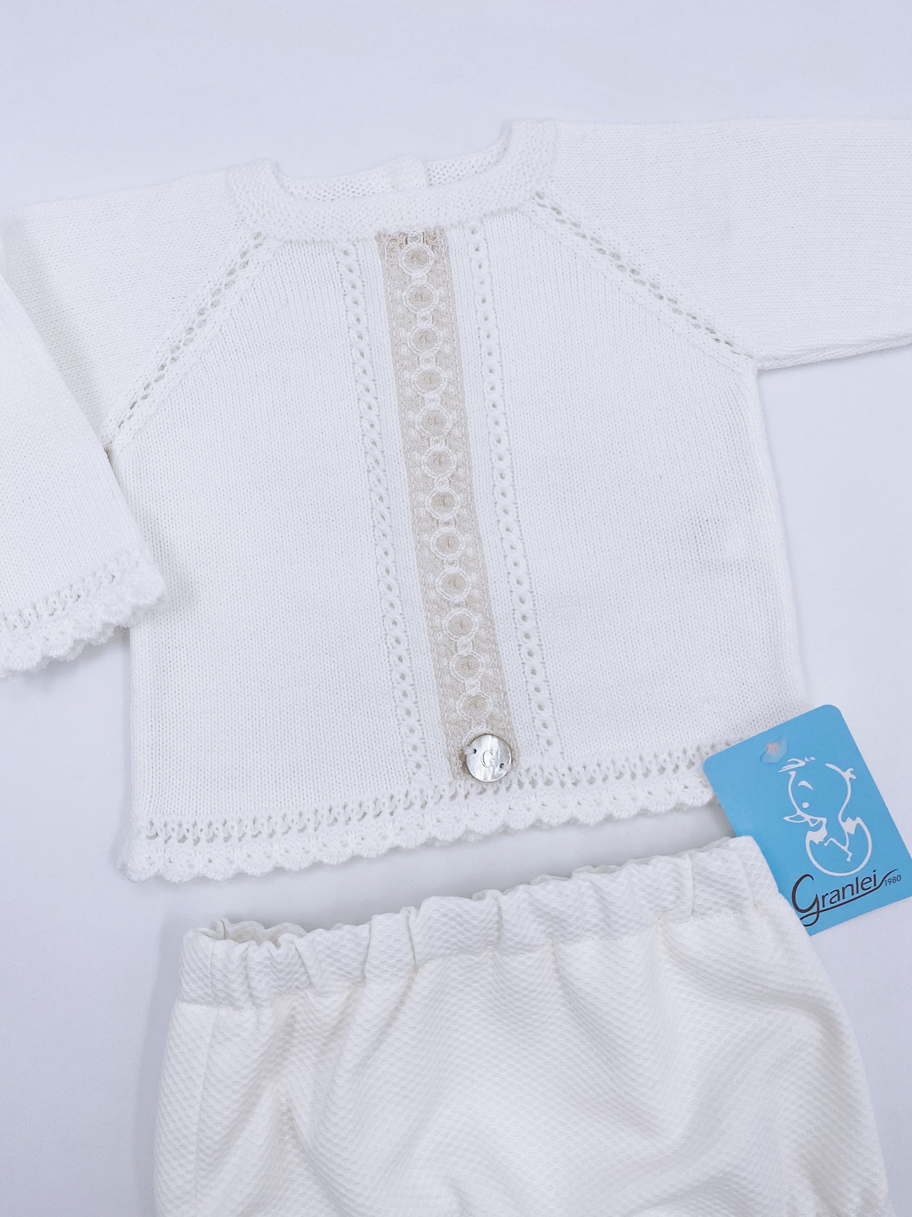 Beautiful Unisex Ivory Knitted jumper and shorts 2 piece set.
