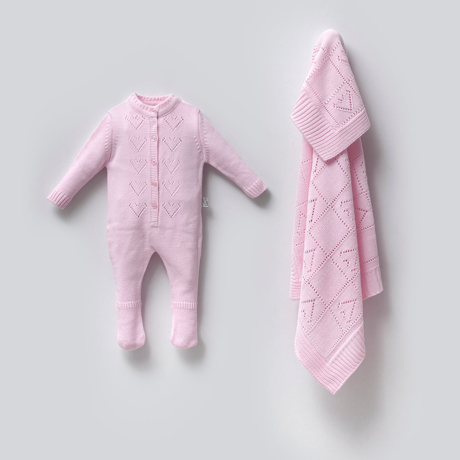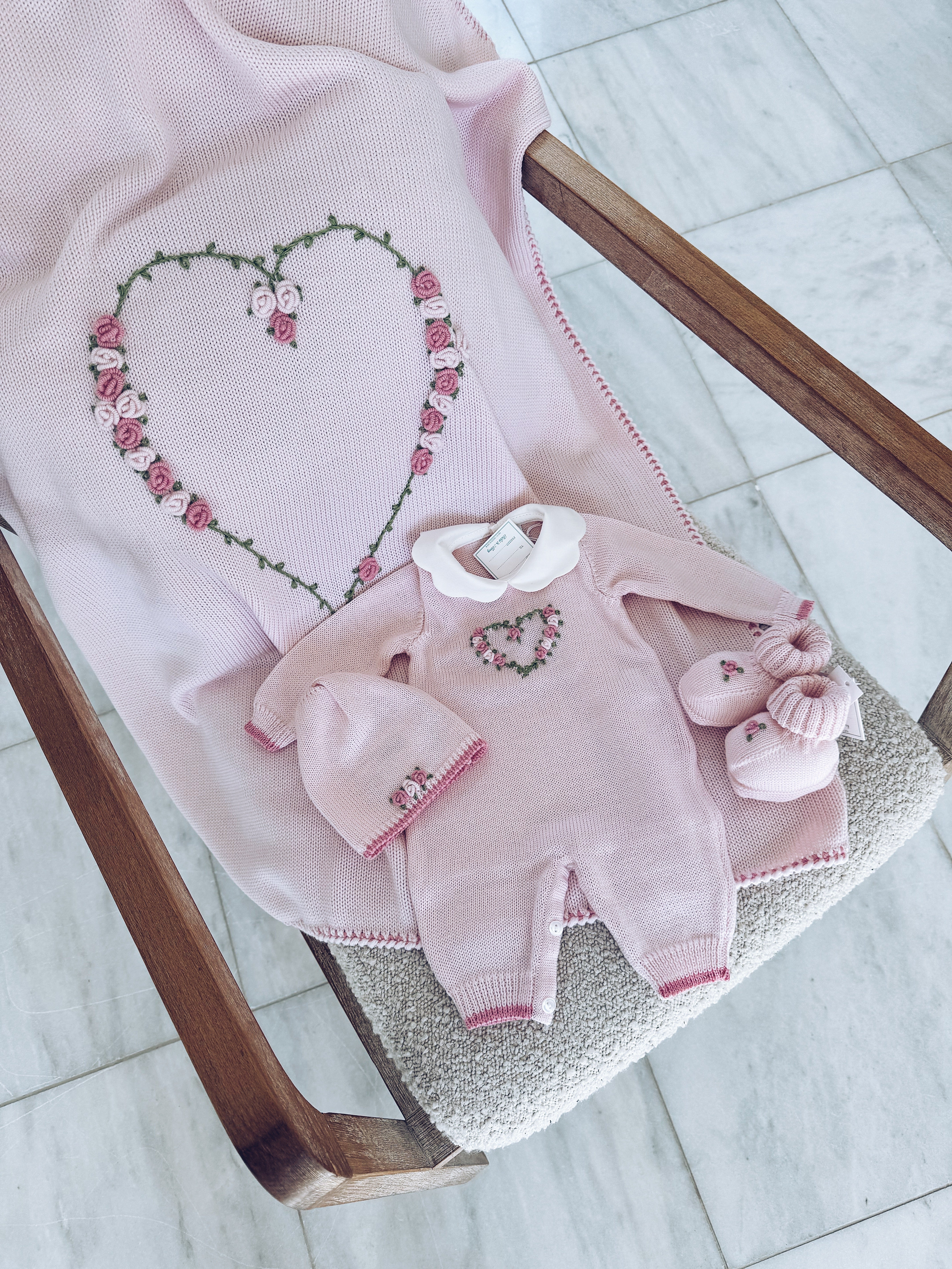 MI LOVES SIGNATURE Beautiful Baby Pink 5 piece Hospital/Coming home set with Hand Embroidery and frill details(including Blanket/Romper/Mittens/Booties/Hat)