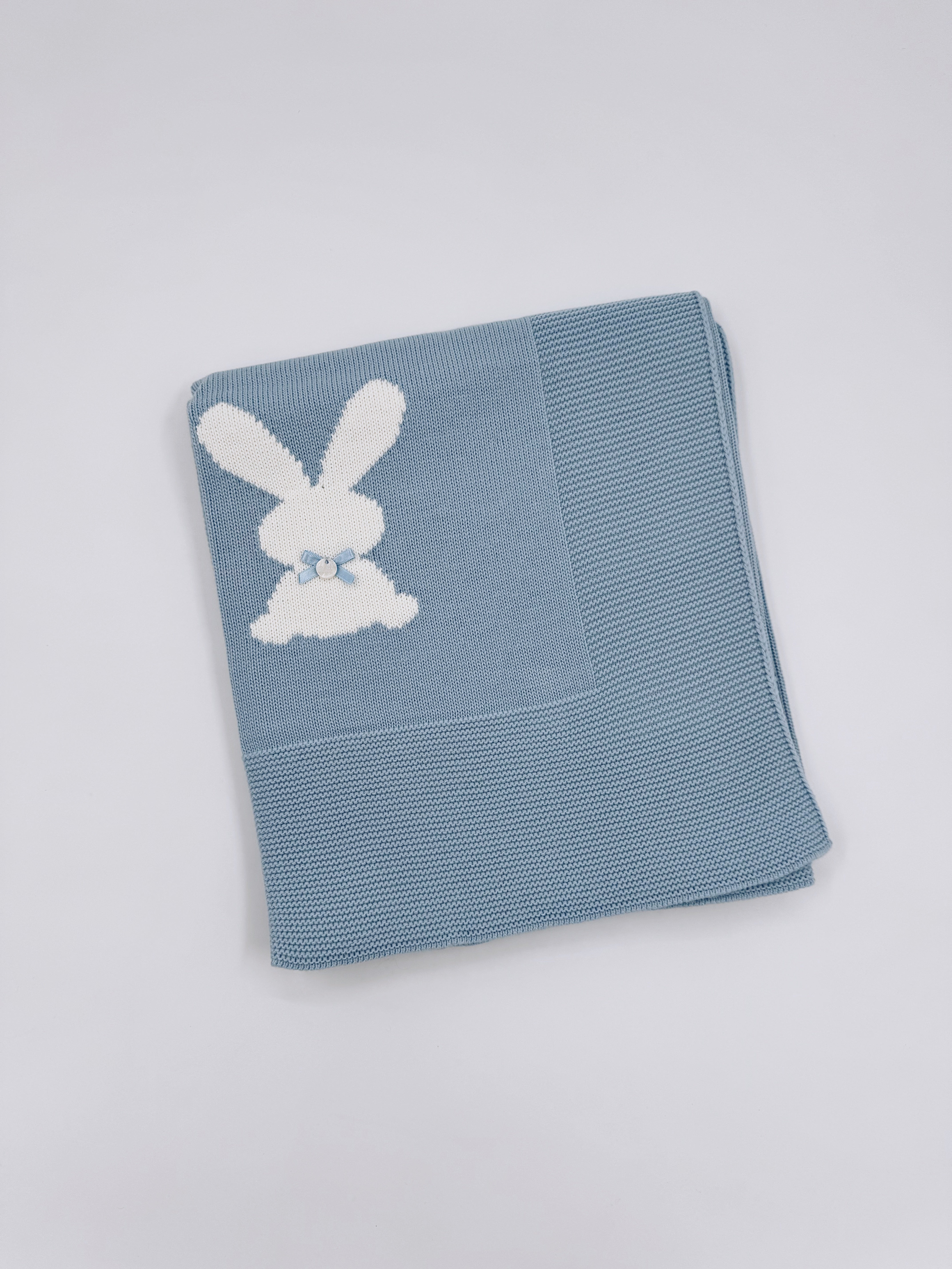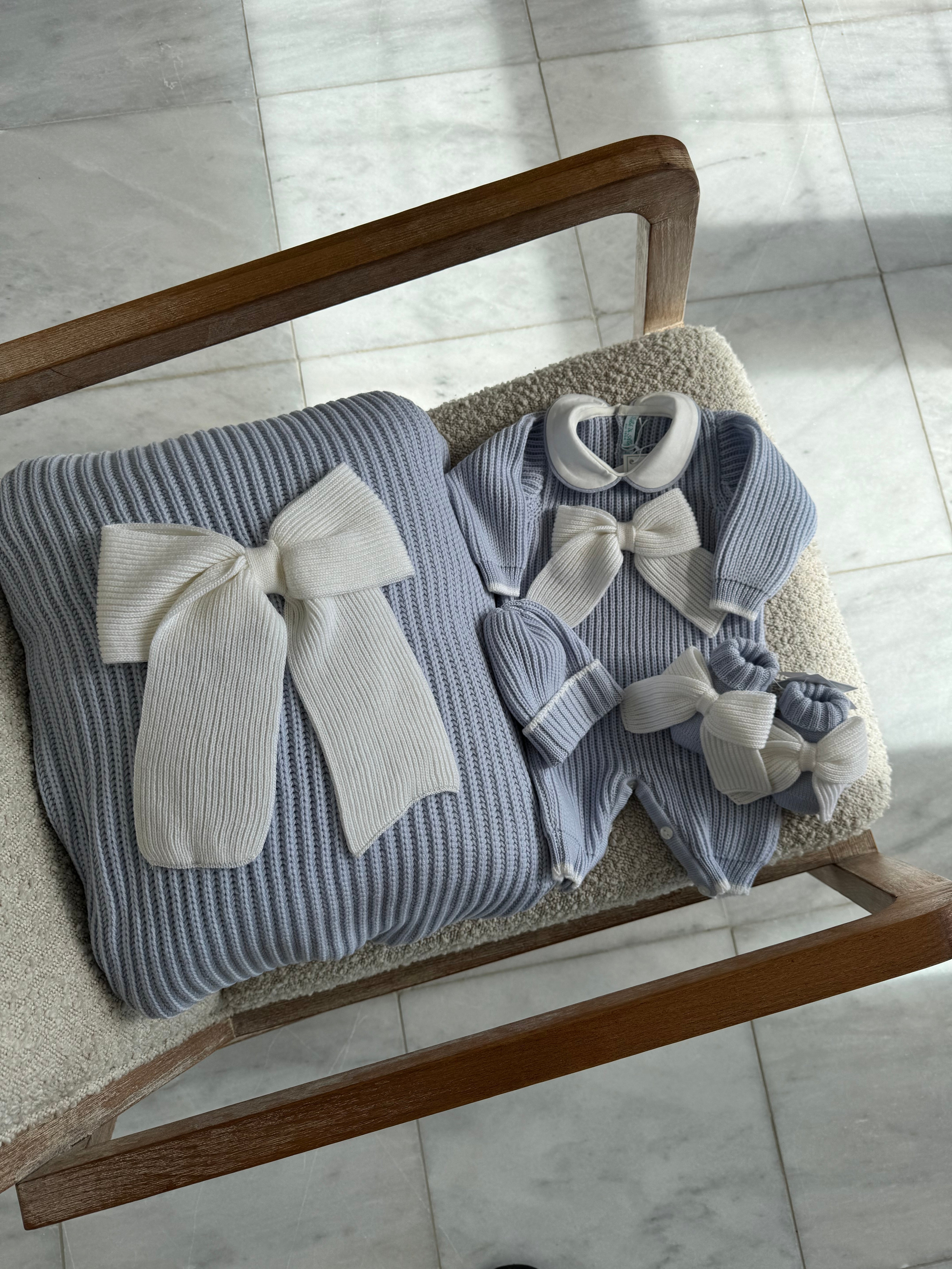 Beautiful Knitted Merino Wool Blue Baby Blanket with Bow details.
