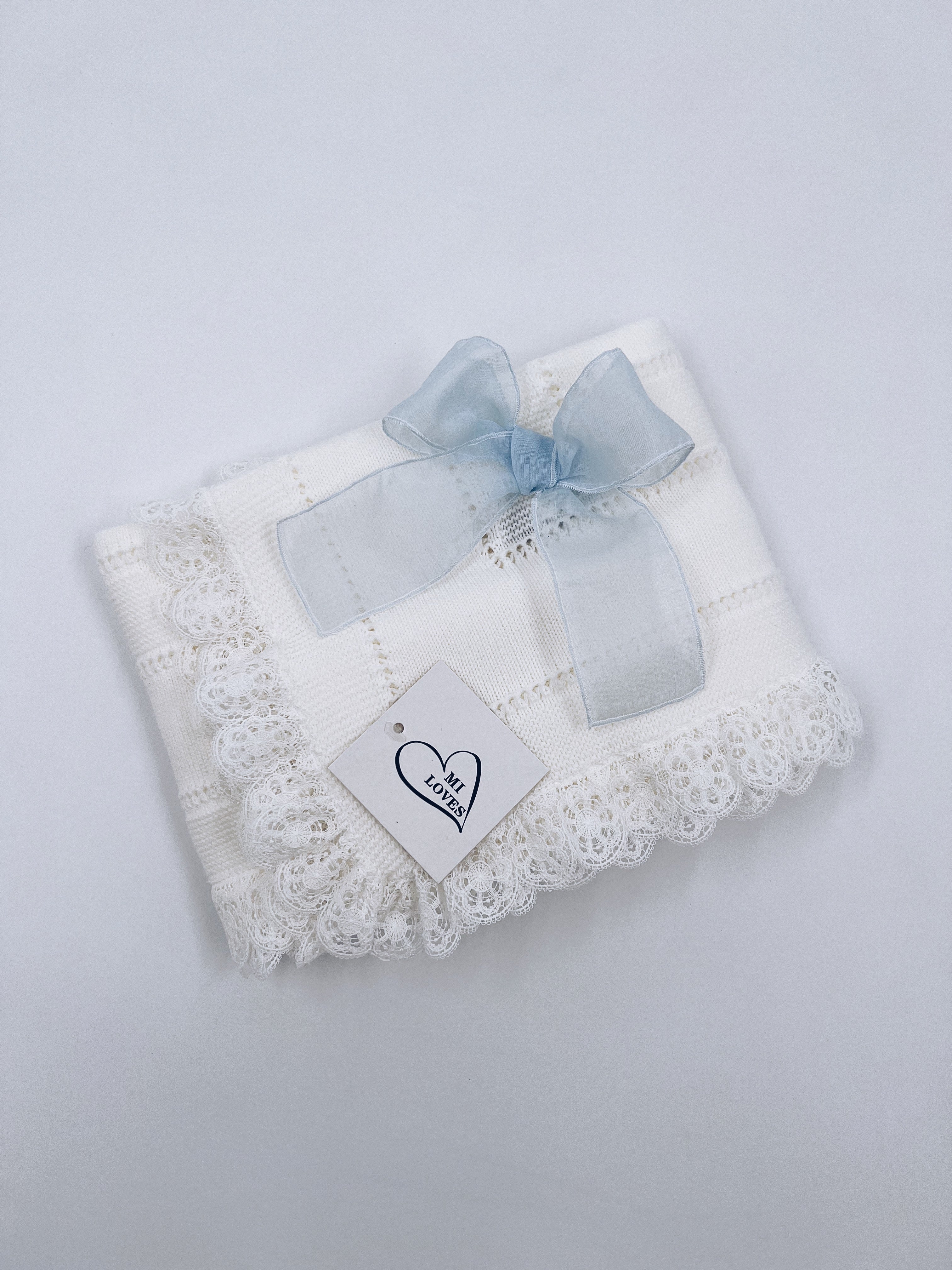 Beautiful Ivory knitted blanket with Dusty Blue bow and lace trim(98cm).Suitable for boys and girls.
