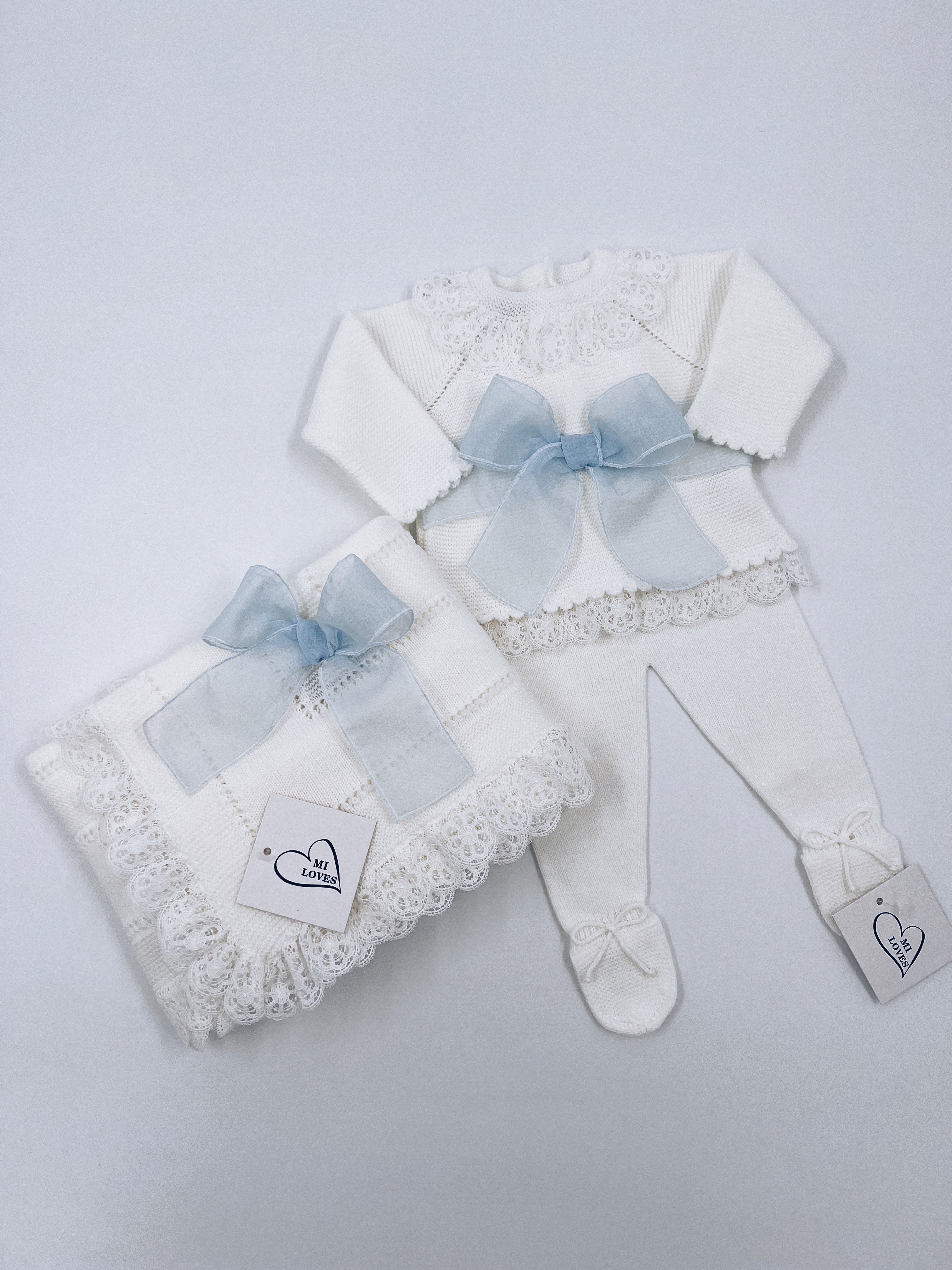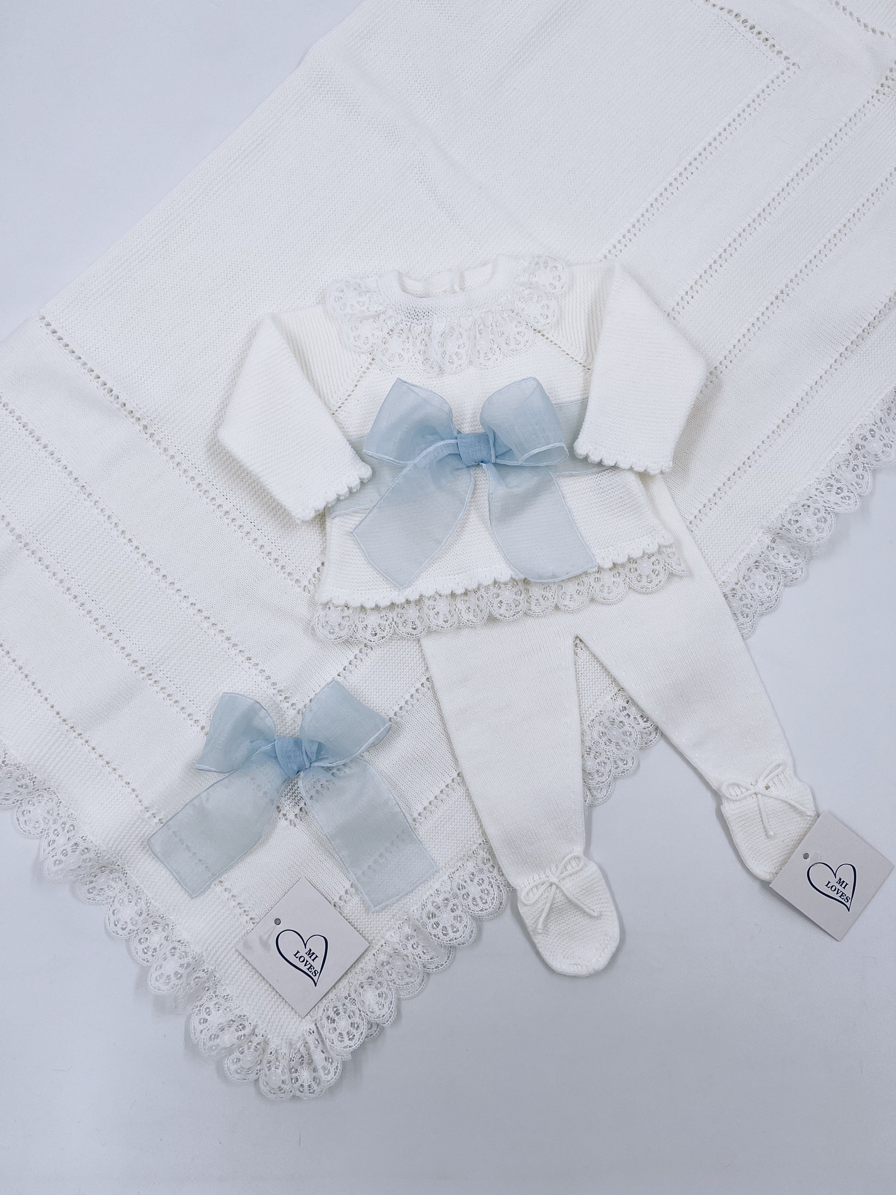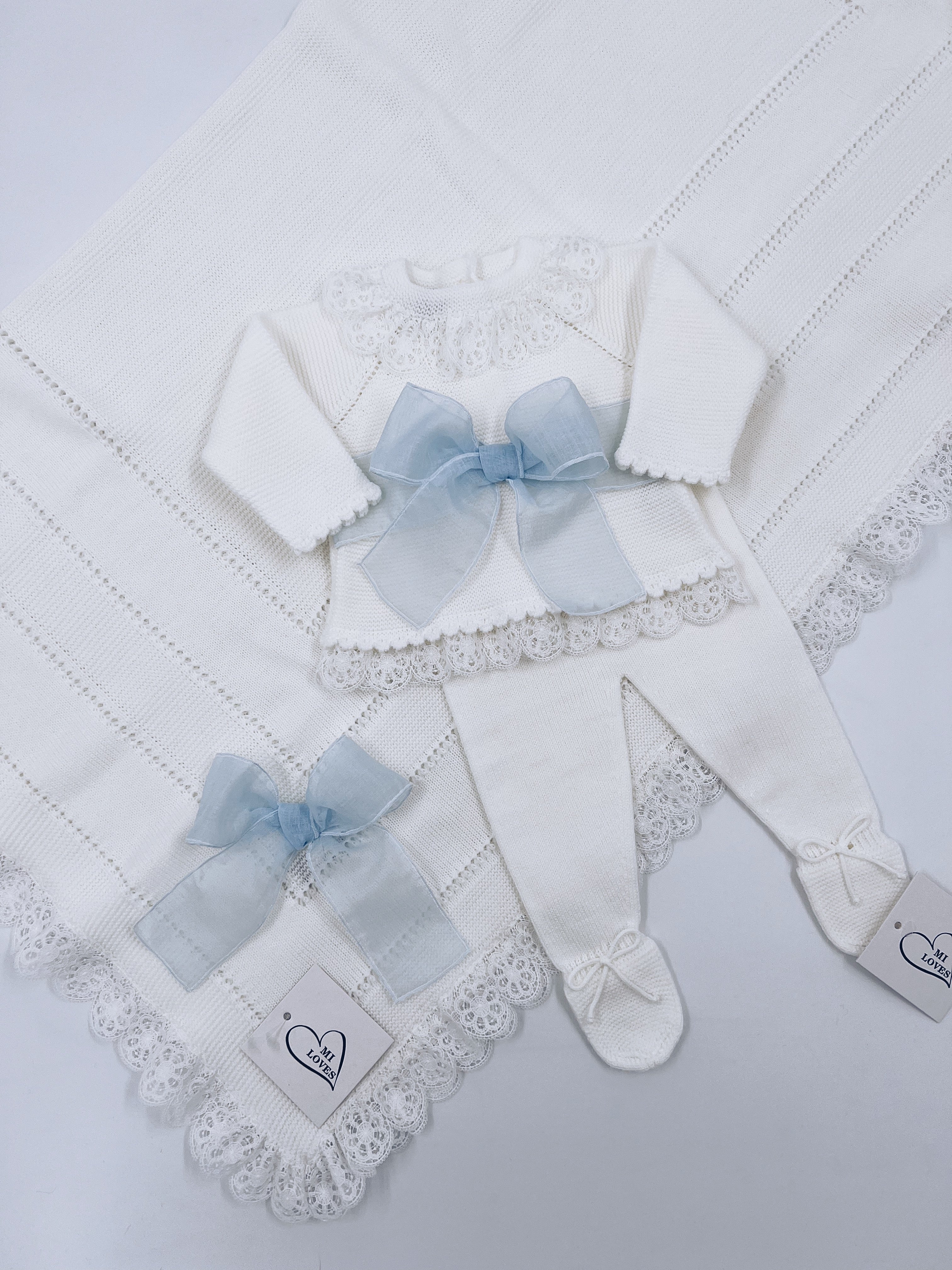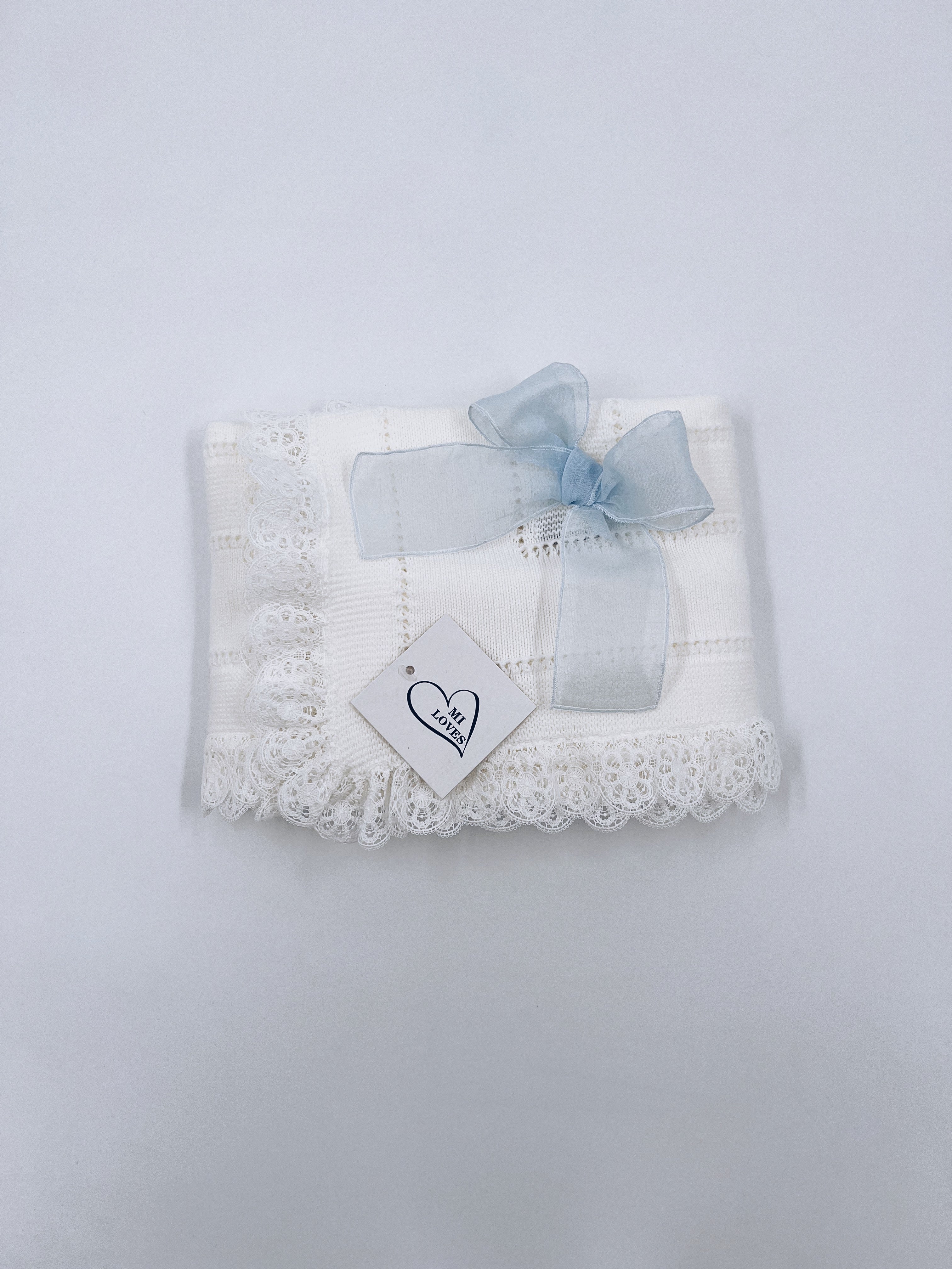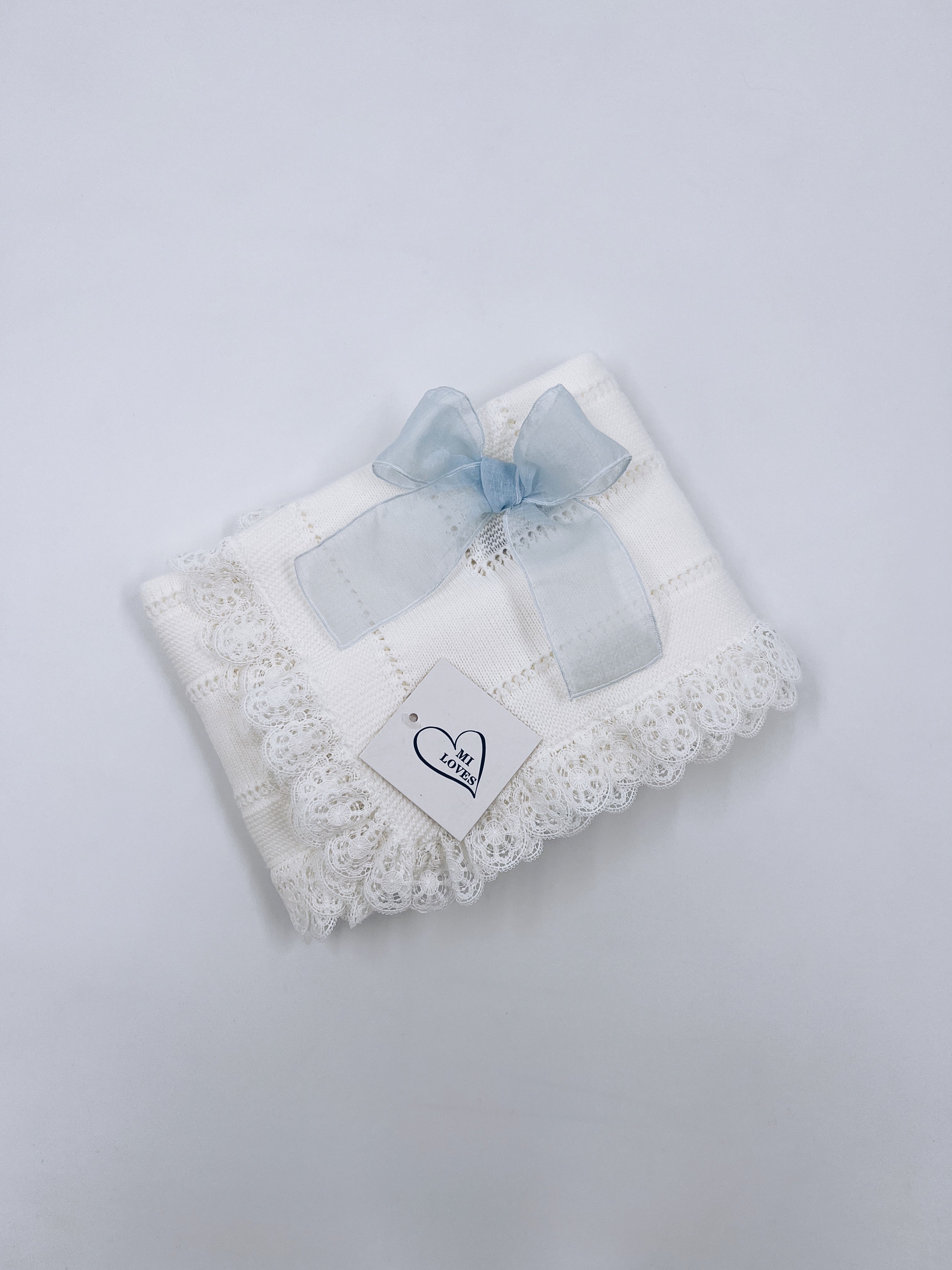 Beautiful Ivory knitted blanket with Dusty Blue bow and lace trim(98cm).Suitable for boys and girls.