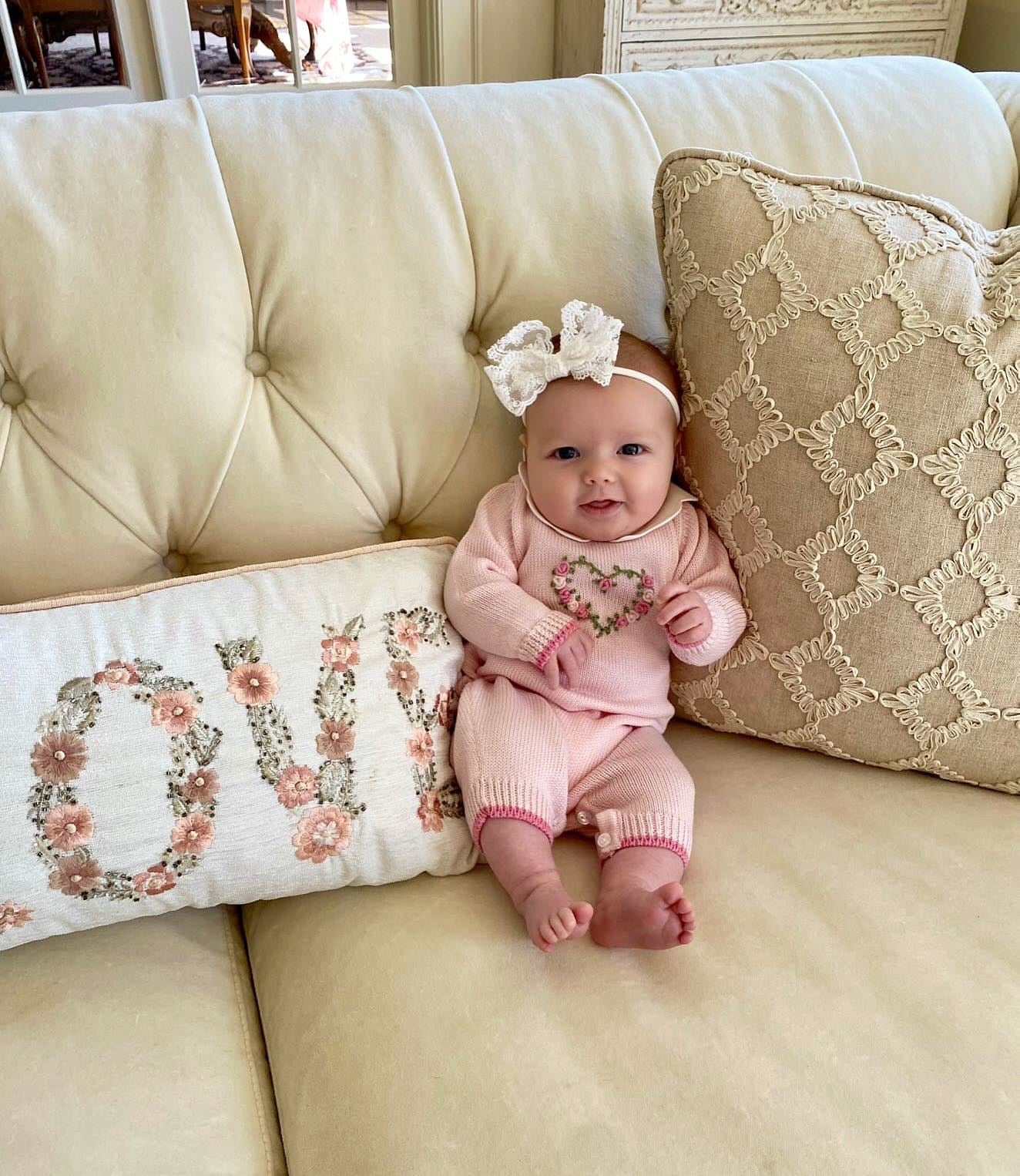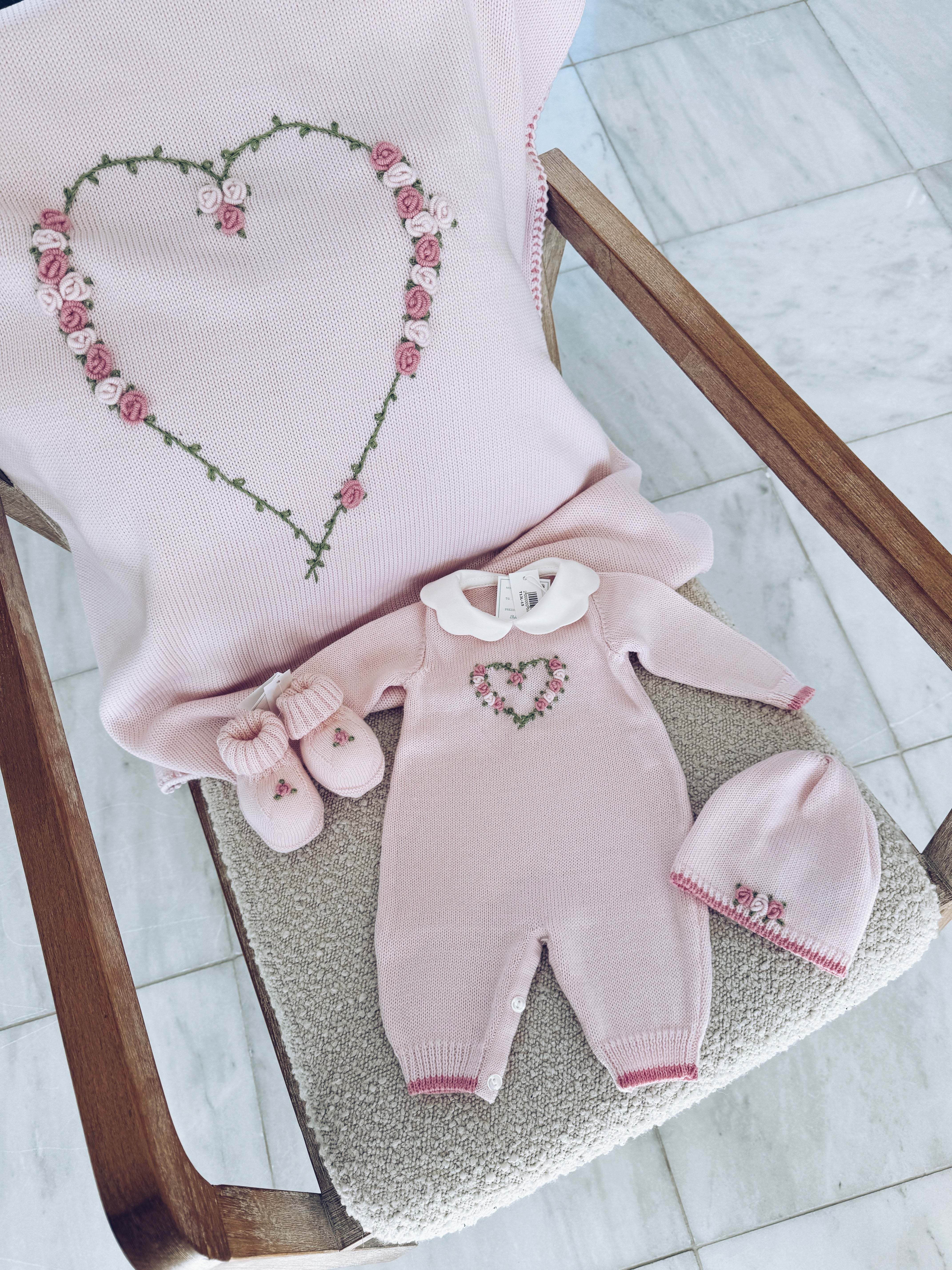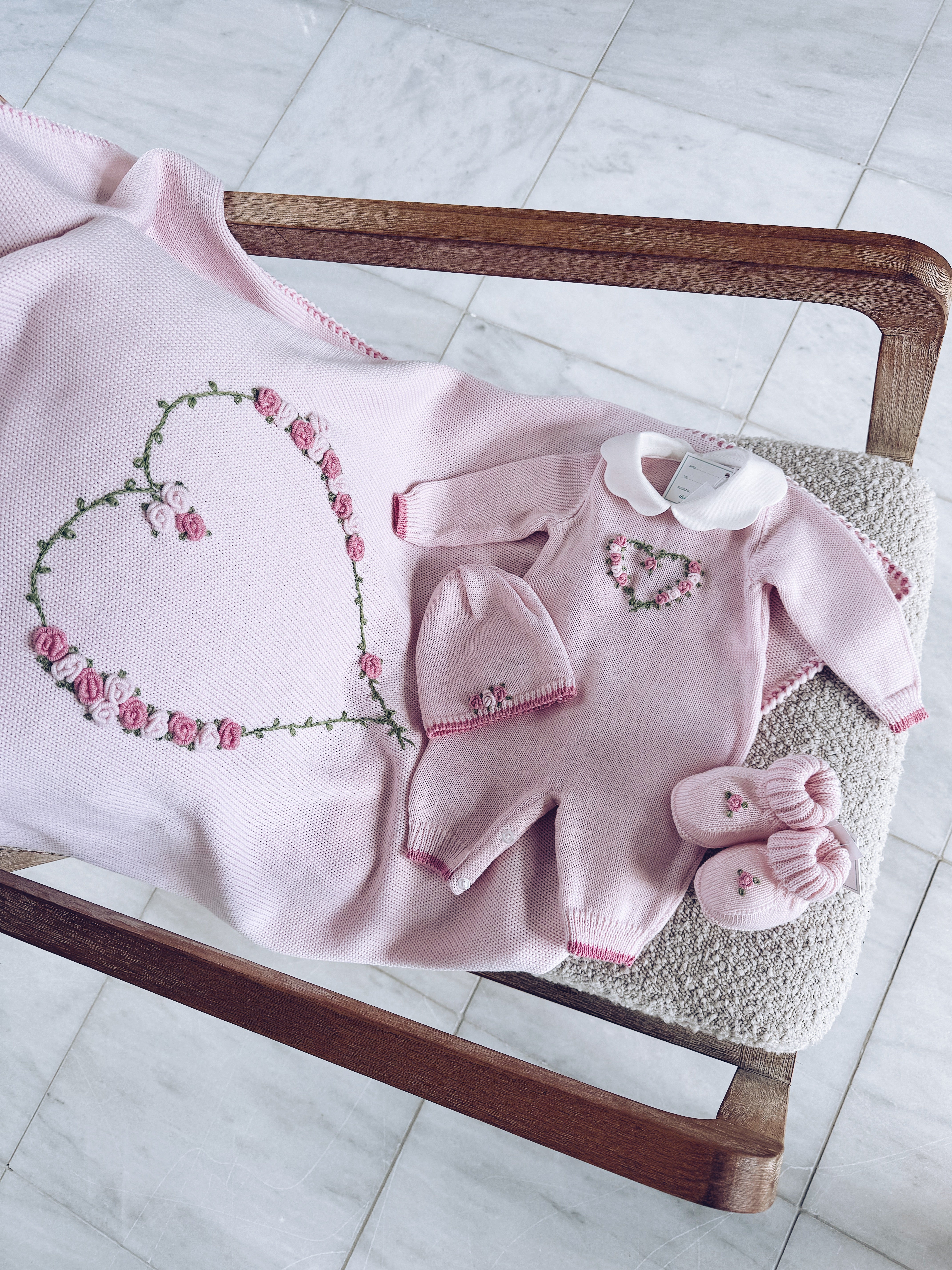 Beautiful Knitted Merino Wool Baby Girl Blanket with hand embroidery flower details.