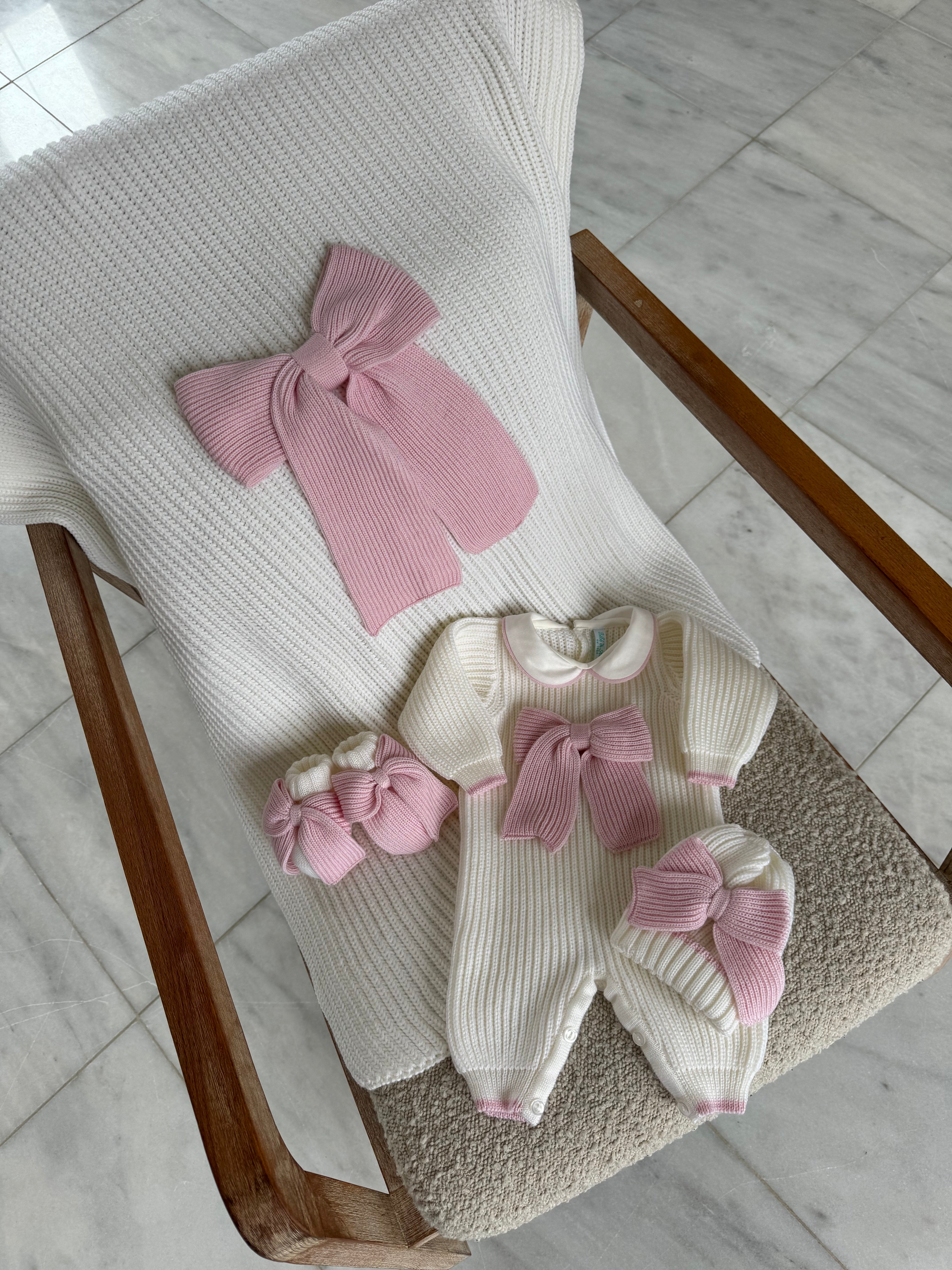 Beautiful Knitted Merino Wool Ivory/White Baby Blanket with Bow details