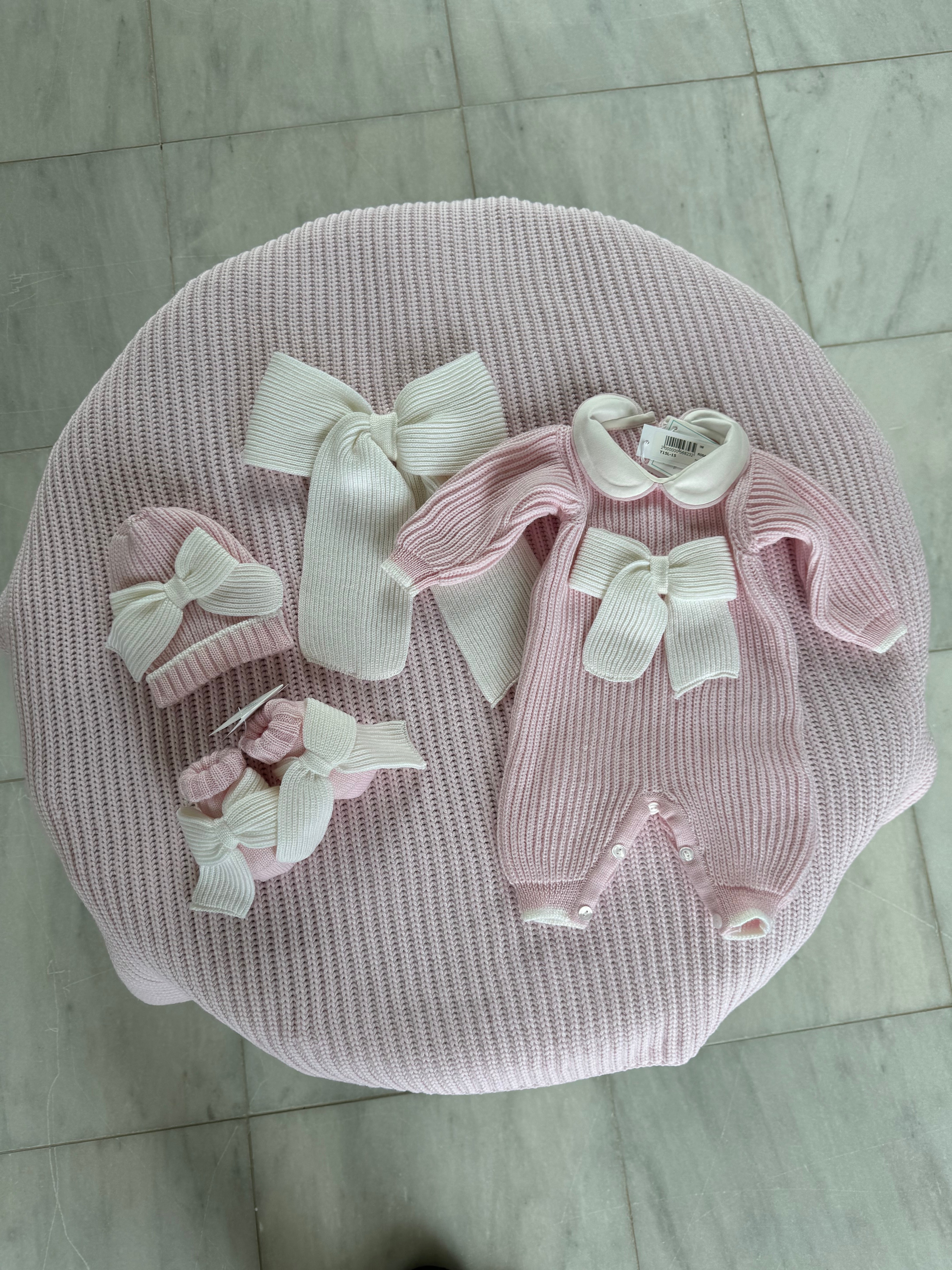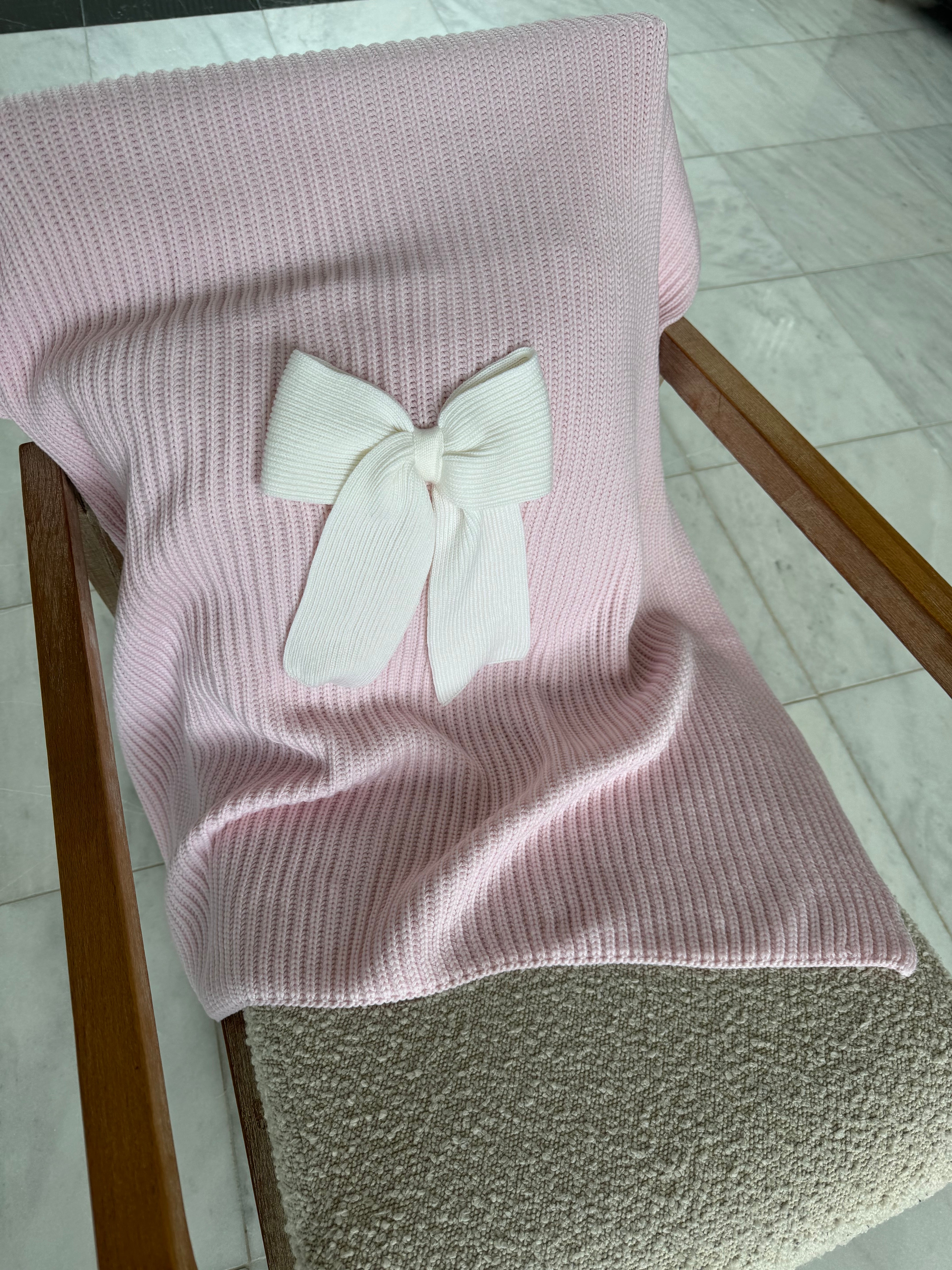 Beautiful Knitted Merino Wool Pink Baby Blanket with Bow details.