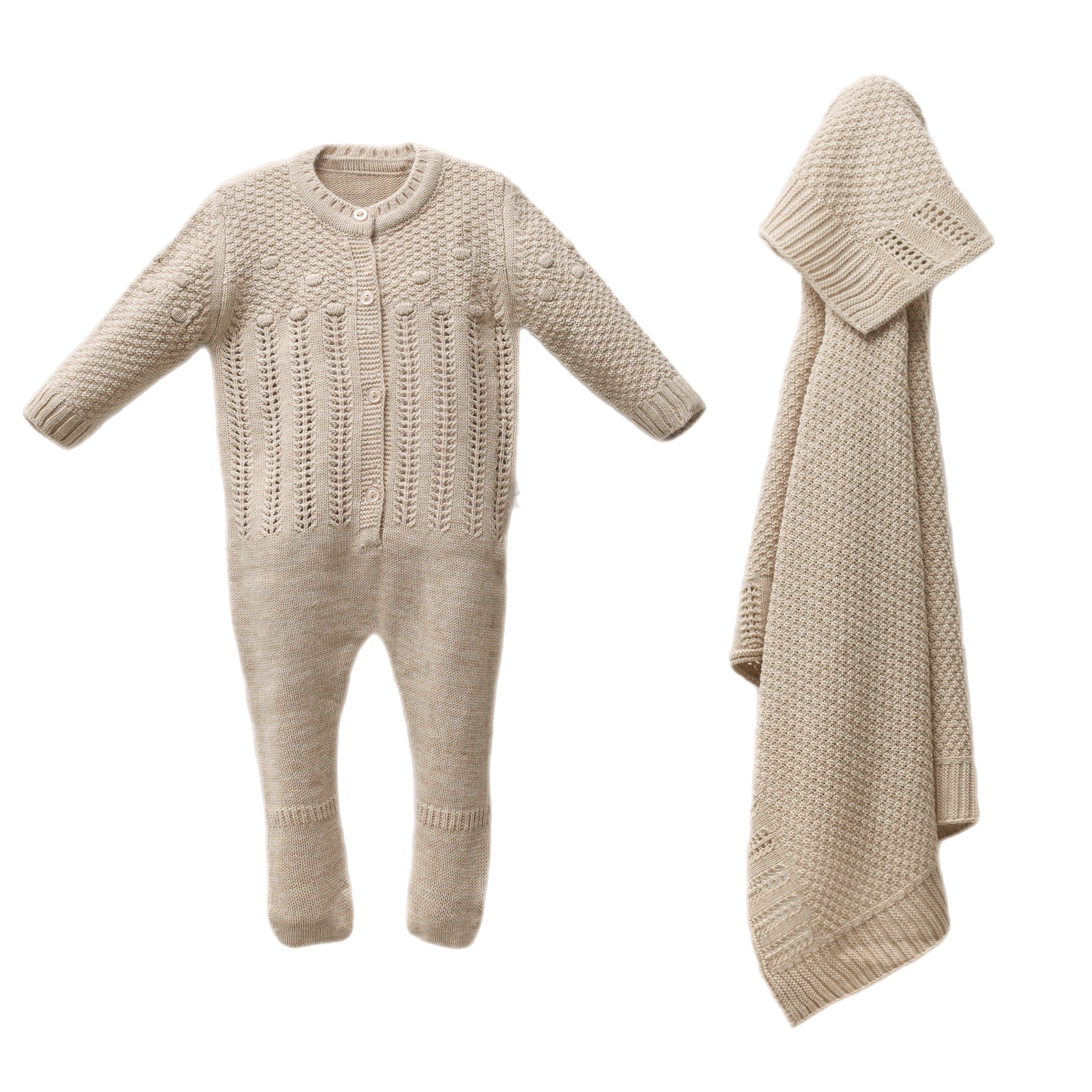 Light beige knitted romper and matching blanket hospital set.