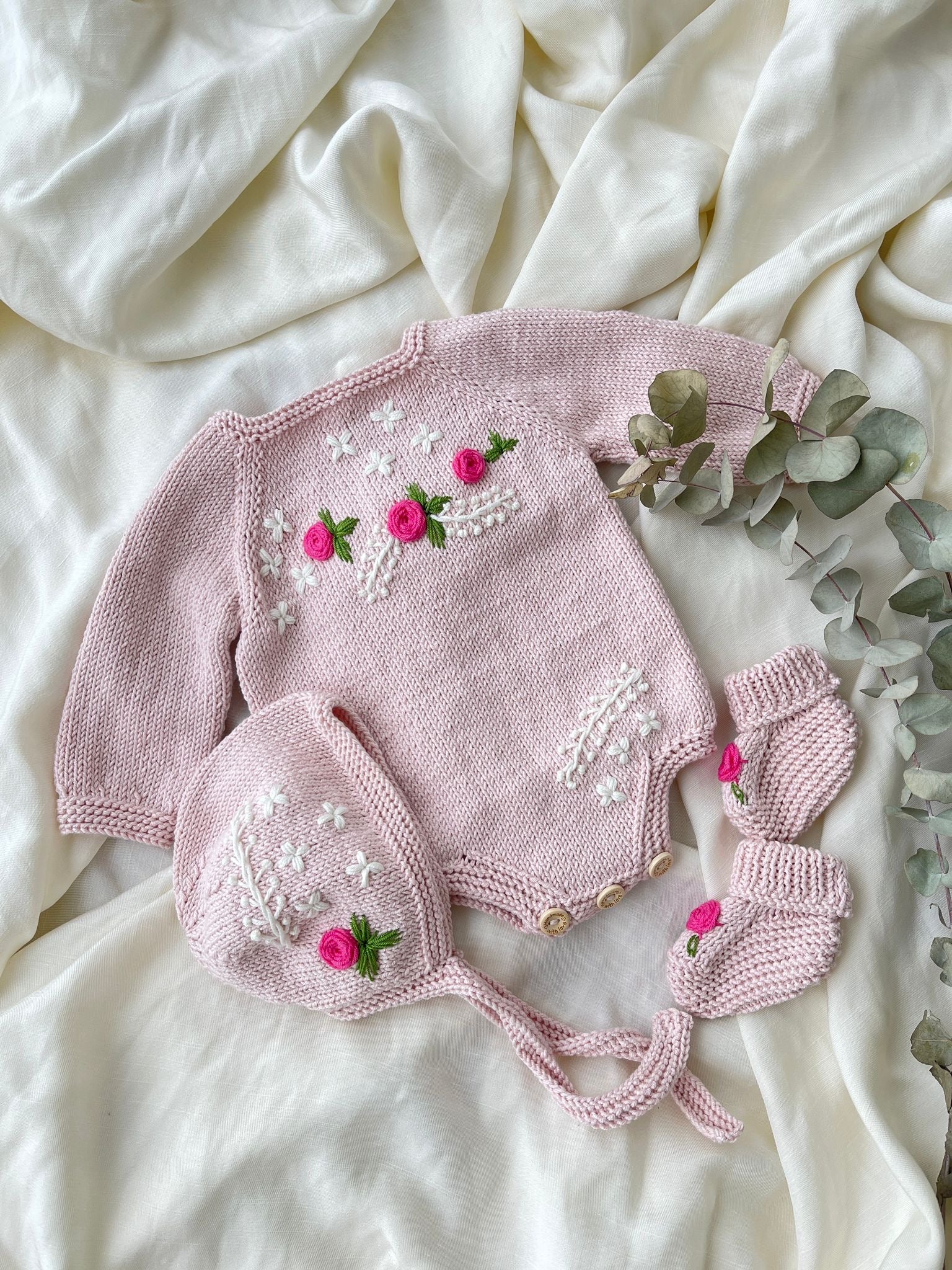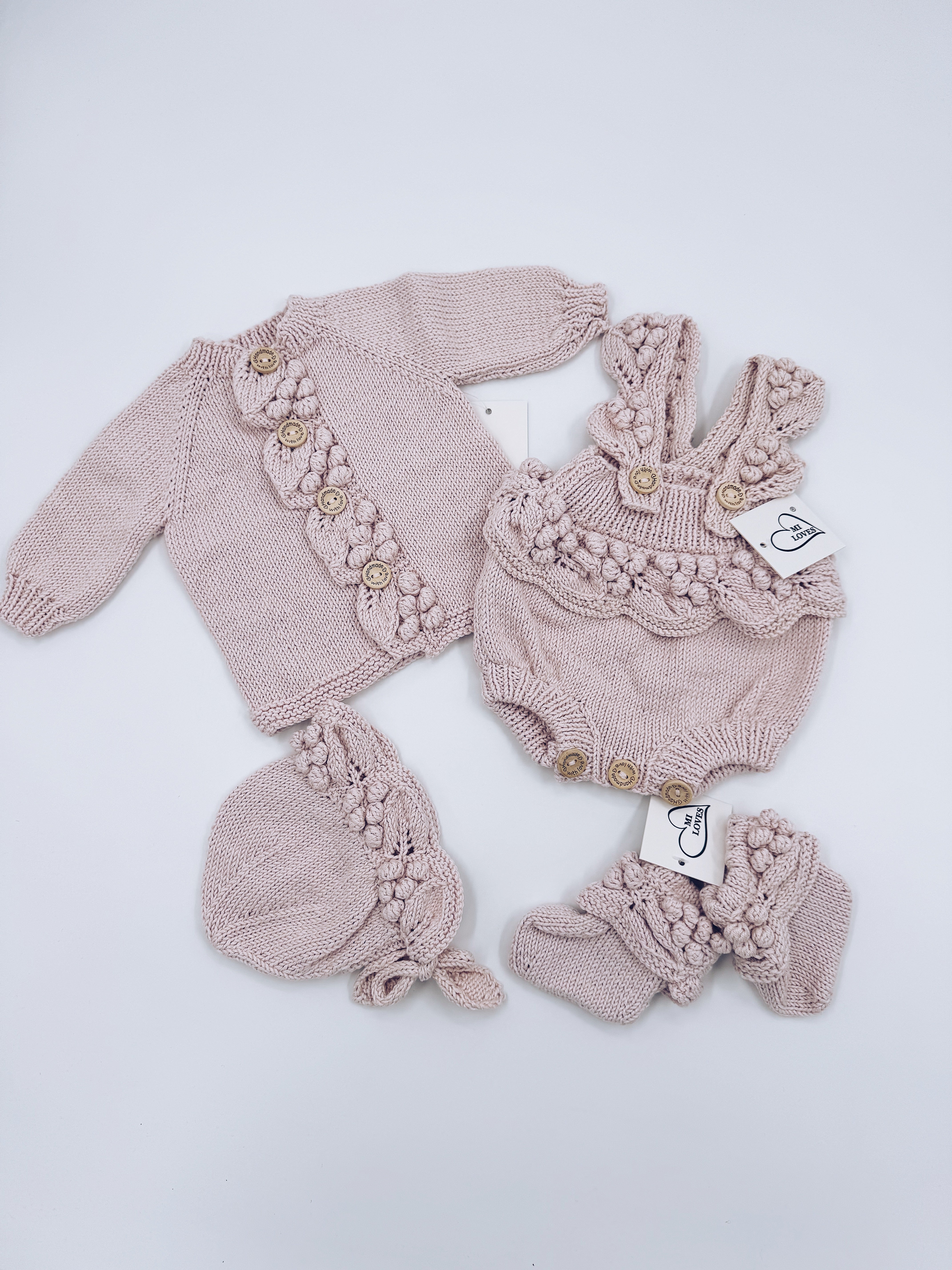 Beautiful Dusty Pink Hand Knitted 3 piece set with floral details.