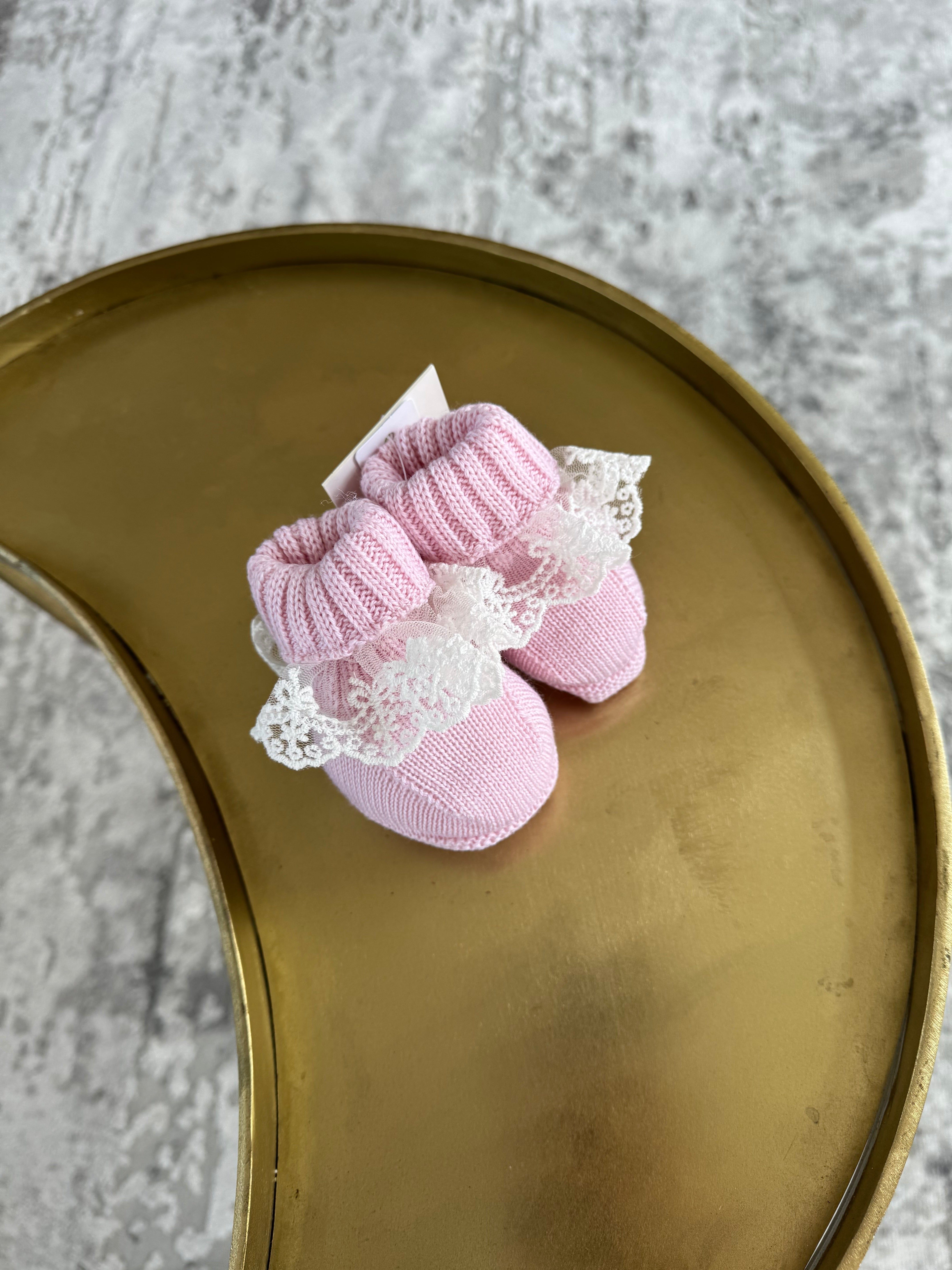 Beautiful knitted Merino Wool Baby Pink Baby Booties with Lace details.