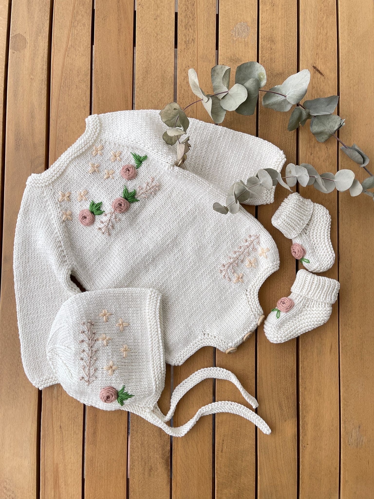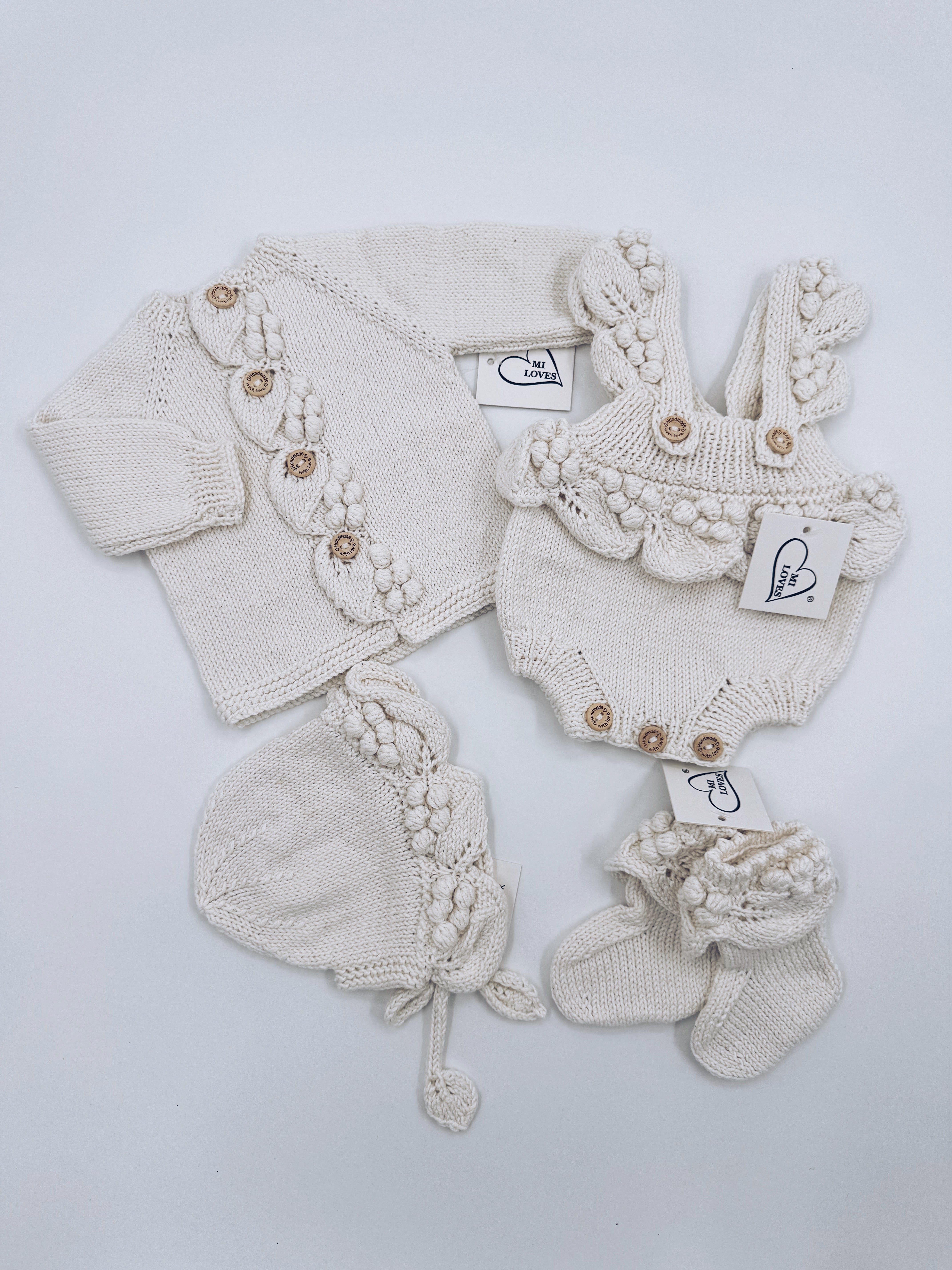Beautiful Ivory Hand Knitted 3 piece set with floral details.