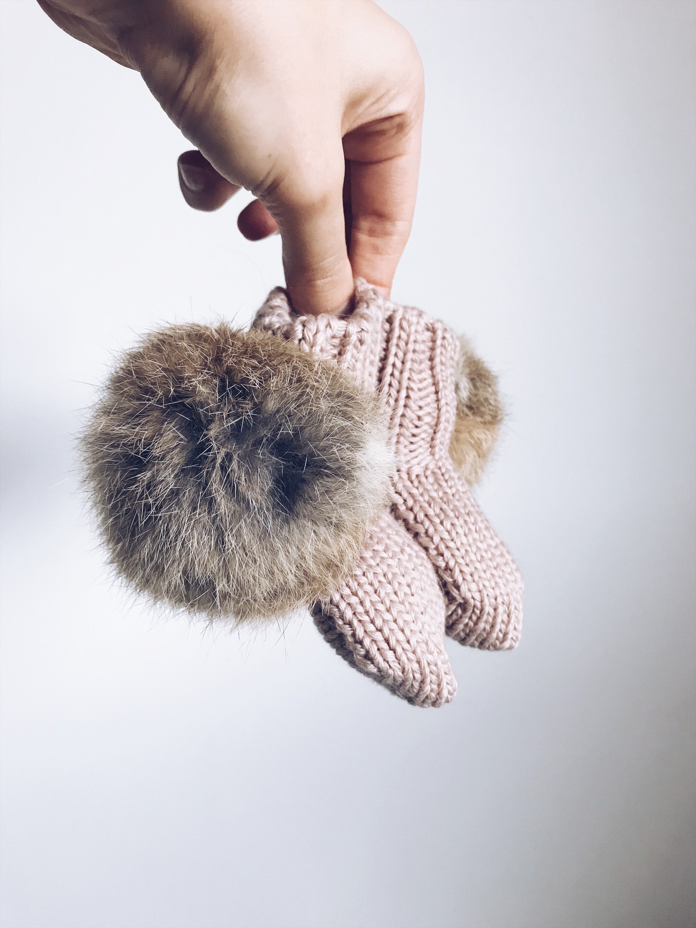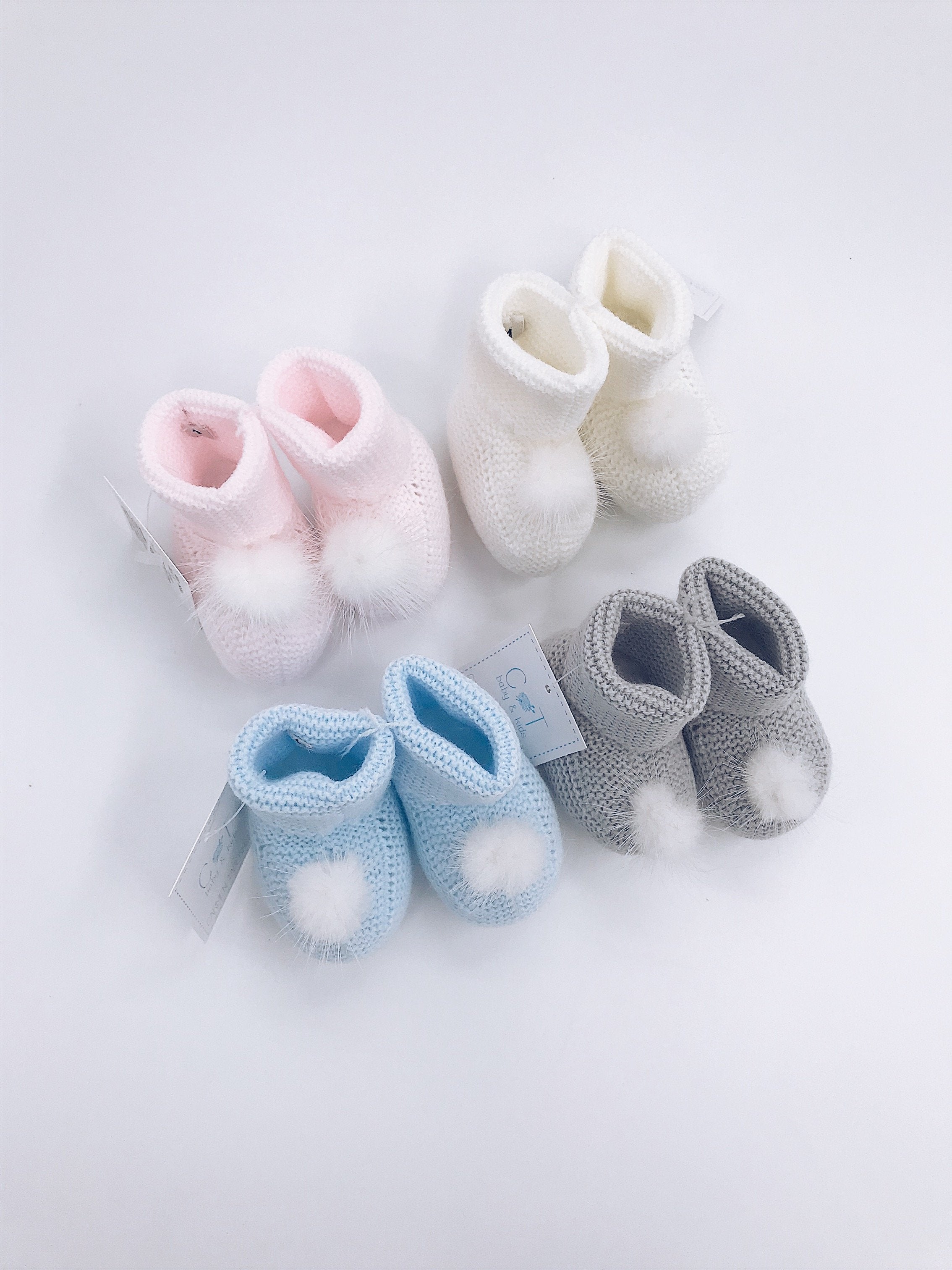 MILOVES Signature Hand Knitted baby booties with rabbit fur pompom.C