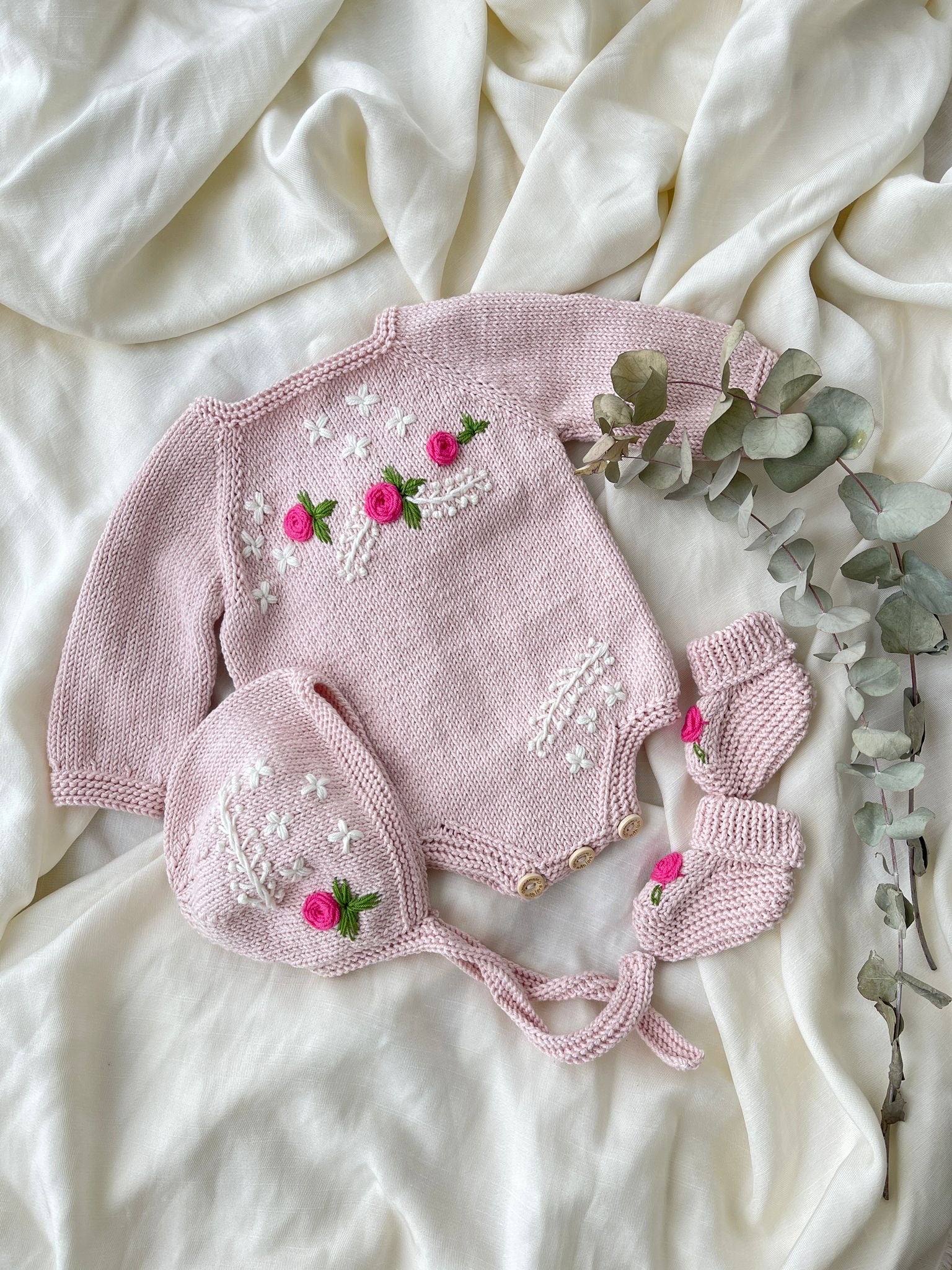 Beautiful Dusty Pink Hand Knitted 3 piece set with floral details.