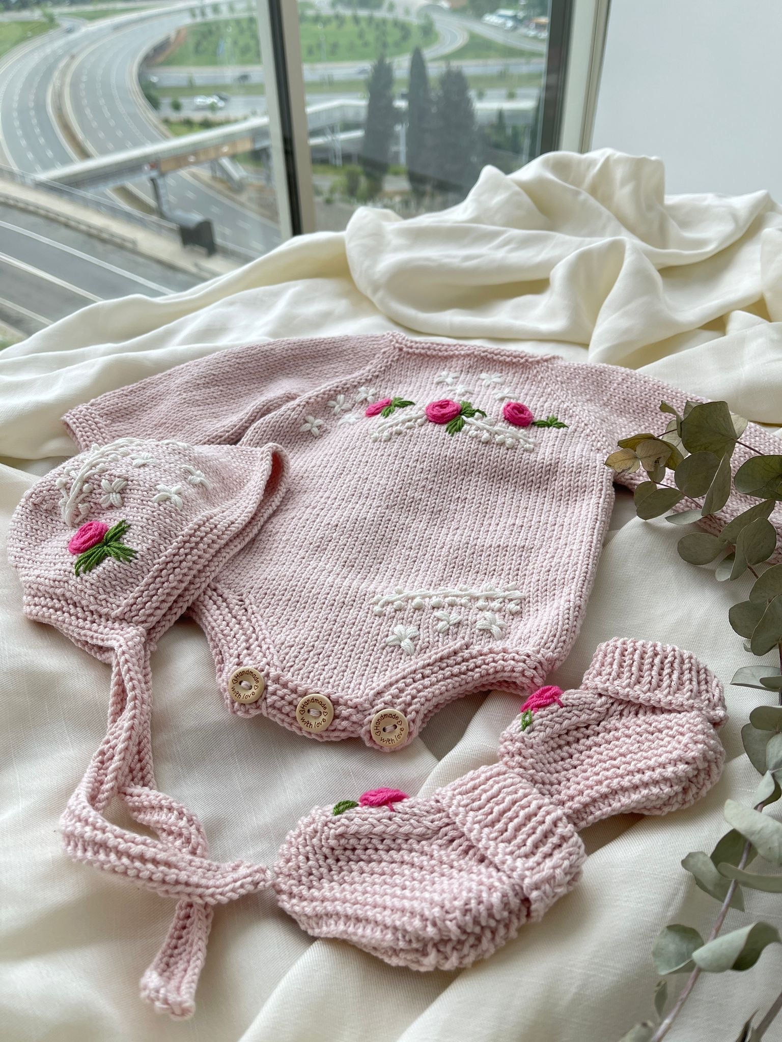 Beautiful Dusty Pink Hand Knitted 3 piece set with floral details.Set Include Romper,Baby Booties and baby Bonnet.