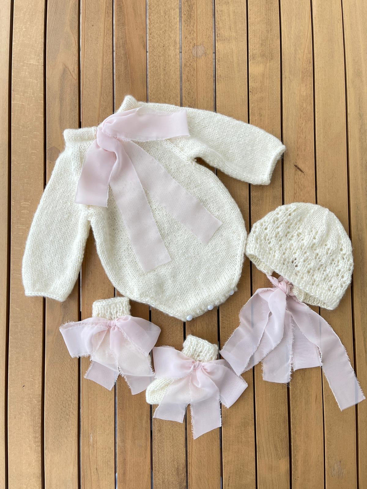 Beautiful Hand Knitted 3 piece set with bow details.Set Include Romper,Baby Booties and baby Bonnet.