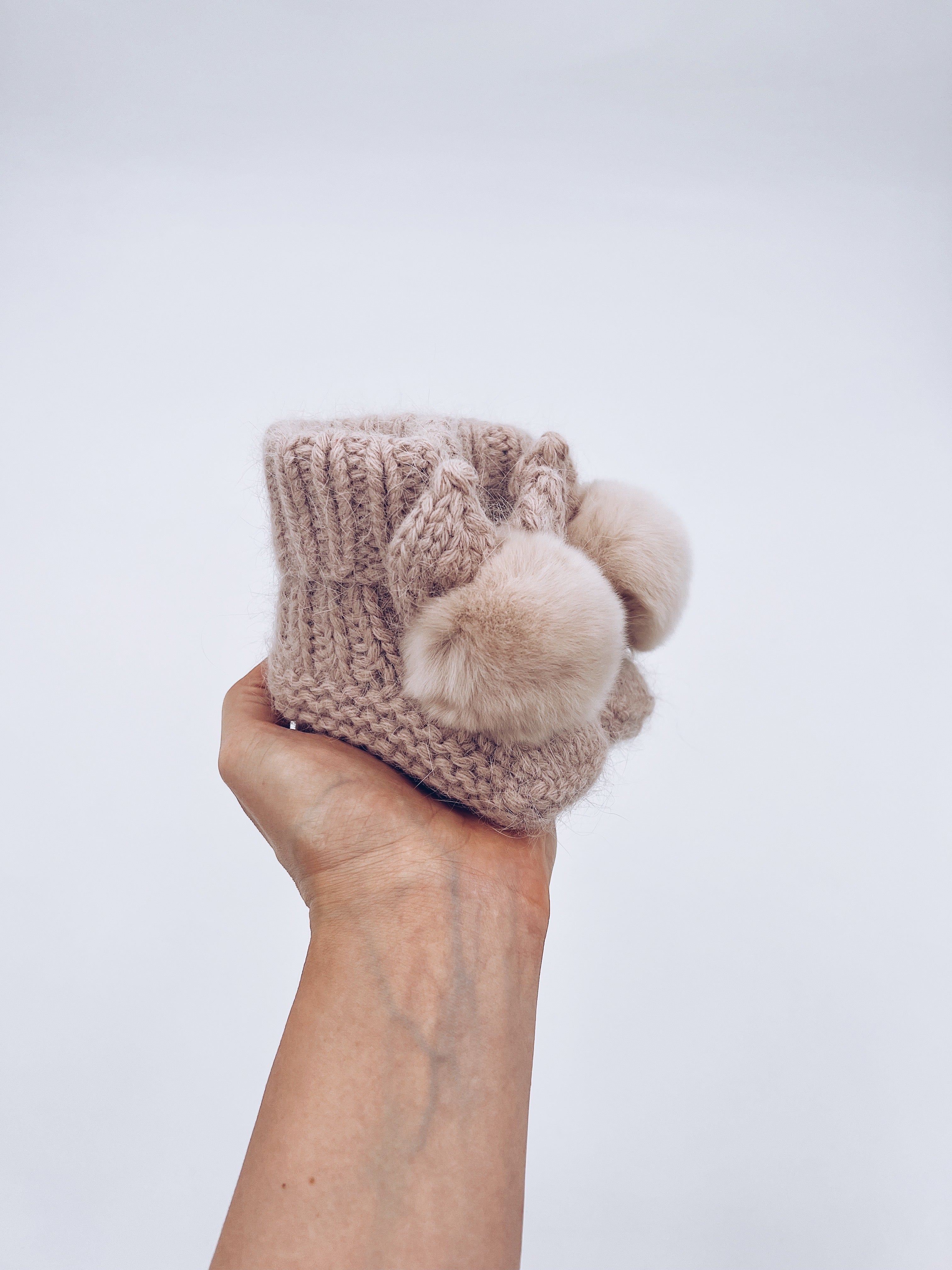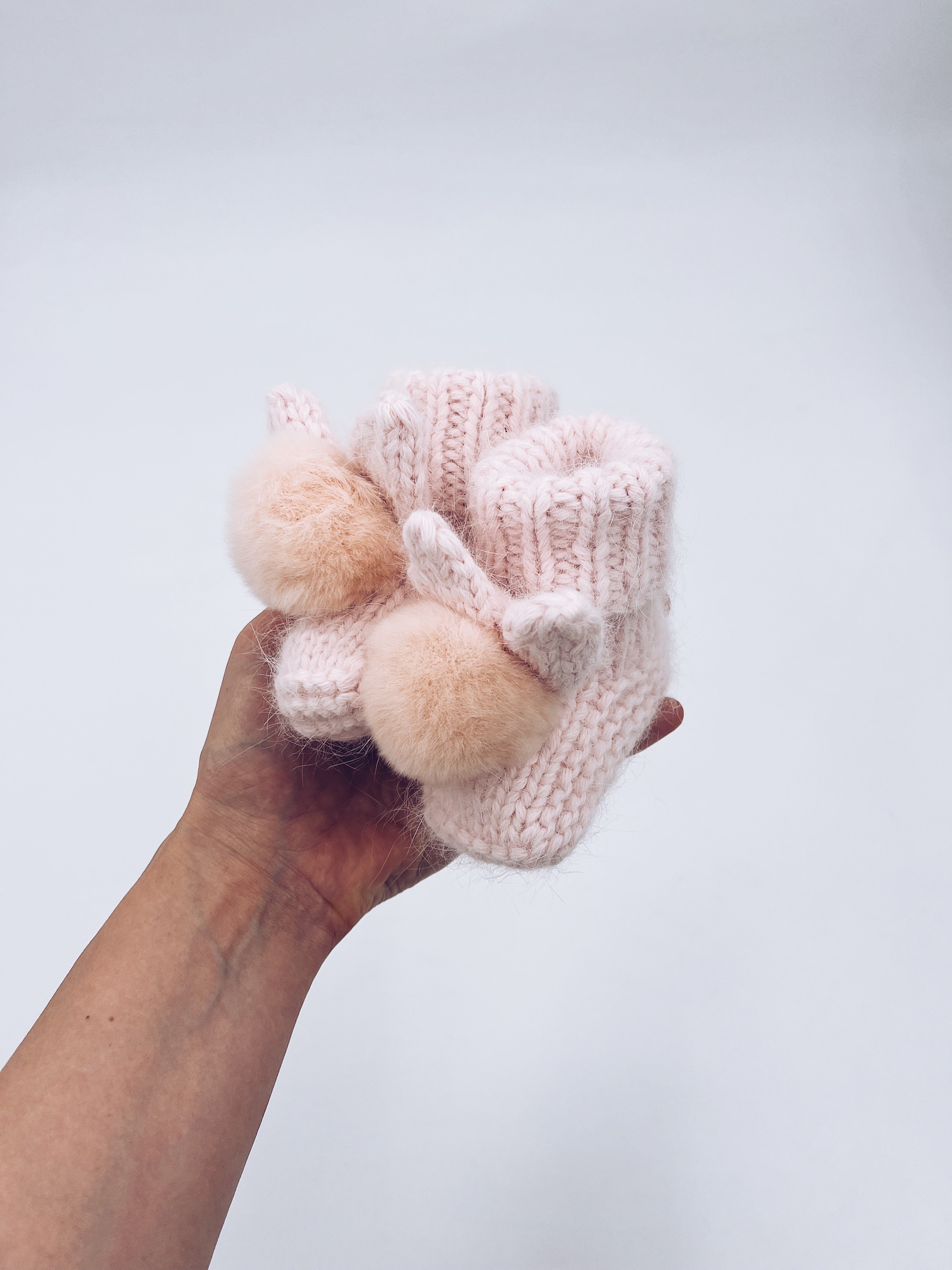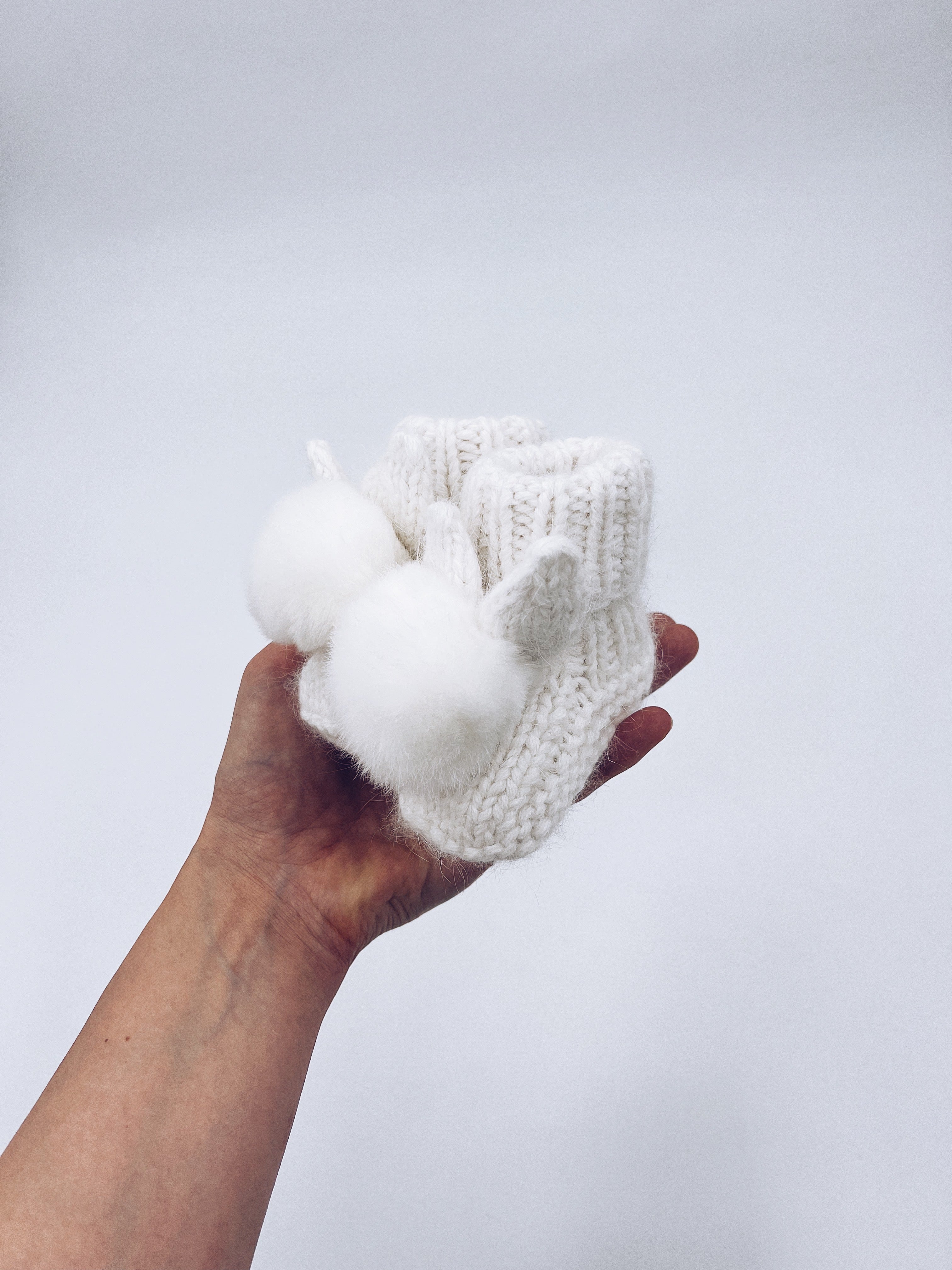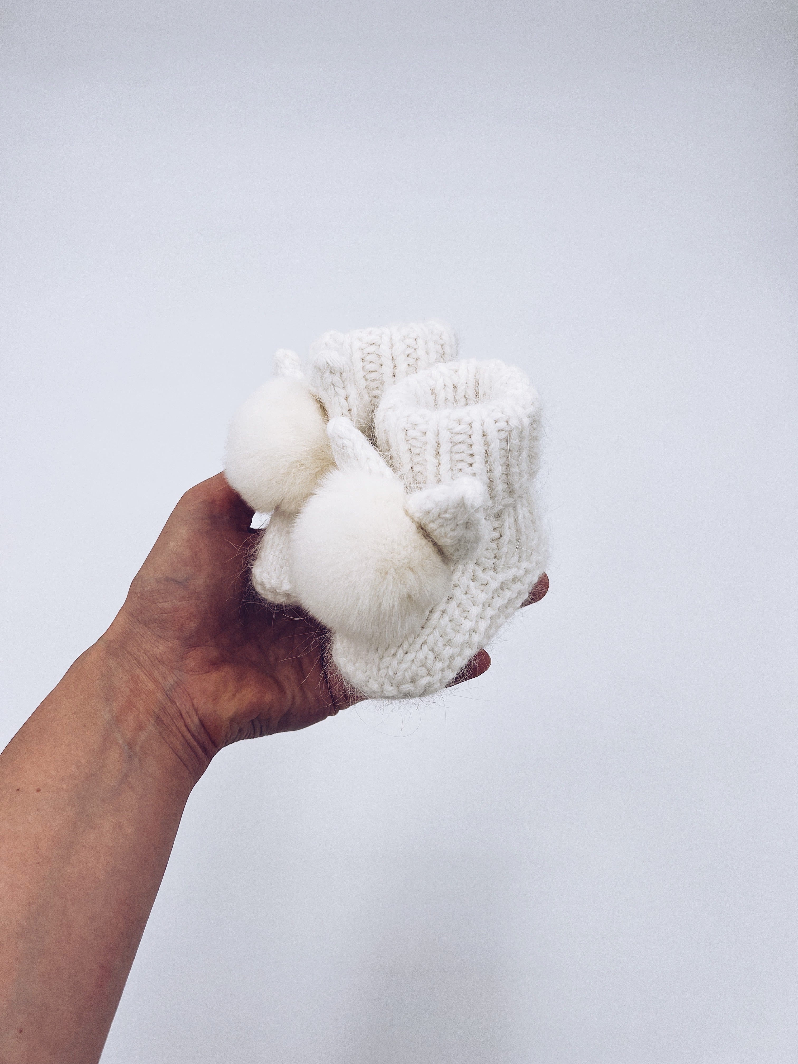 MI LOVES SIGNATURE Little Bunny Angora pompom booties.Beautiful,Soft and warm angora yarn and lovely big round rabbit fur pompoms.