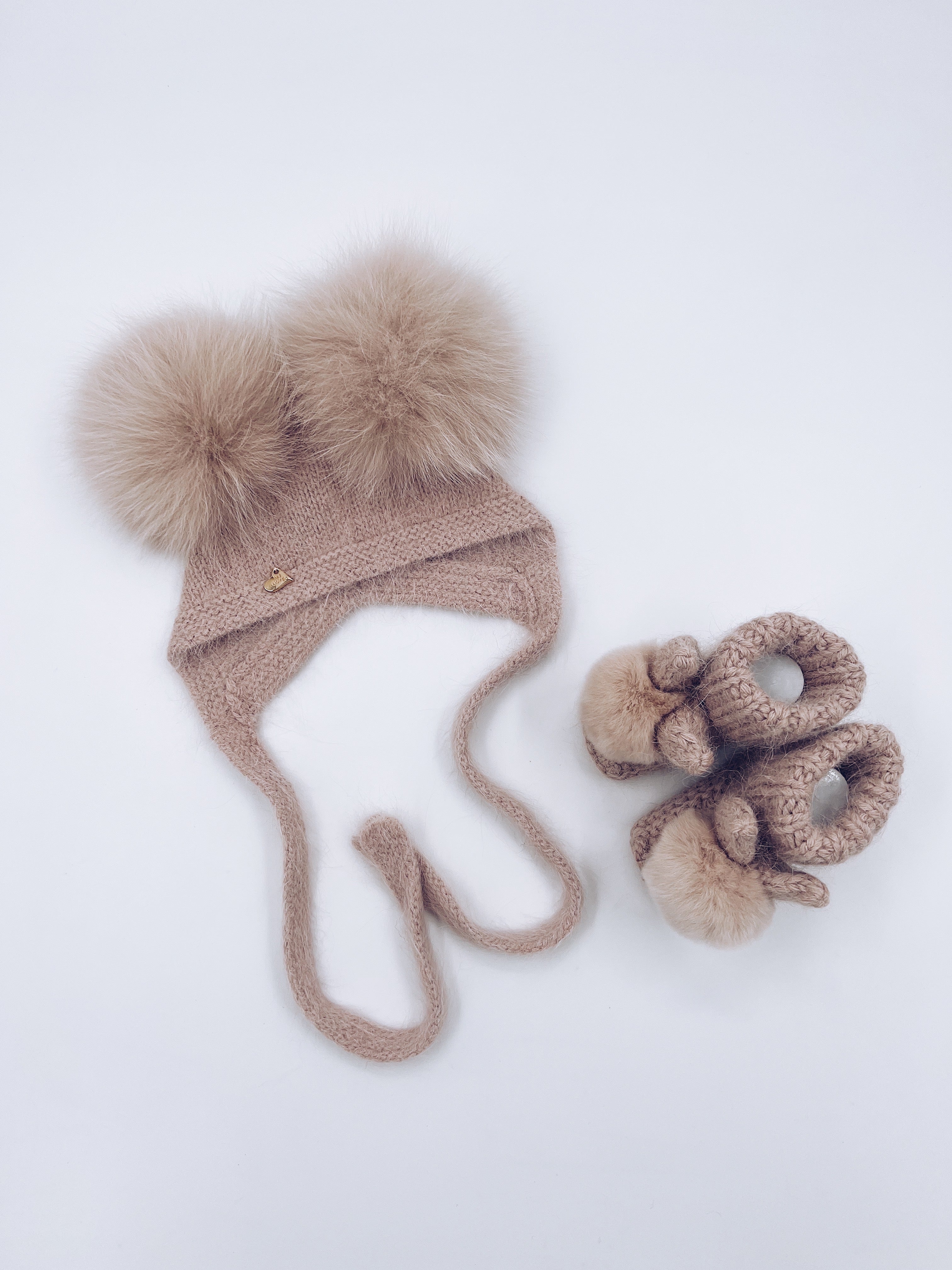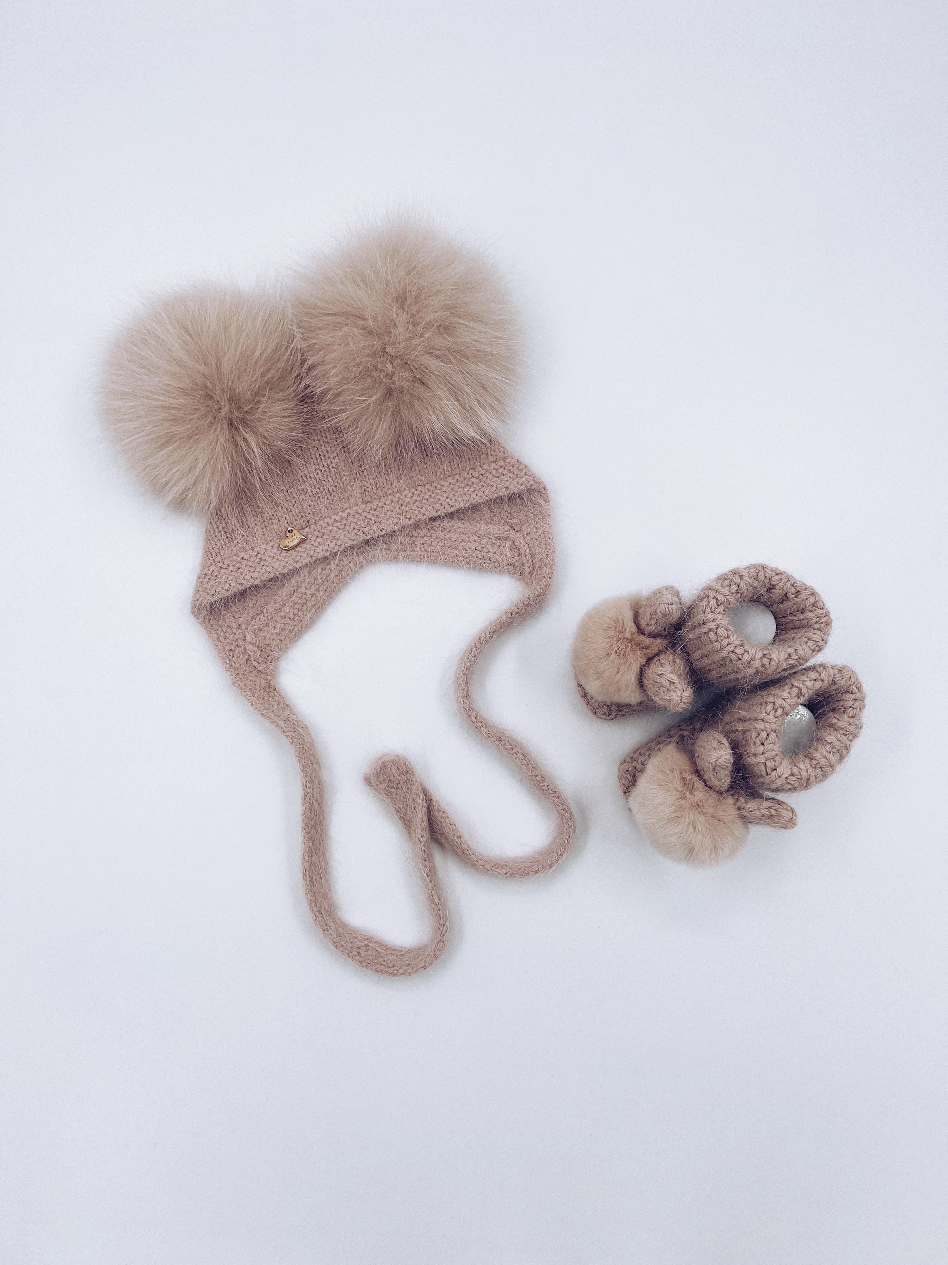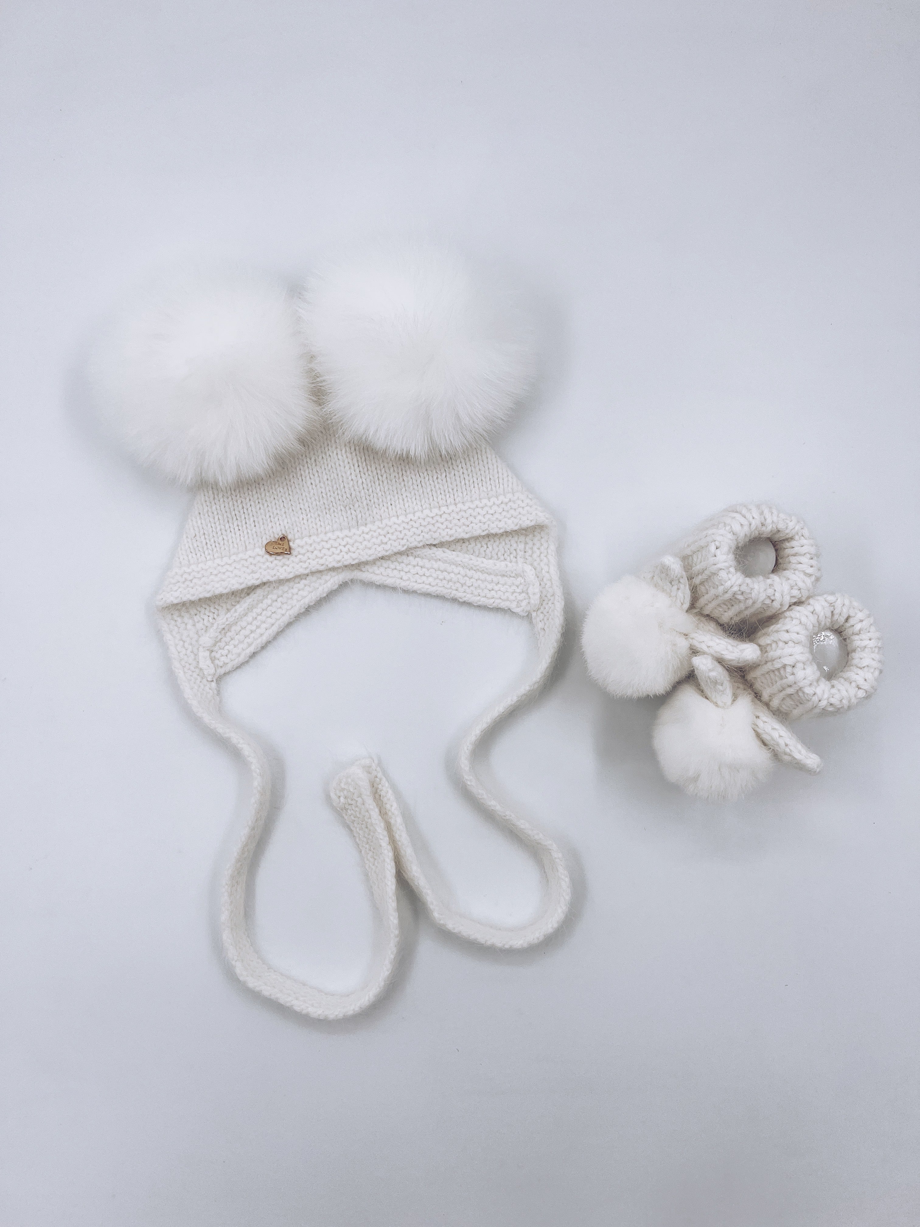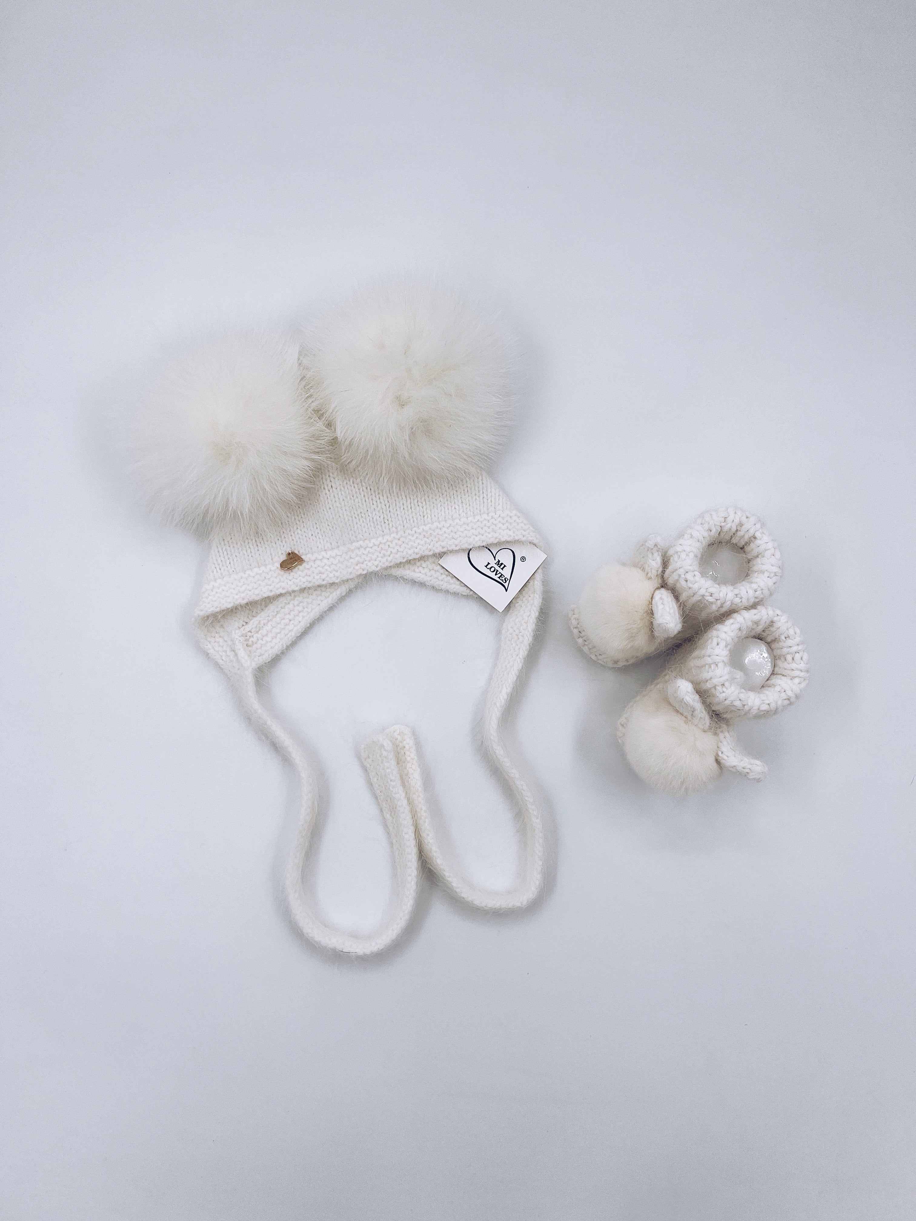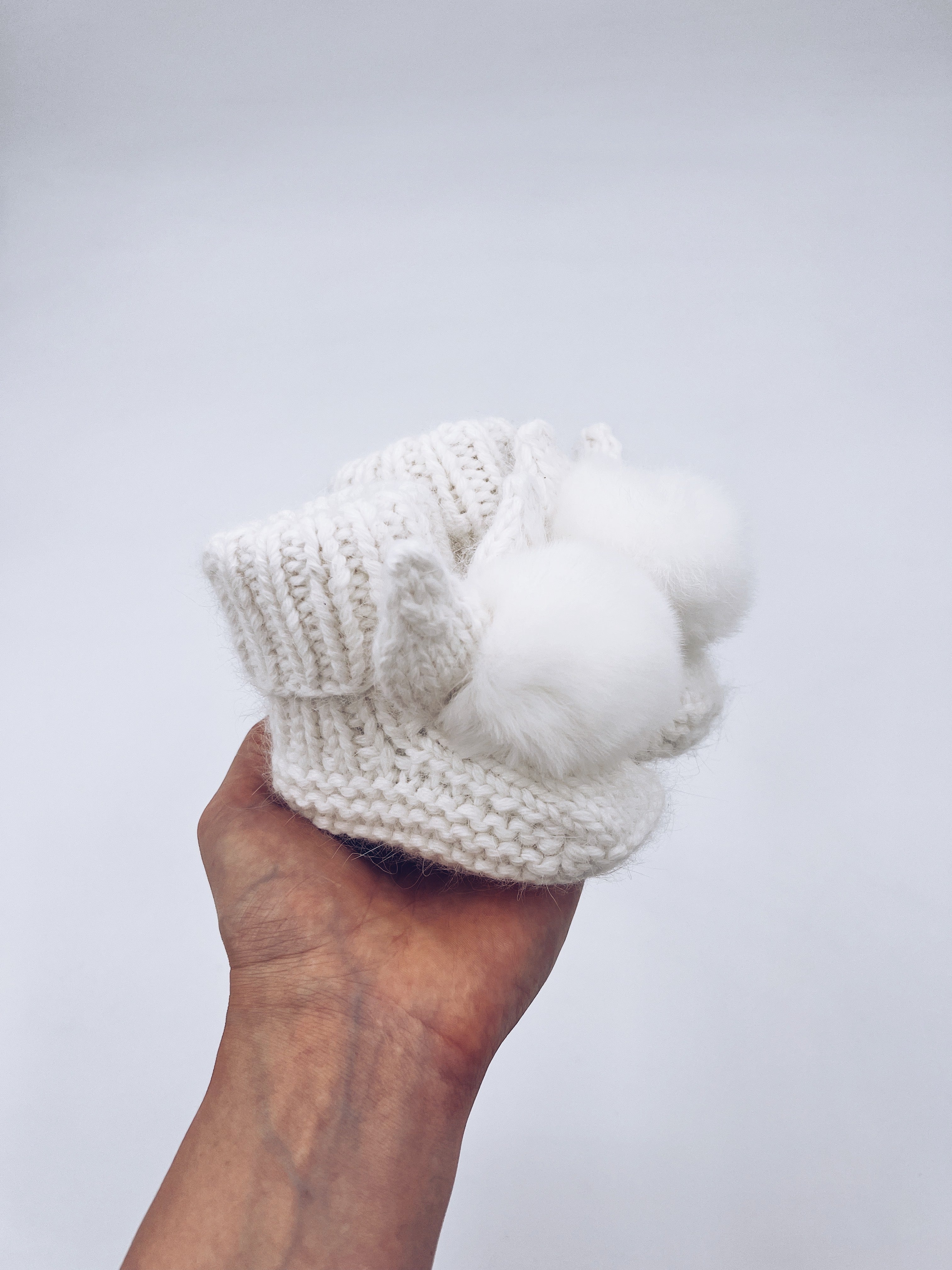 MI LOVES SIGNATURE Little Bunny Angora pompom booties.Beautiful,Soft and warm angora yarn and lovely big round rabbit fur pompoms.