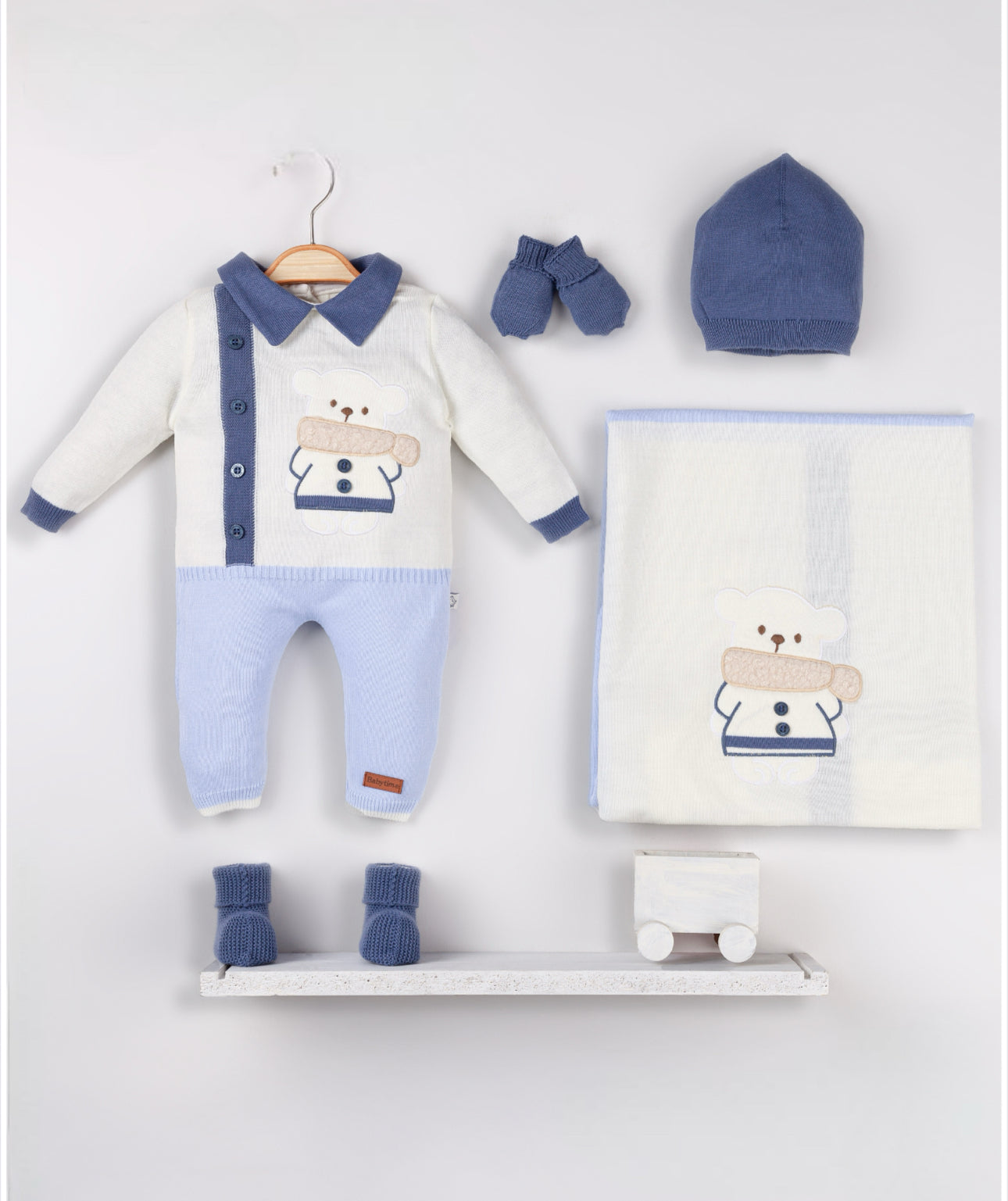 Beautiful Teddy 5 piece Hospital/Coming home set(including Blanket/Knitted romper/Mittens/Booties/Hat)