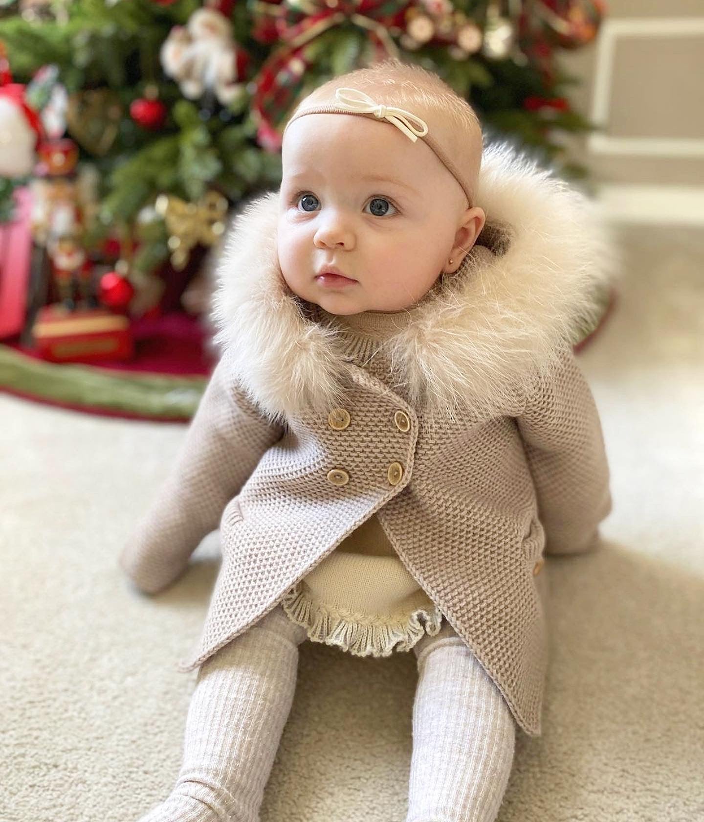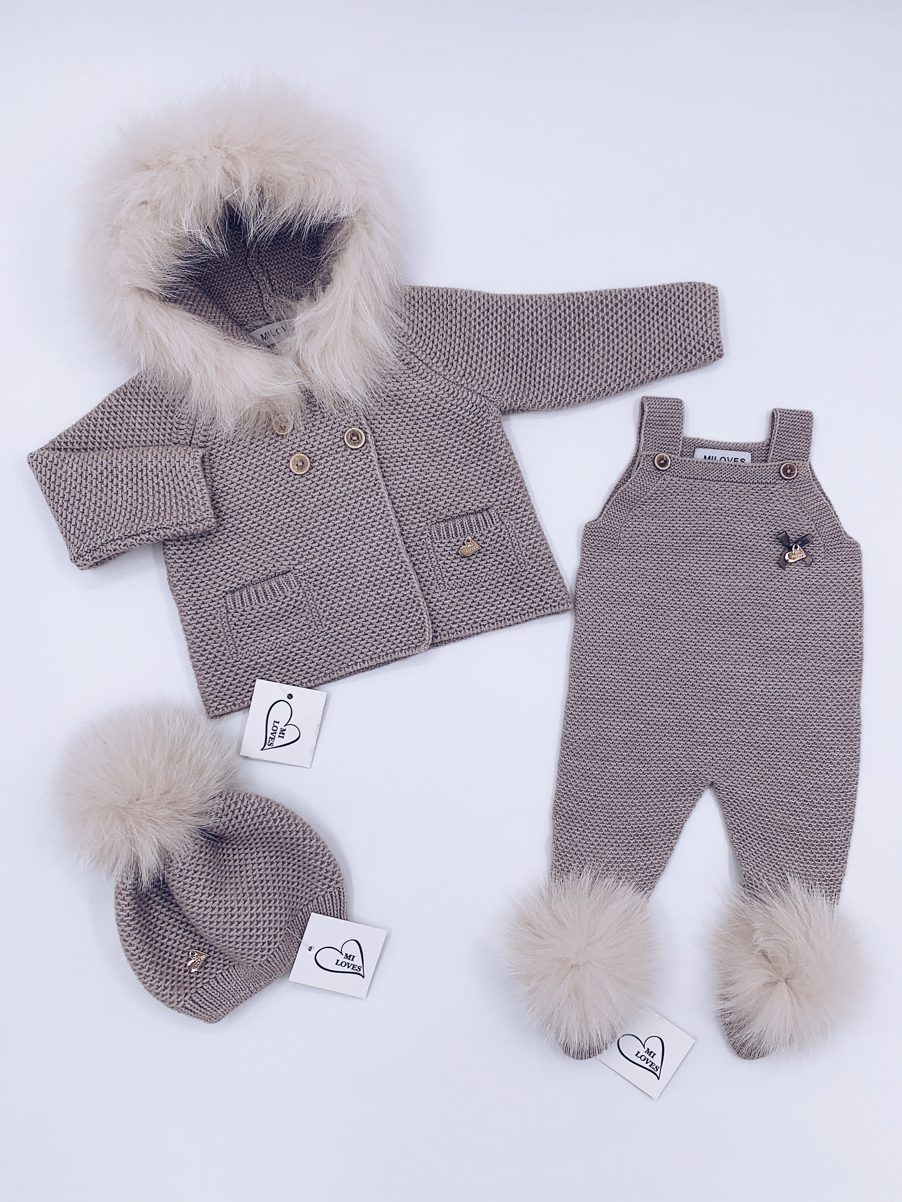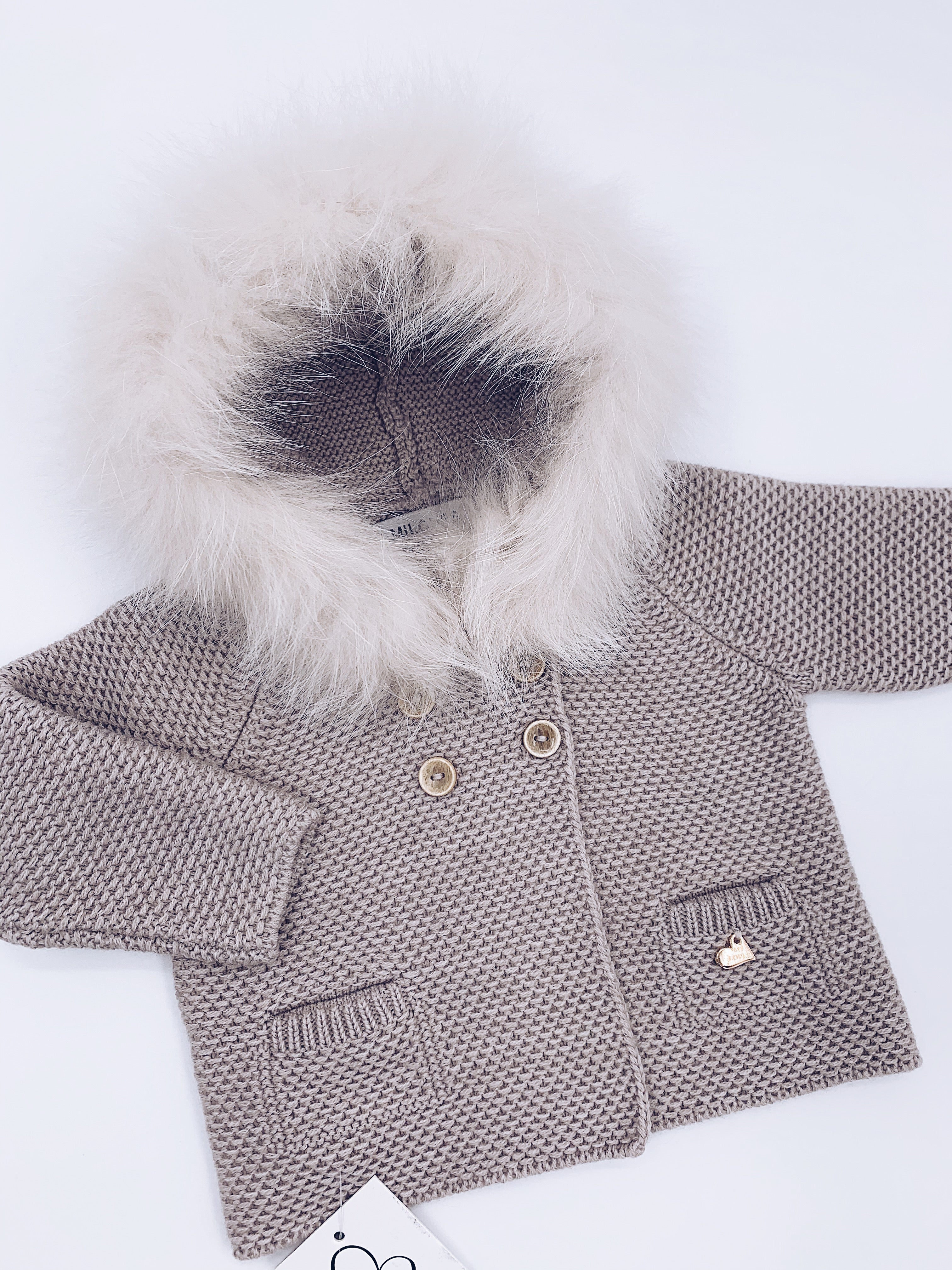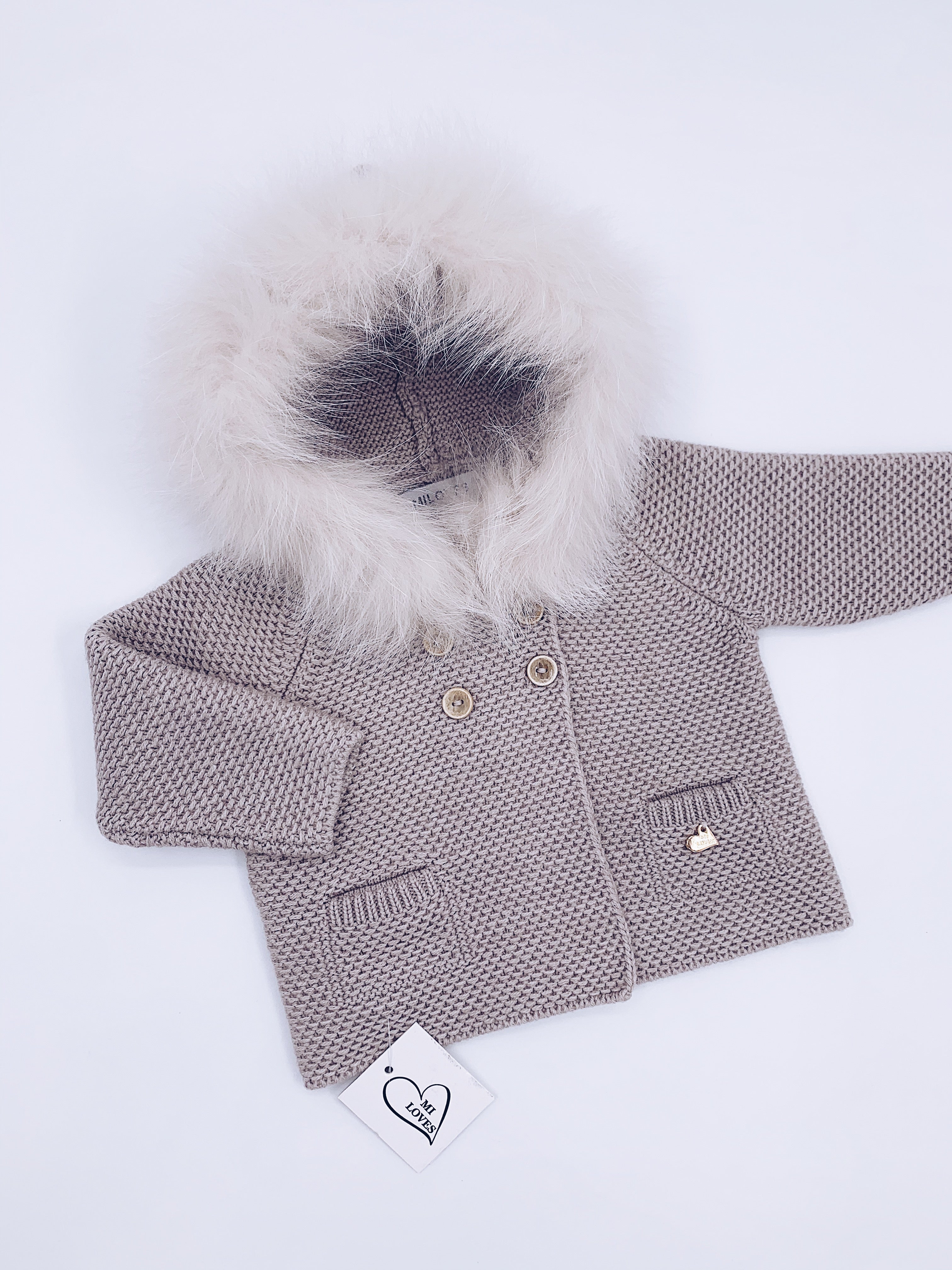 MI LOVES SIGNATURE Luxurious knitted cardigan with fox fur trim in Cappuccino.