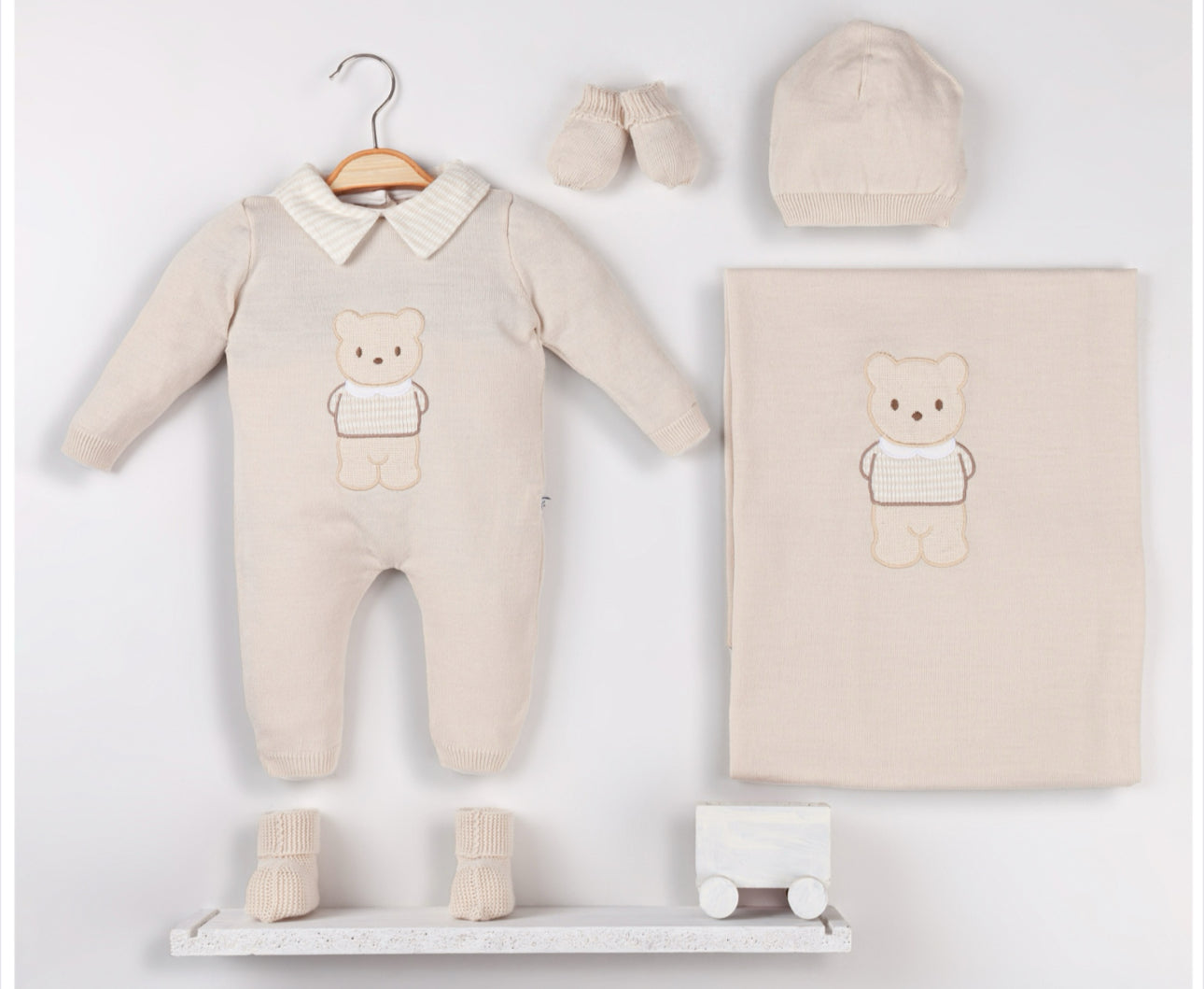 Beautiful Beige Teddy 5 piece Hospital/Coming home set(including Blanket/Knitted romper/Mittens/Booties/Hat)