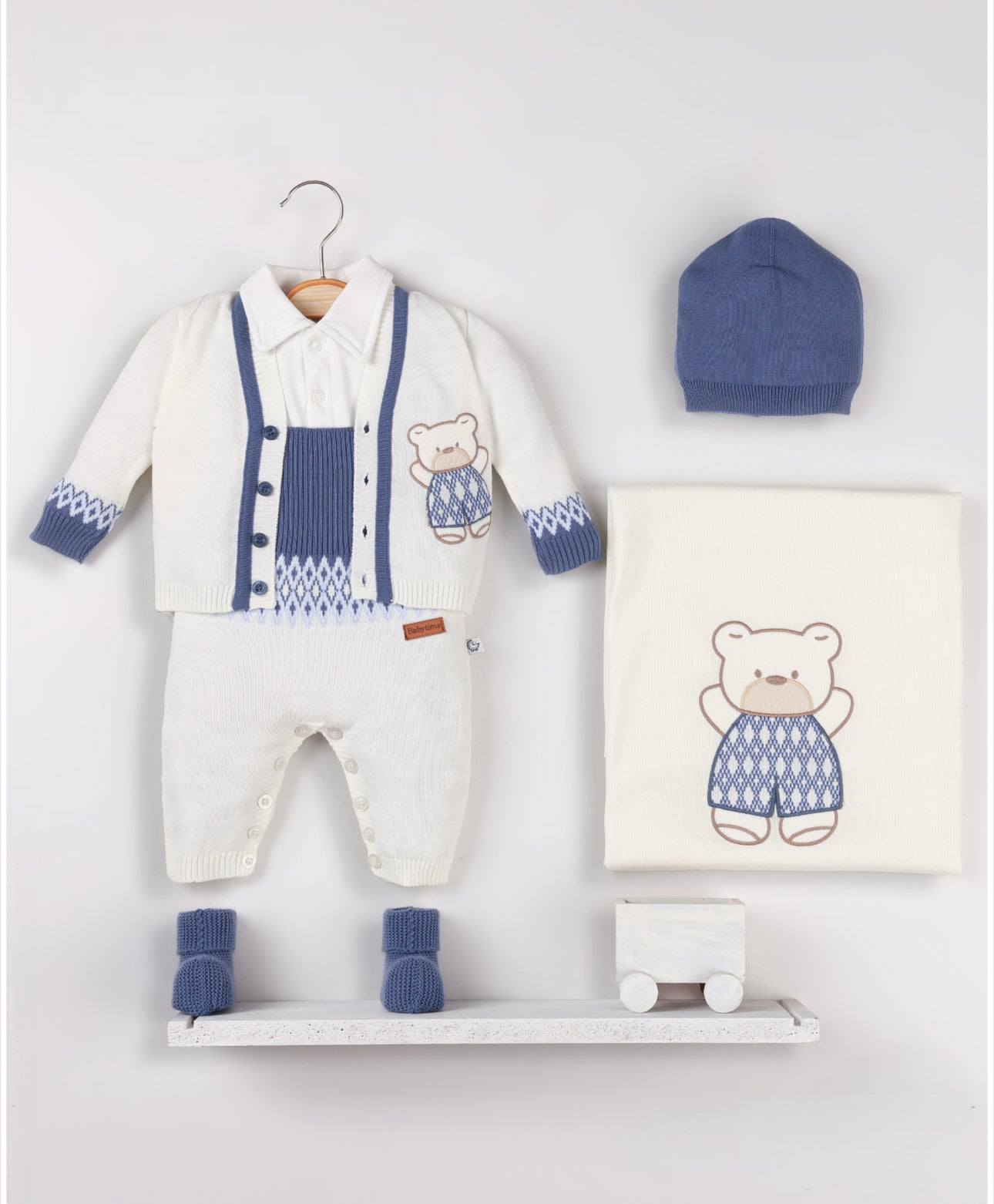 Beautiful Teddy 6 piece Hospital/Coming home set(including Blanket/Knitted Dungarees/Knitted Cardigan/Bodysuit/Booties/Hat)
