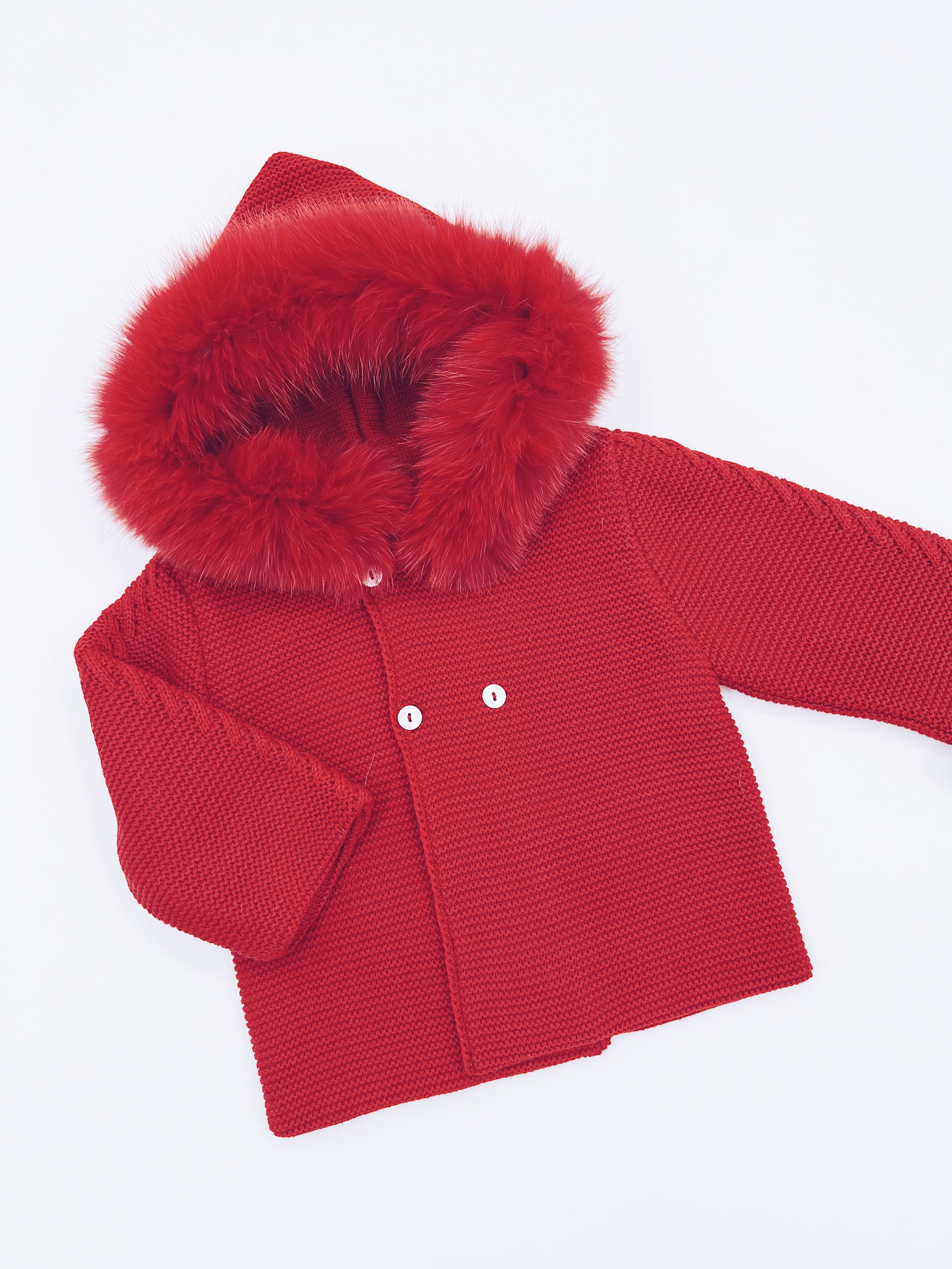 Beautiful Red Knitted Cardigan with Luxurious fur trim.