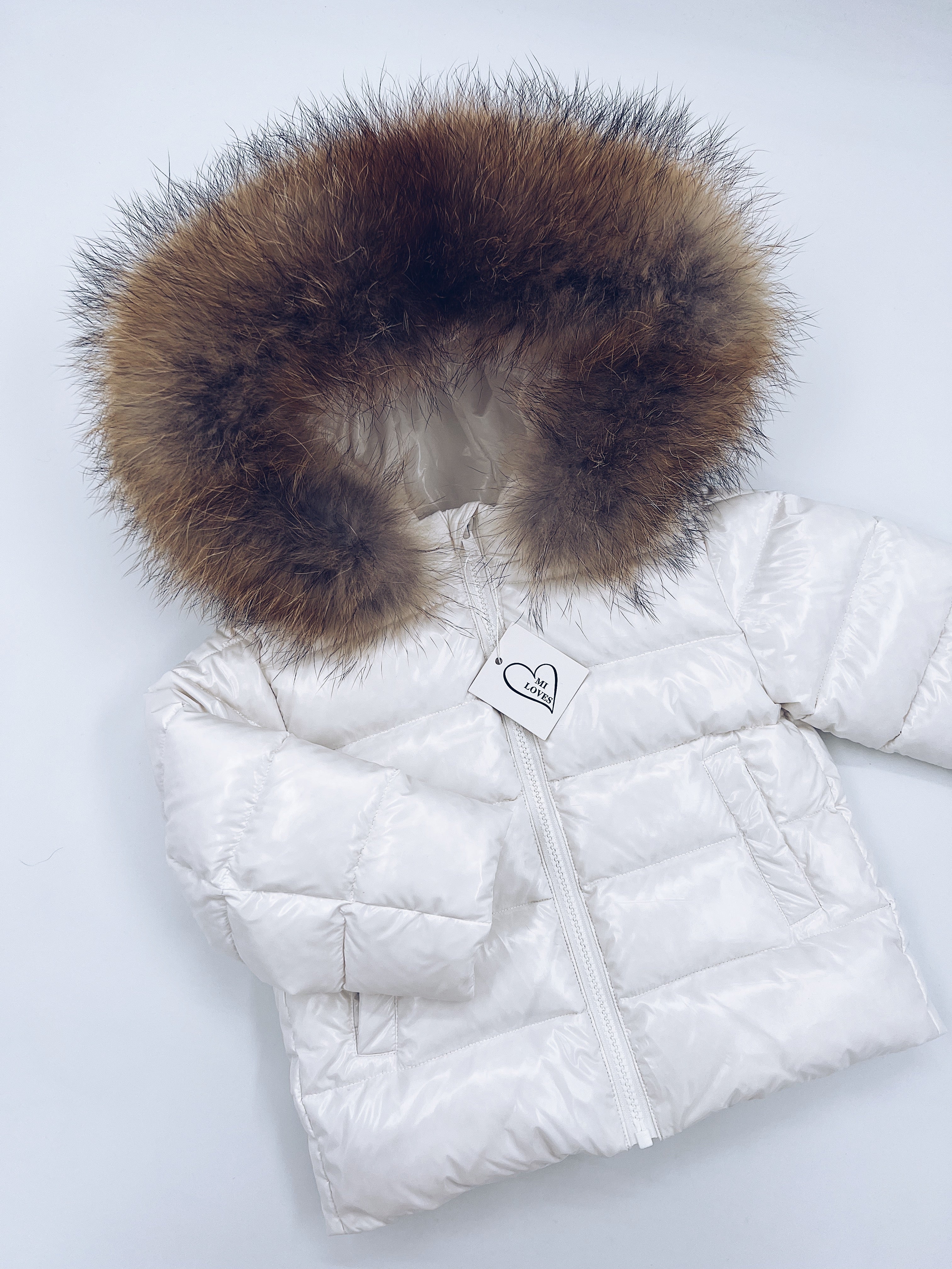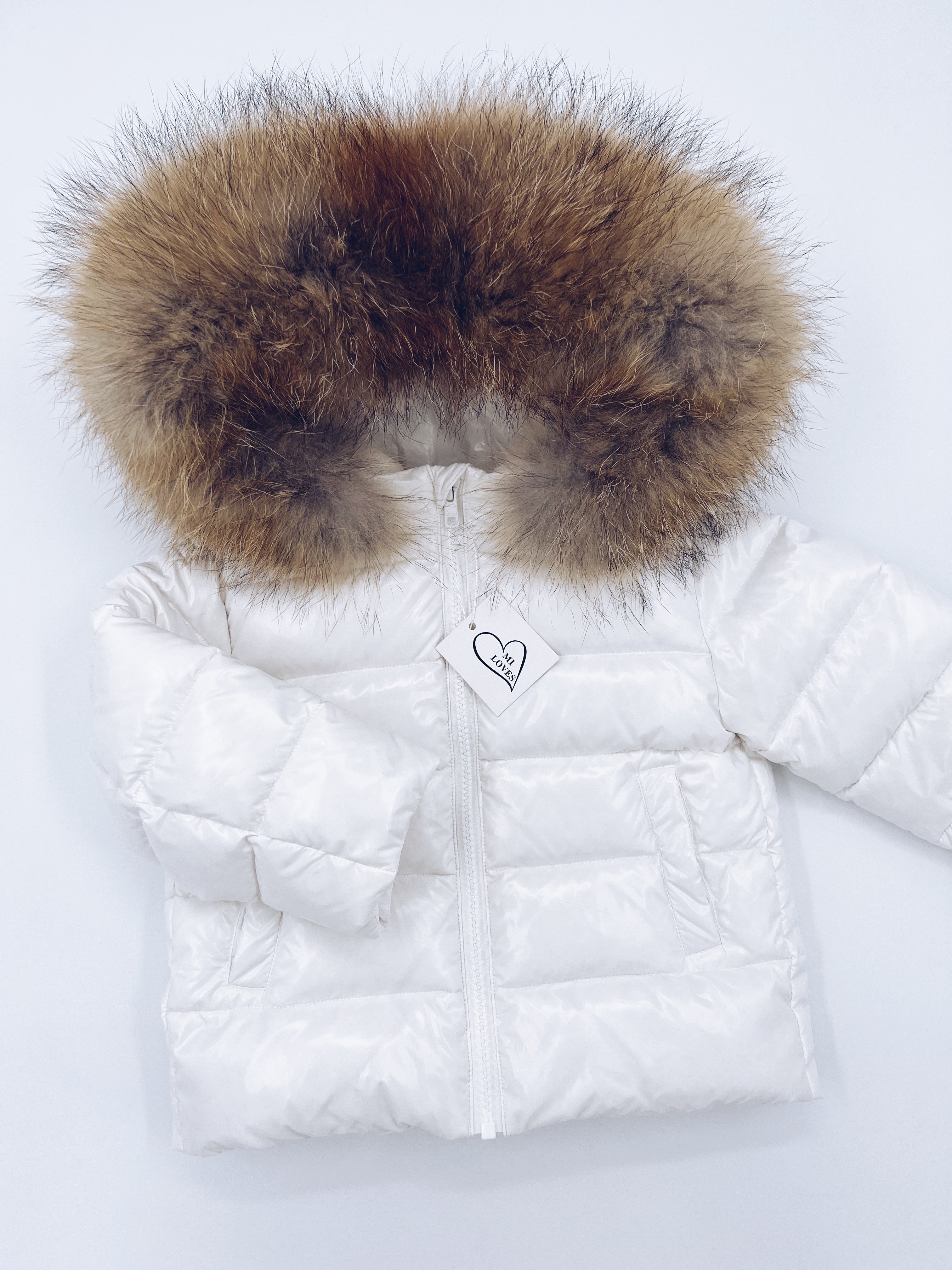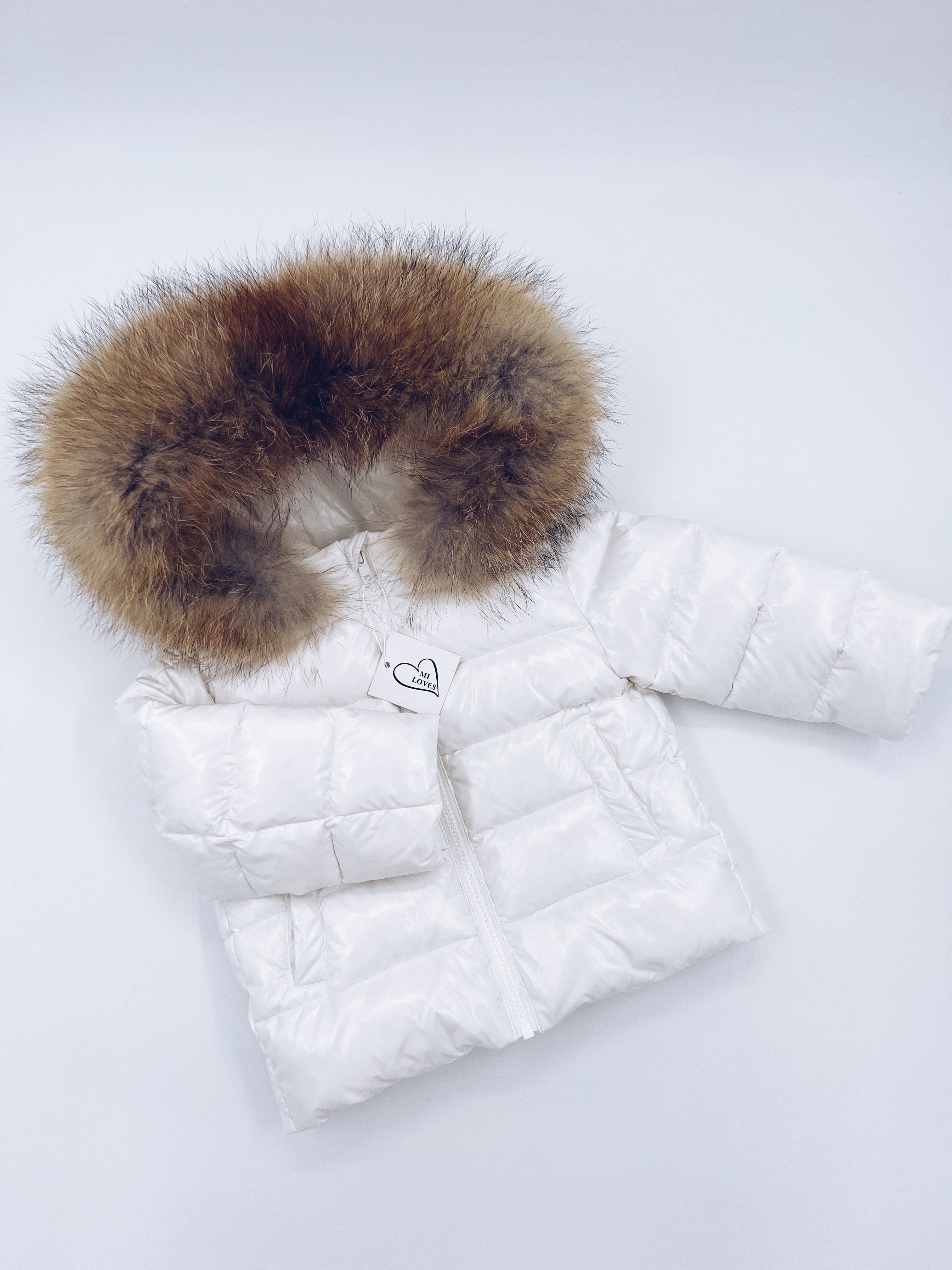 MI LOVES SIGNATURE White Luxurious Racoon Fur Trim puff jacket .Beautiful ,warm with Detachable luxurious Racoon fur trim .