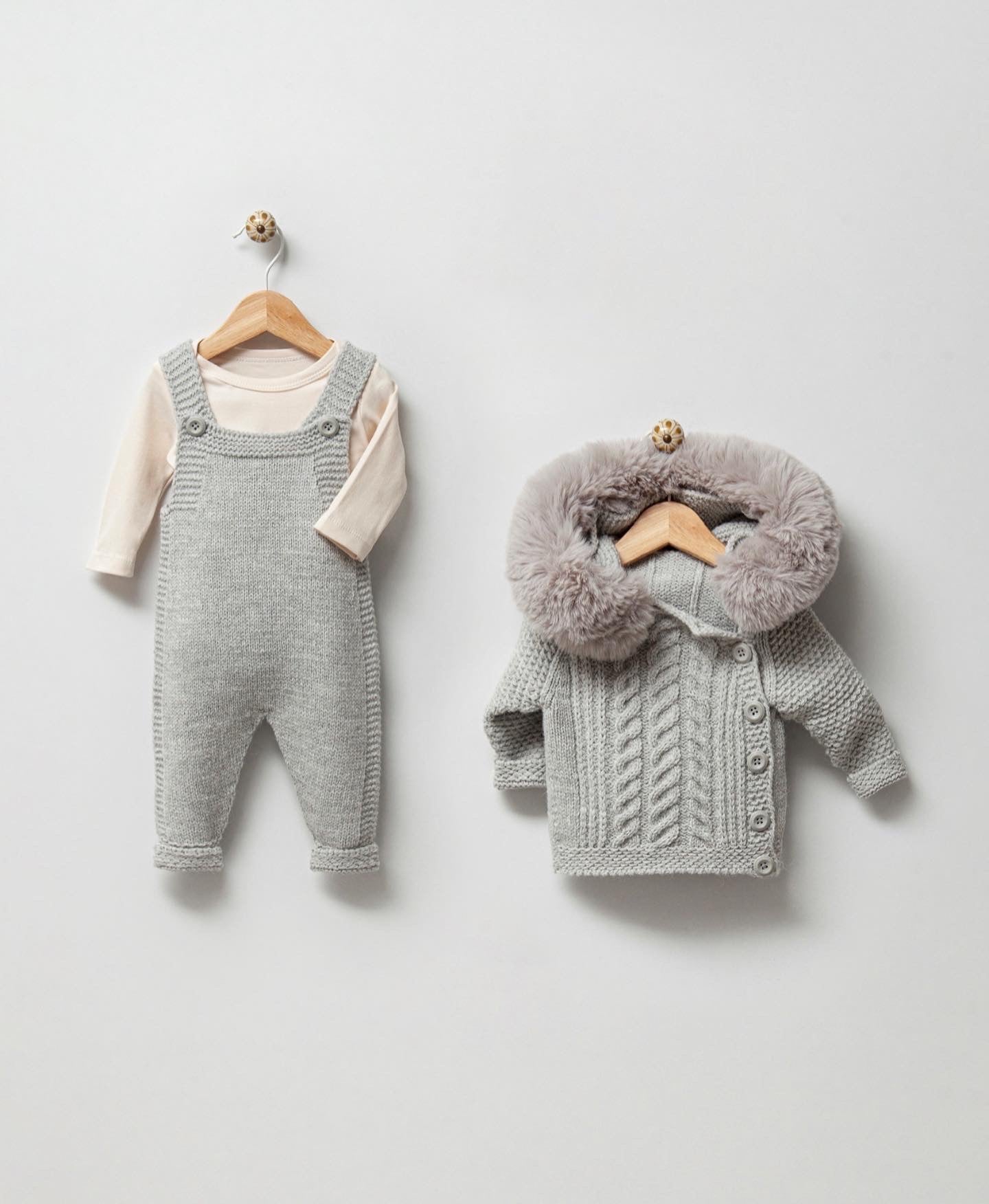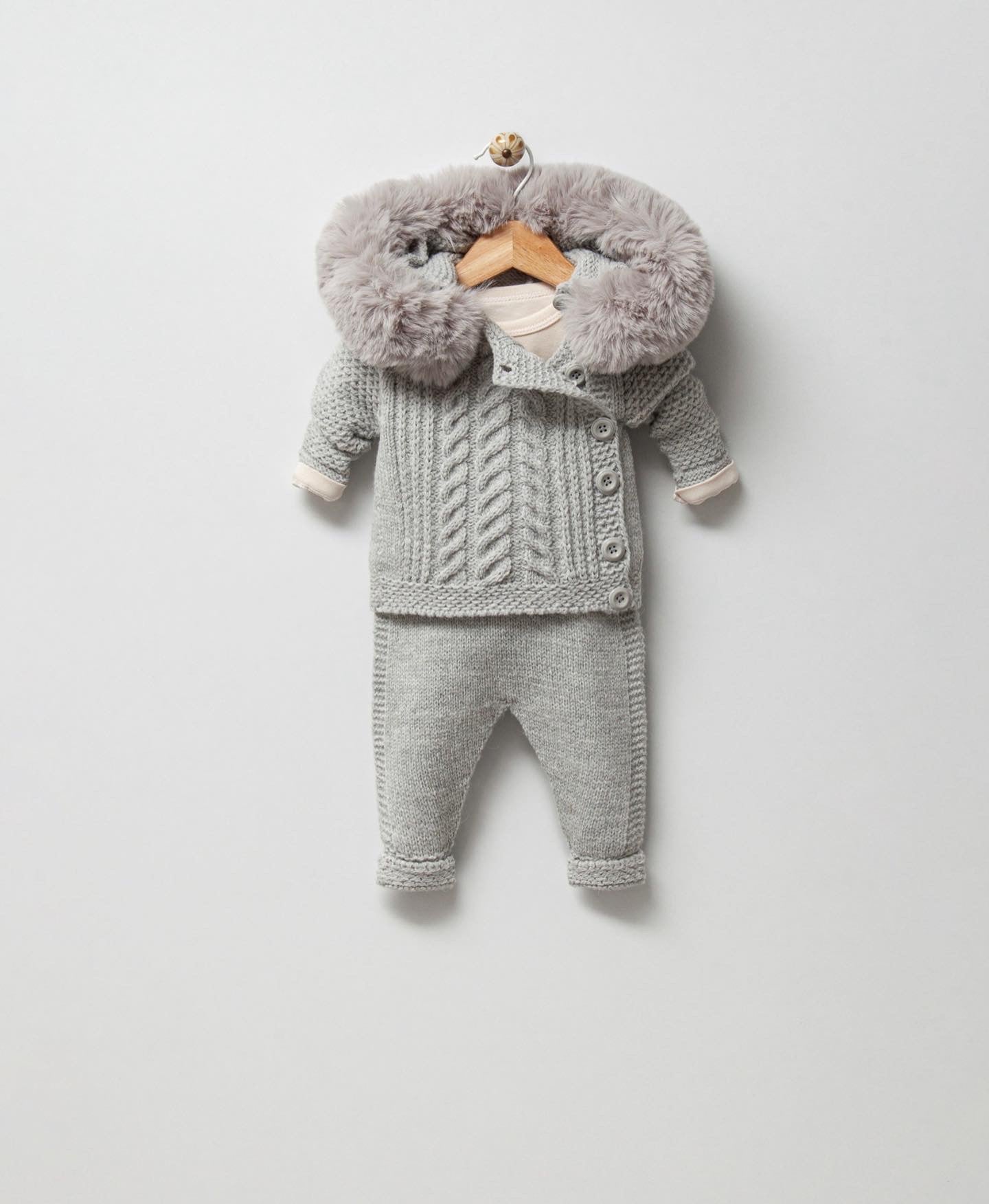 Beautiful Grey Knitted Cardigan/Dungarees/Bodysuit 3 piece set with Synthetic fur trim.