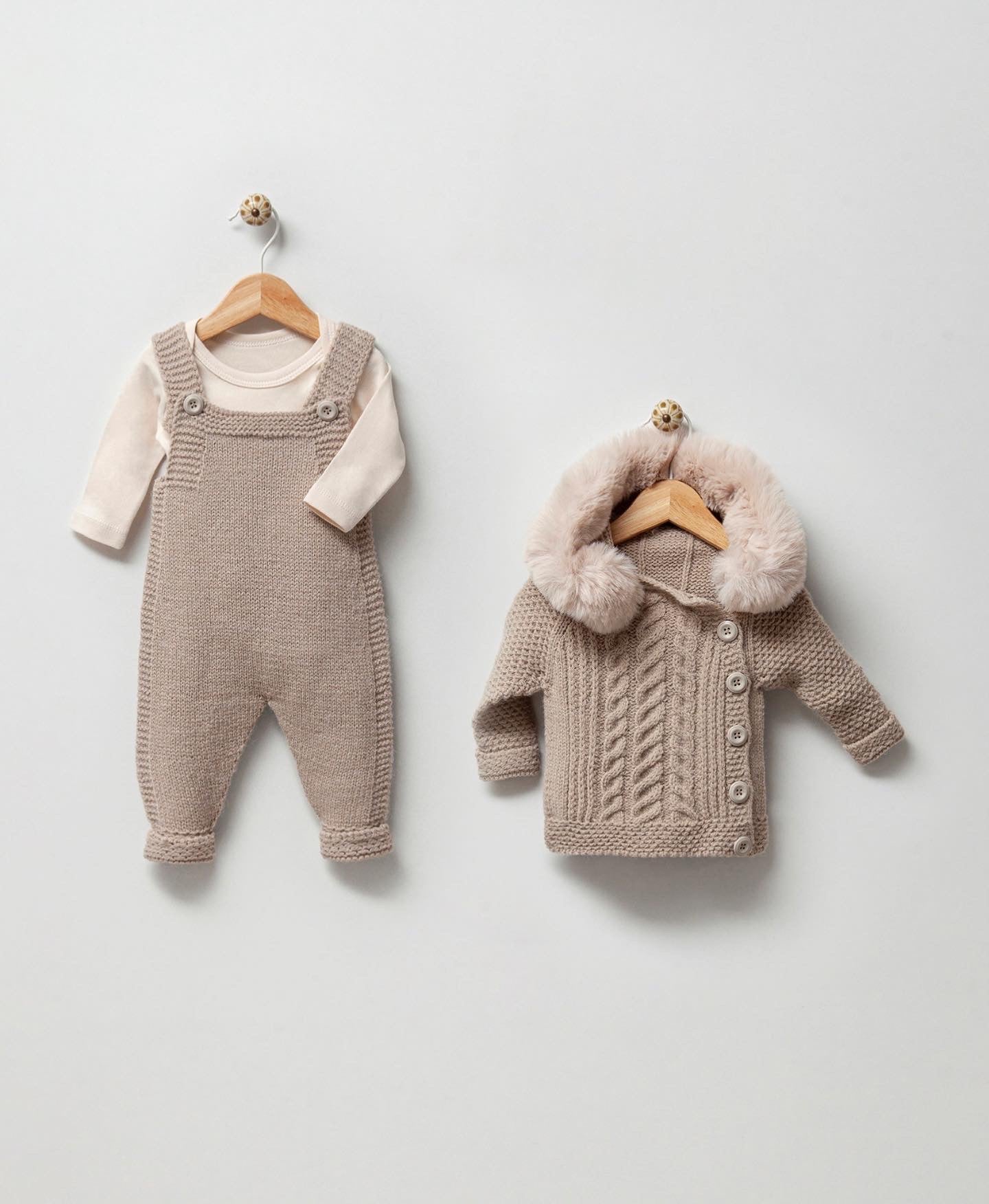 Beautiful Stone Knitted Cardigan/Dungarees/Bodysuit 3 piece set with Synthetic fur trim.