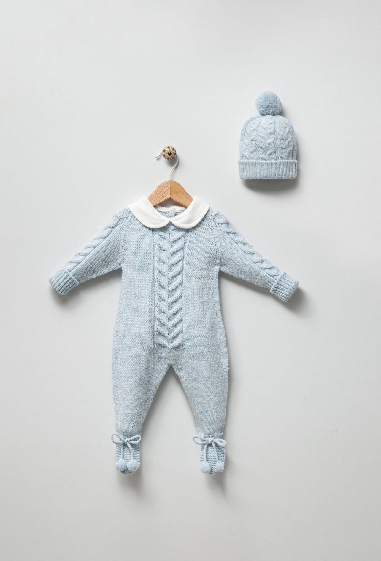 Beautiful Blue Knitted Babygrow/Matching hat 2 piece set.