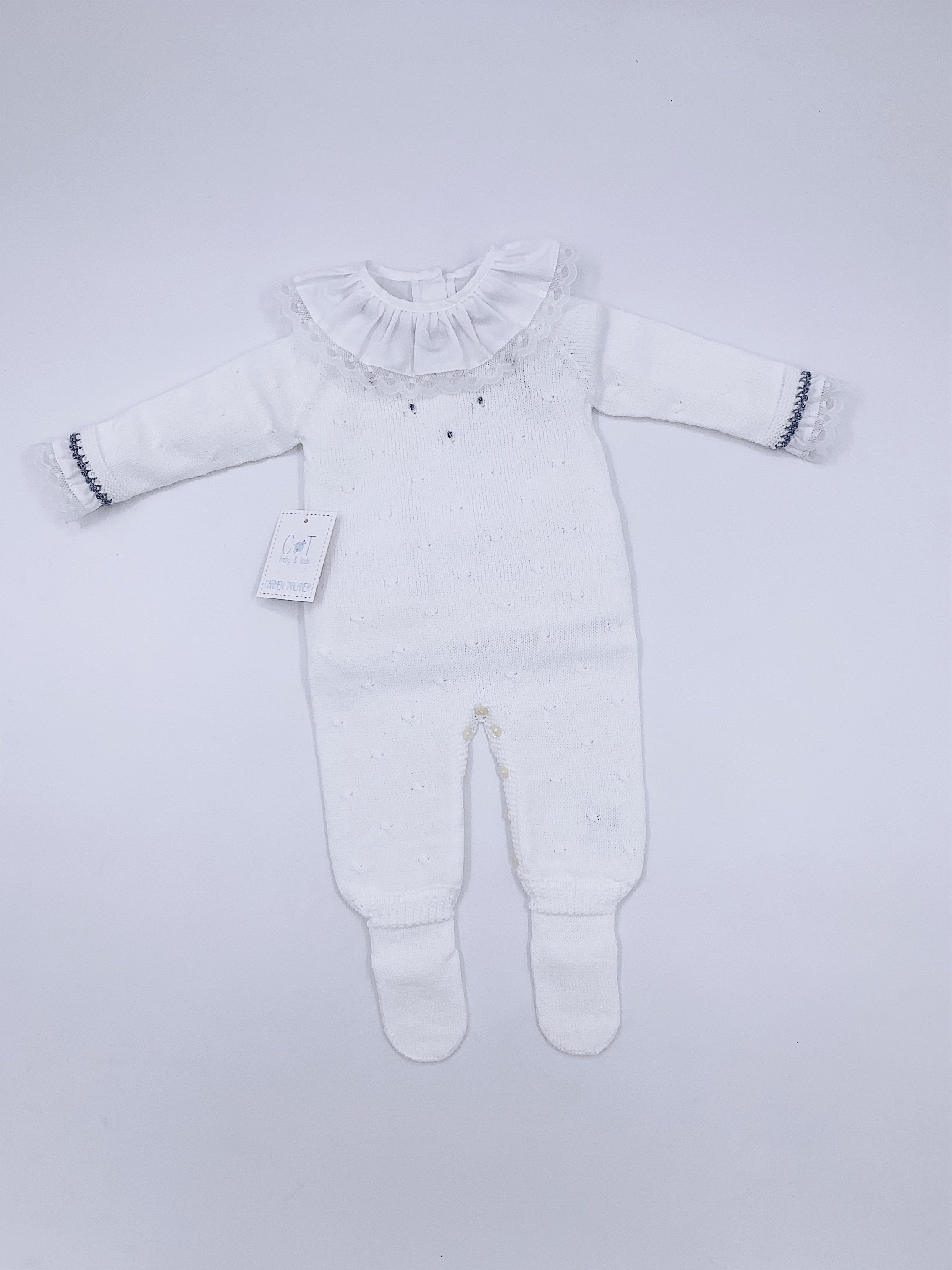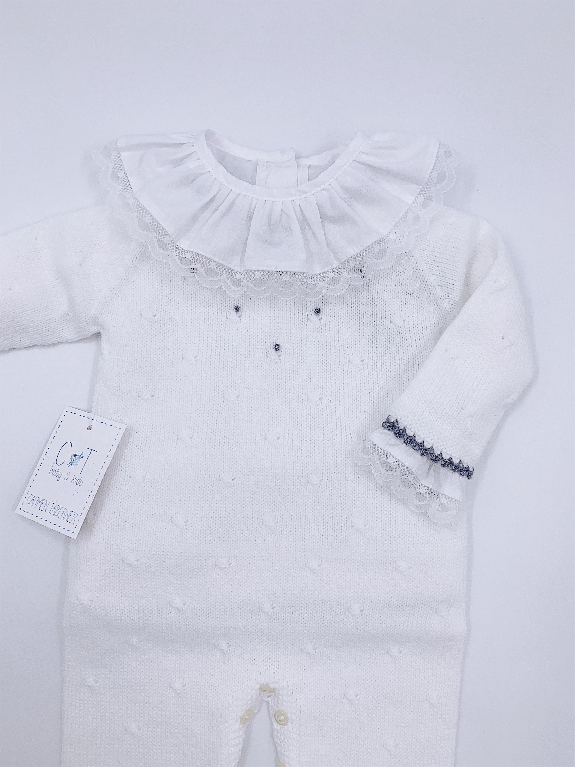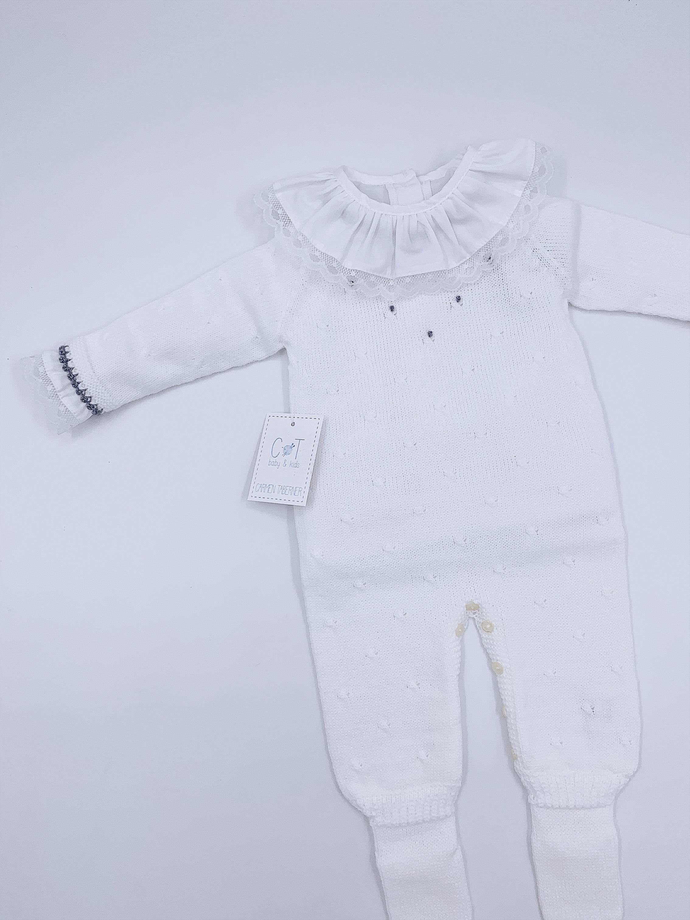 Classic/Timeless White knitted baby grow with grey details.Frilly and Lace details Bodysuit sold separately .