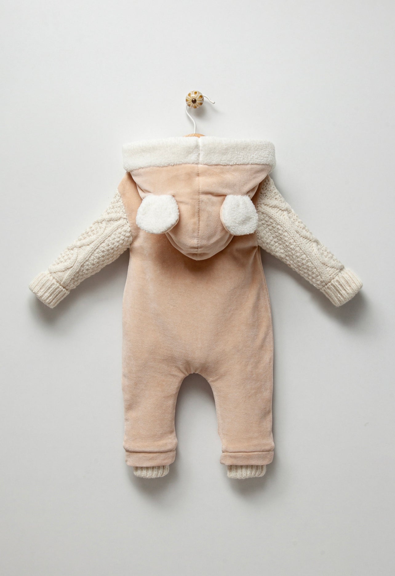 Beautiful Light Beige Velure pramsuit with ivory knitted details.