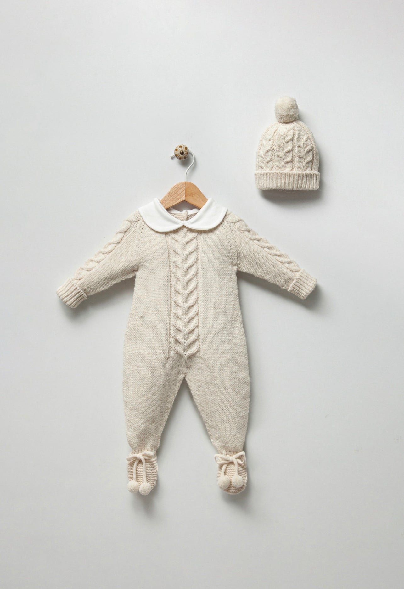 Beautiful Ivory Knitted Babygrow/Matching hat 2 piece set
