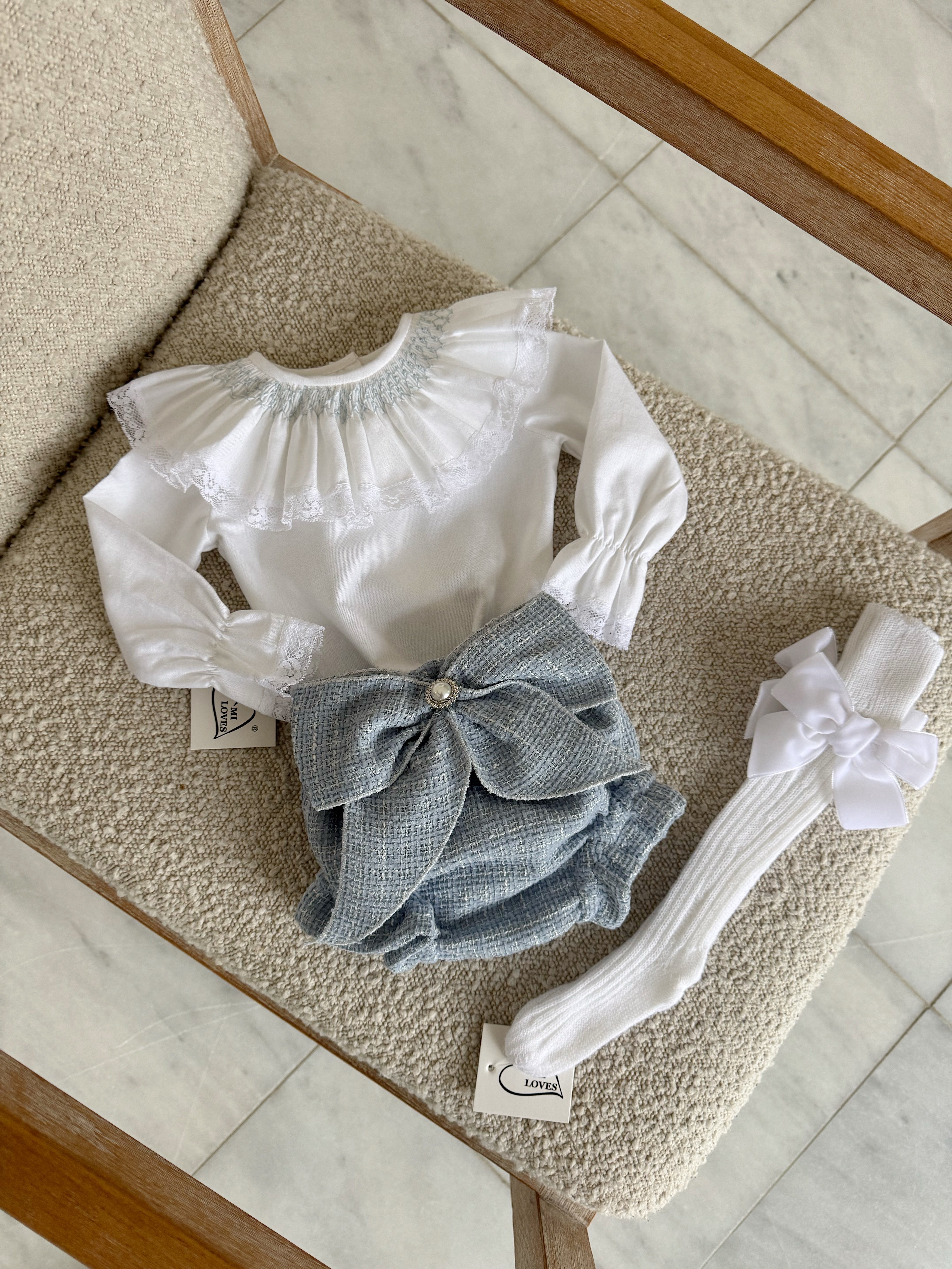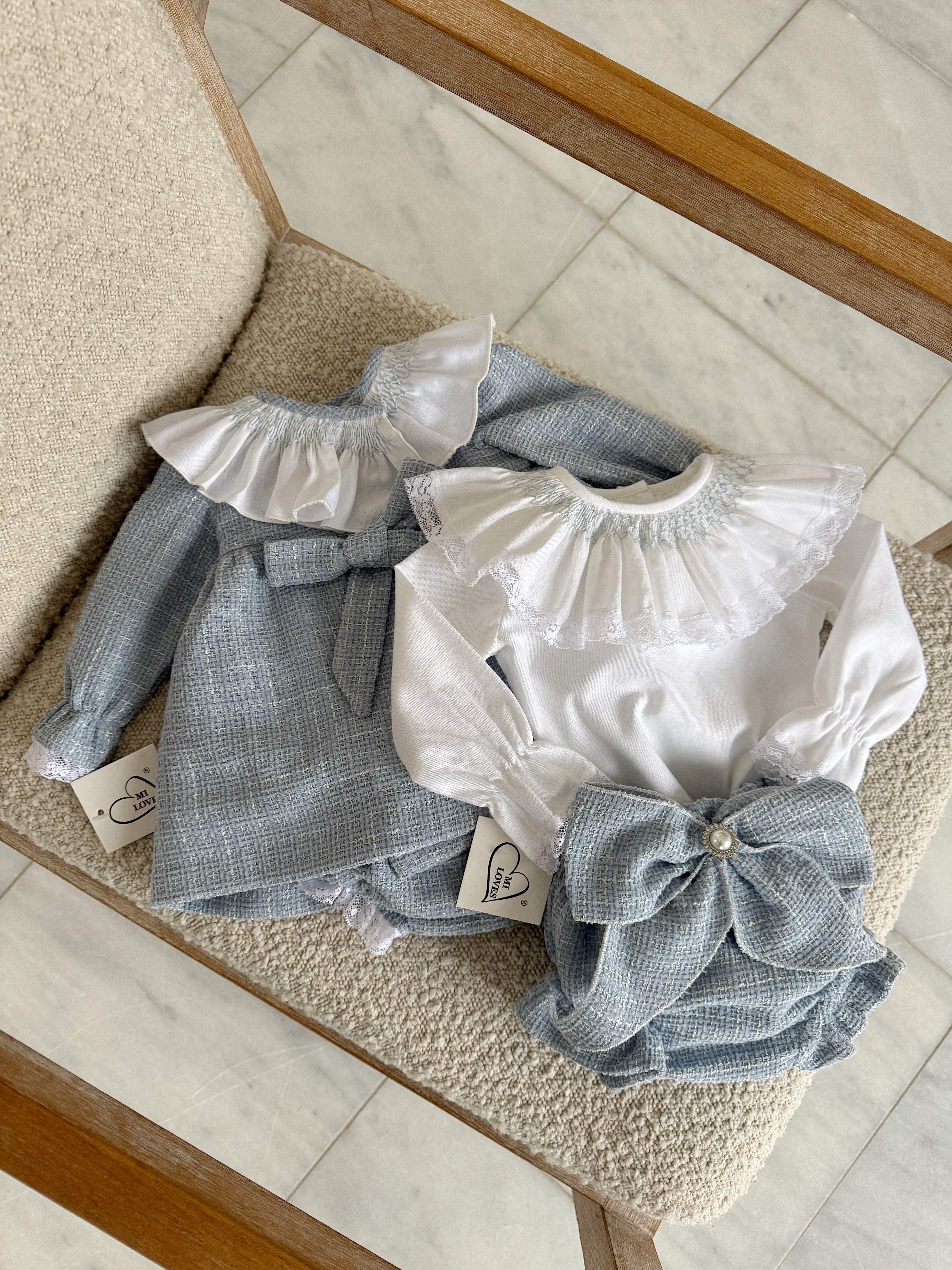 Beautiful Baby blue Tweed Bloomers and Hand Smoked Shirt 2 piece set.