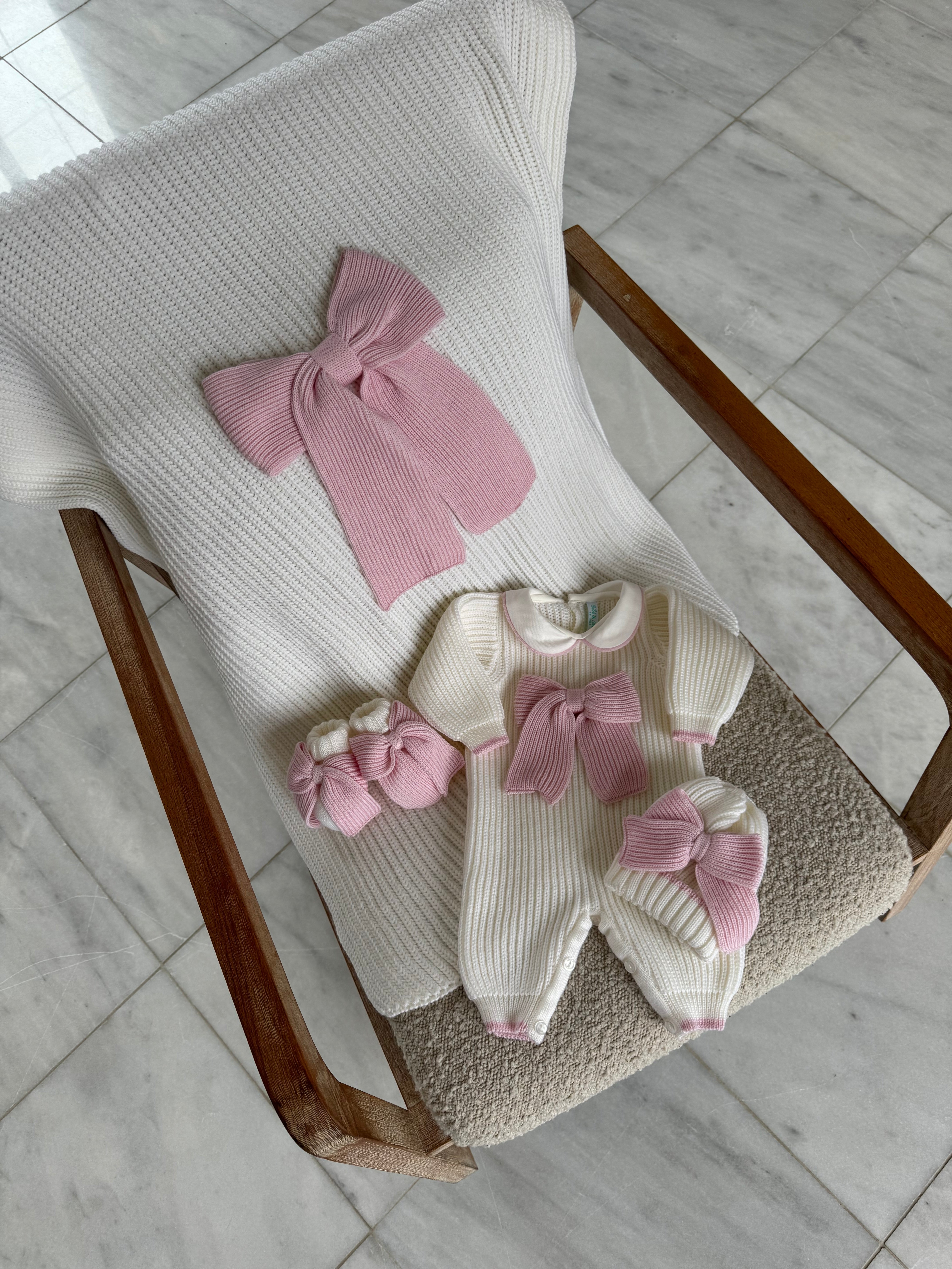 Beautiful knitted Merino Wool Ivory/White Baby Girl Romper with Bow details.