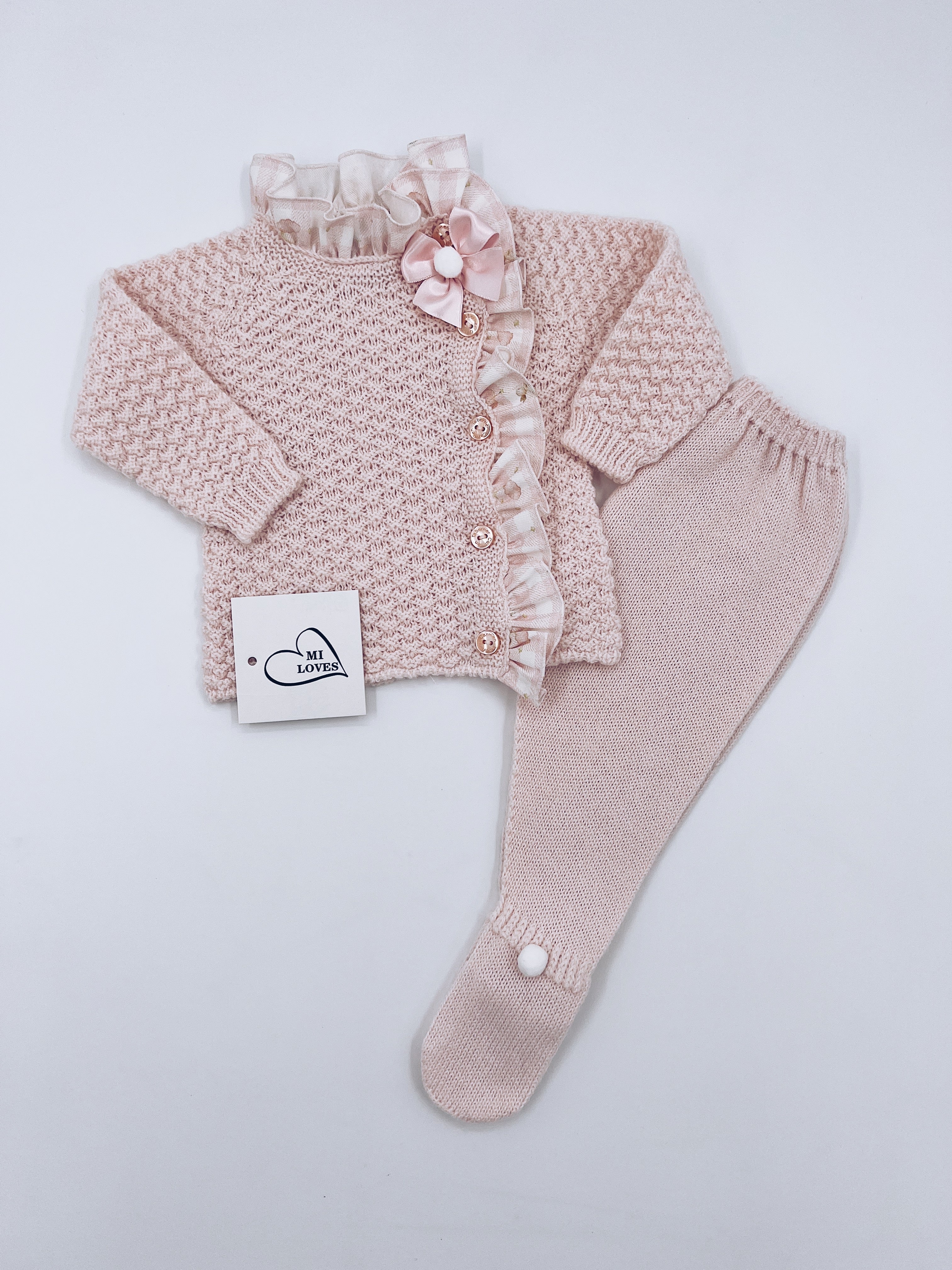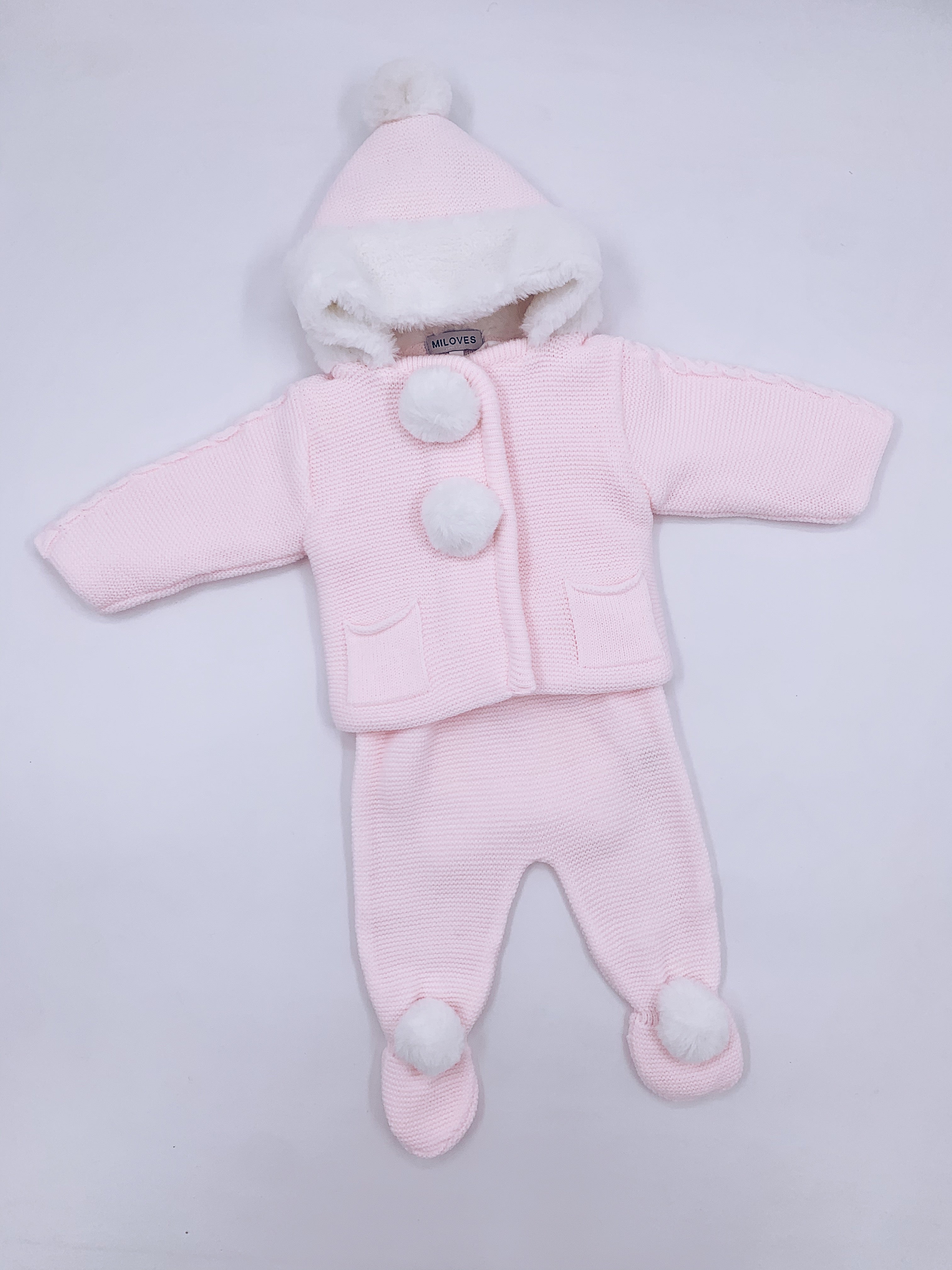 Beautiful MI LOVES Signature knitted 2 piece baby sets with pom-poms