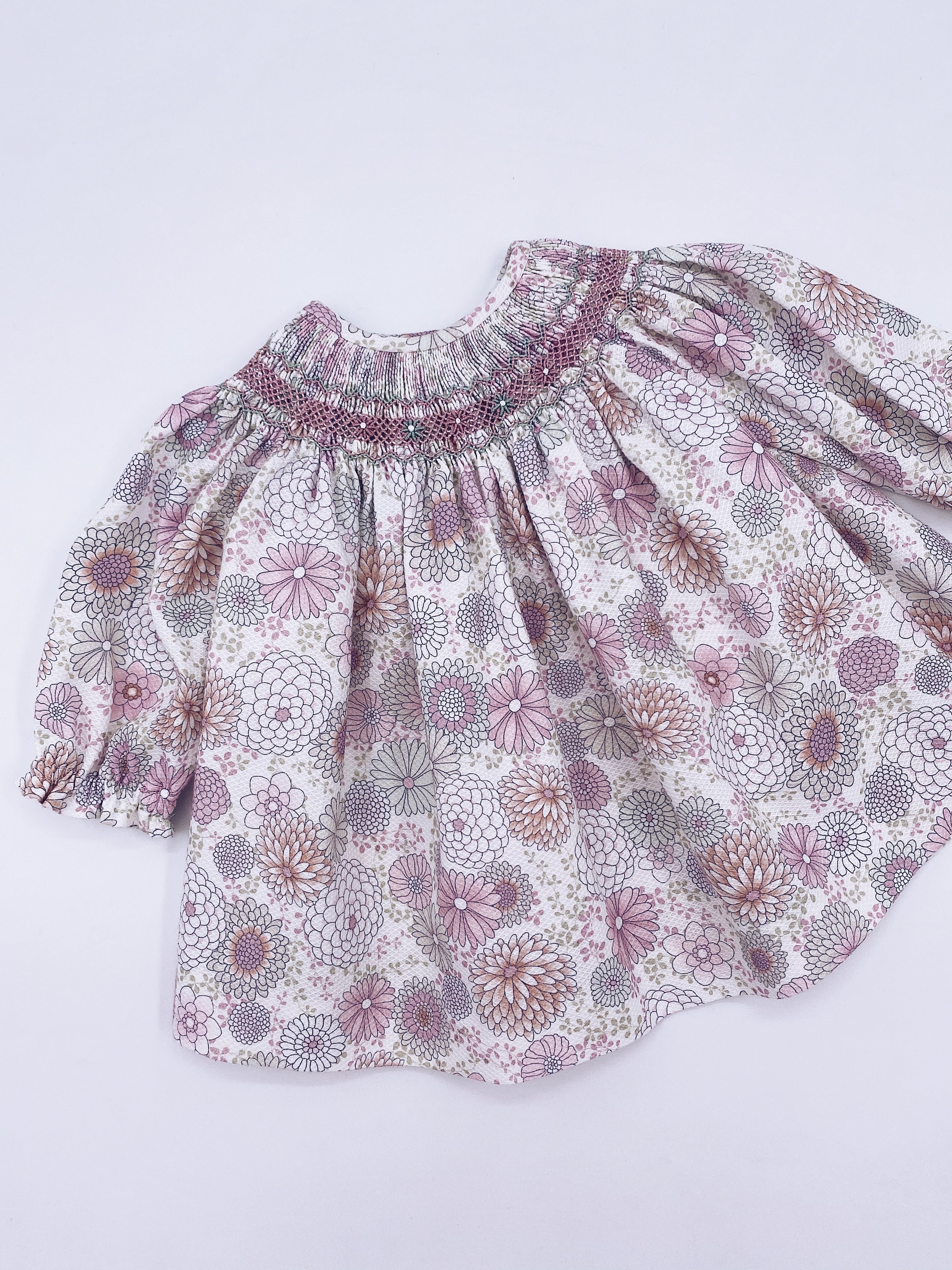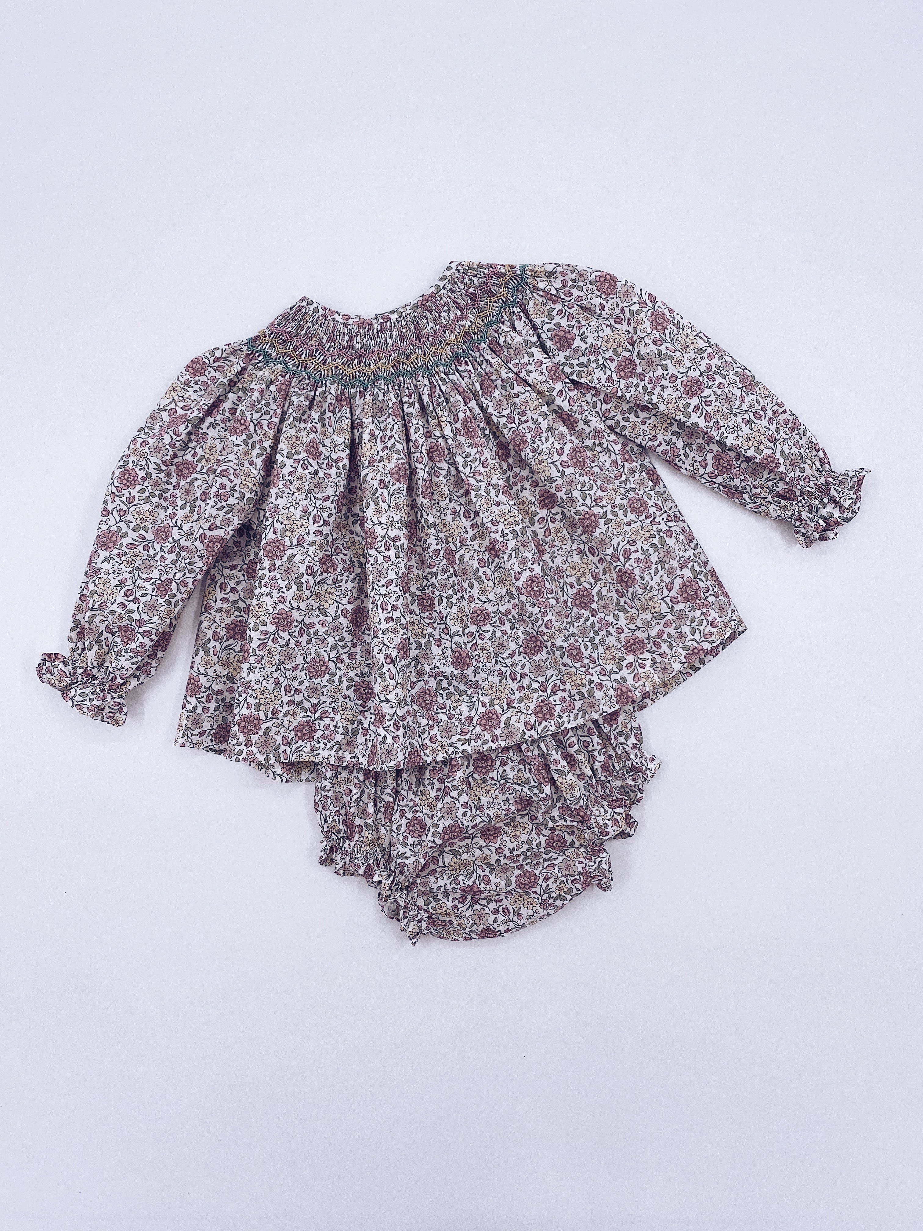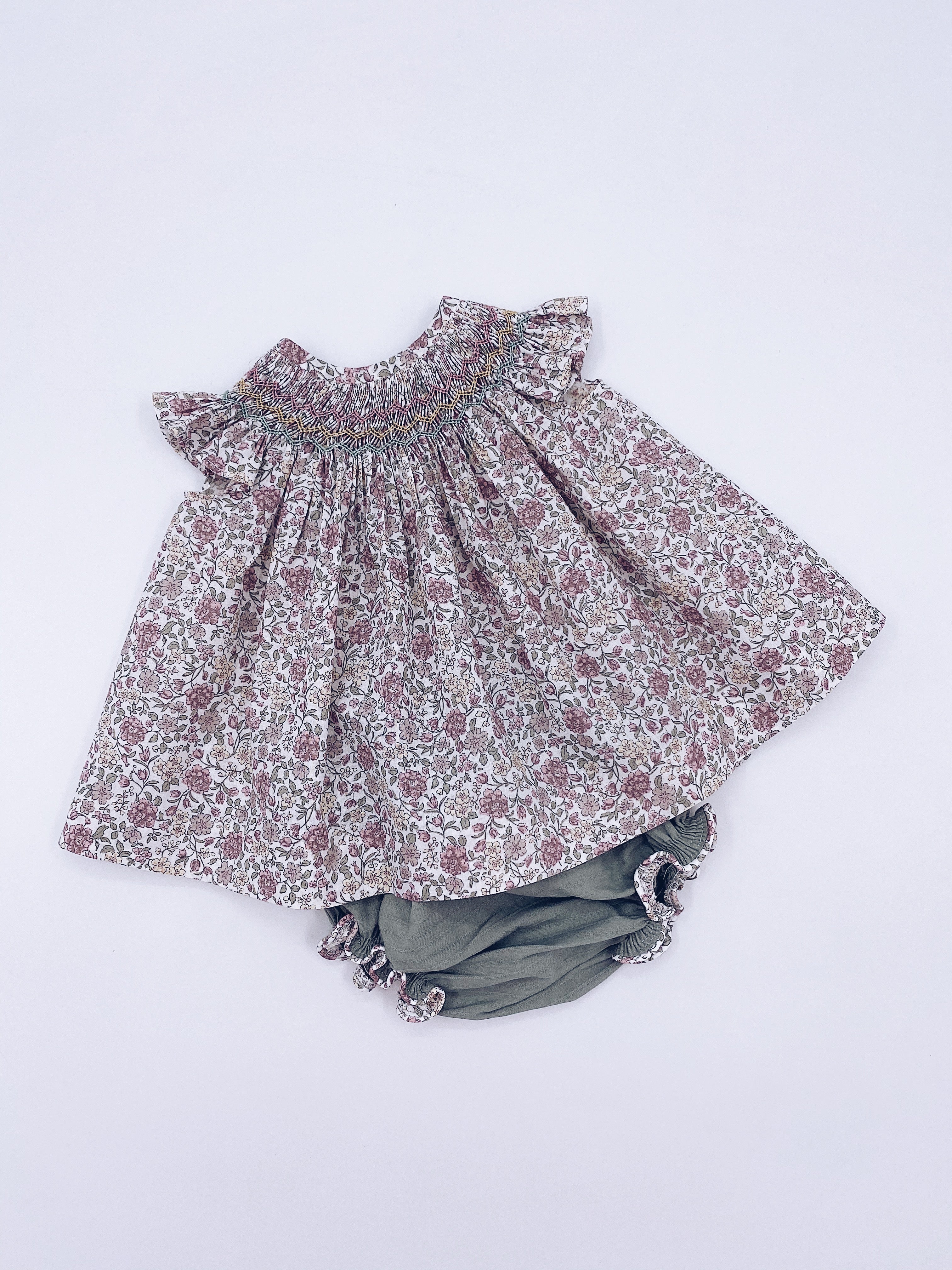 Beautiful floral dress/bloomers 2 piece set with hand smoking details.