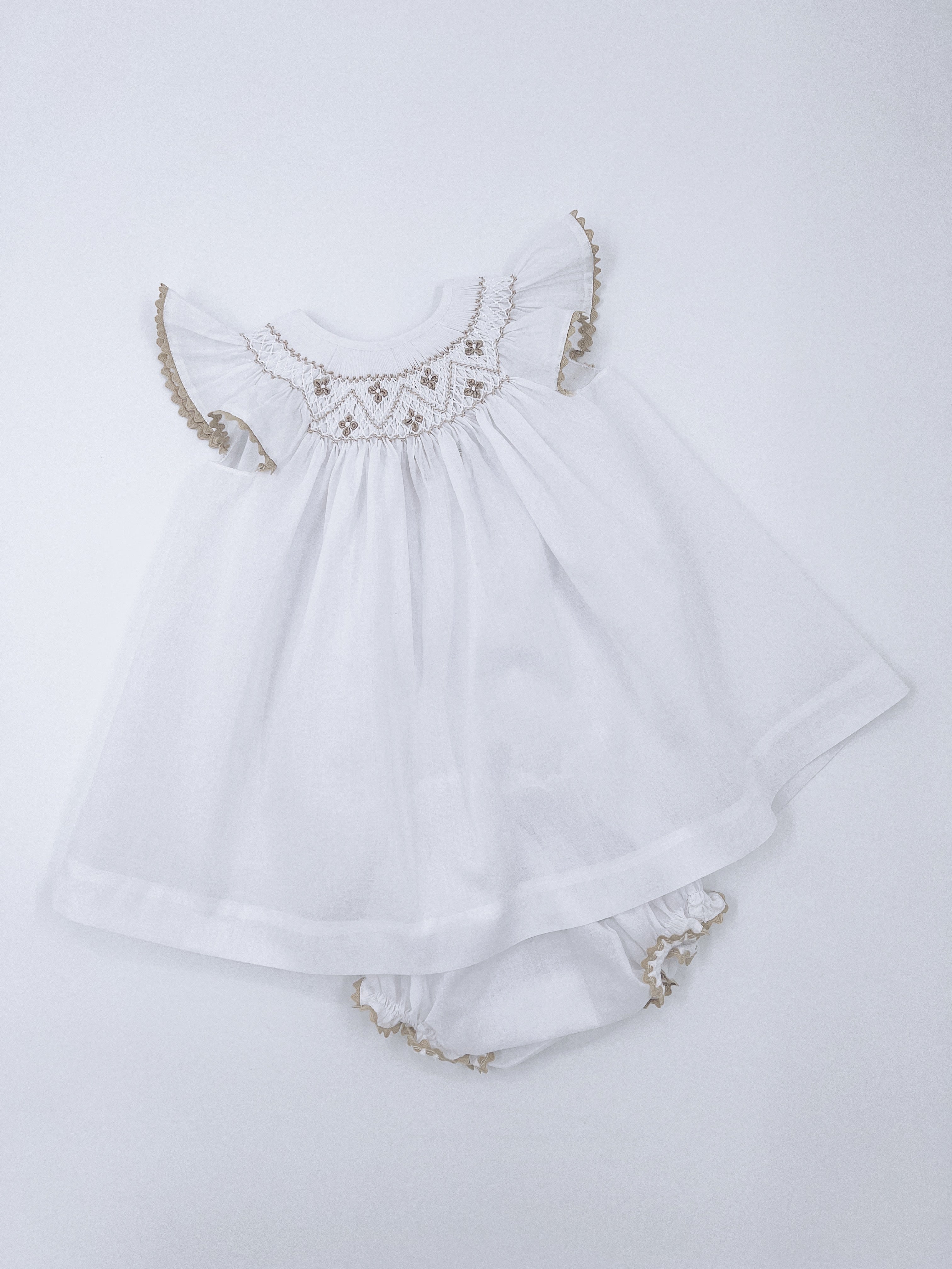 Beautiful White Dress/Bloomers set with Hand Smoked Details.
