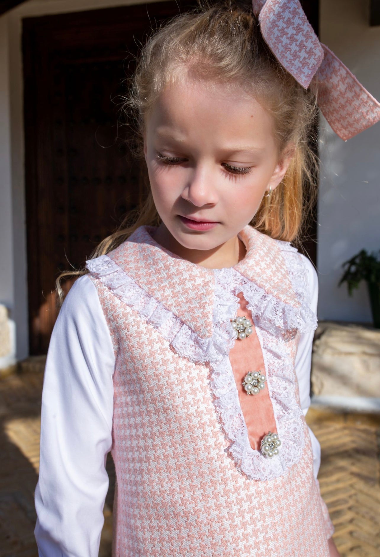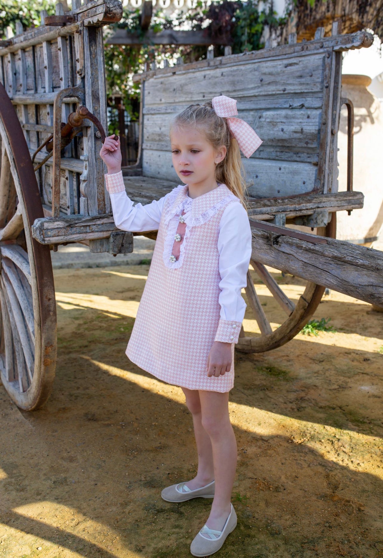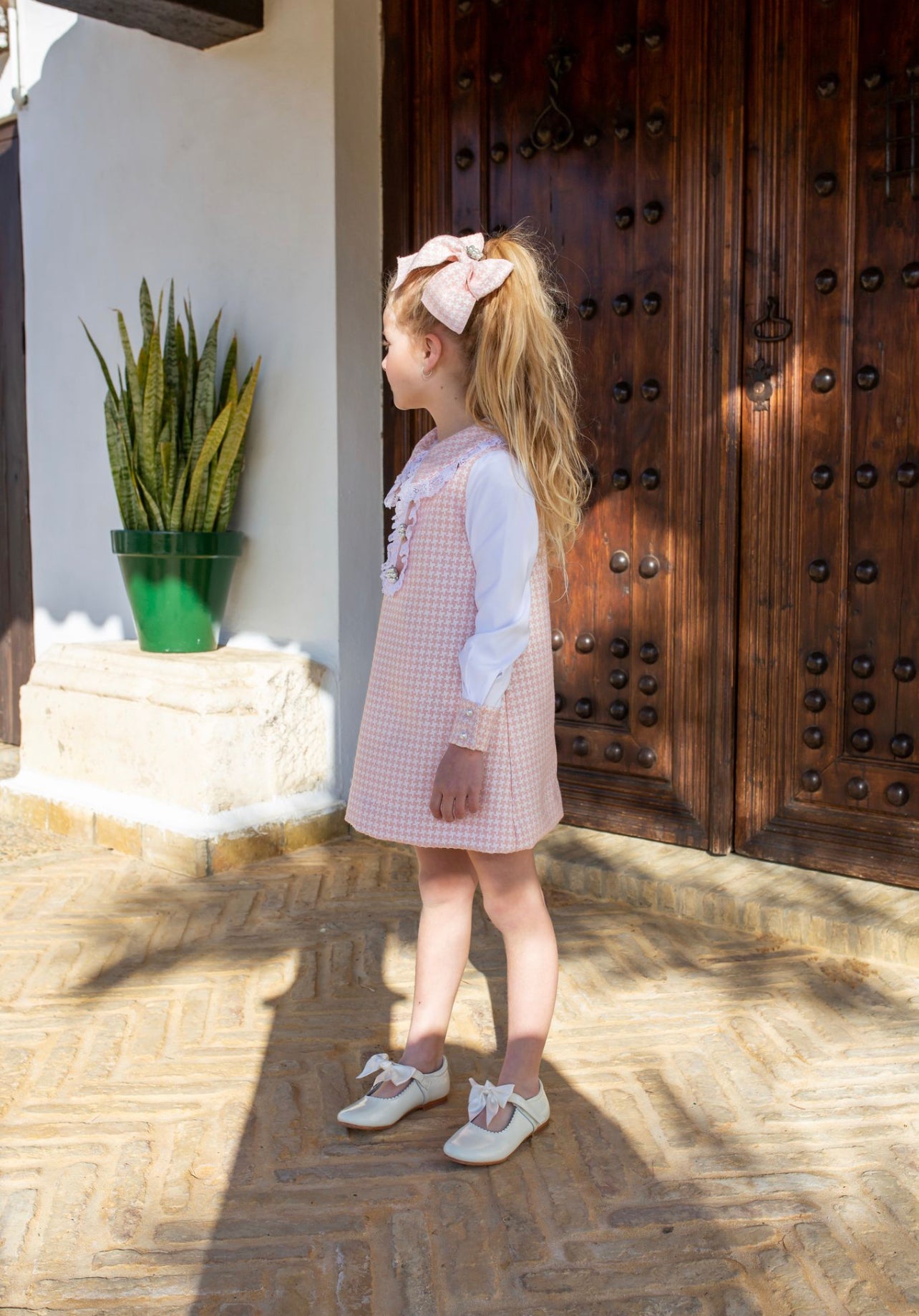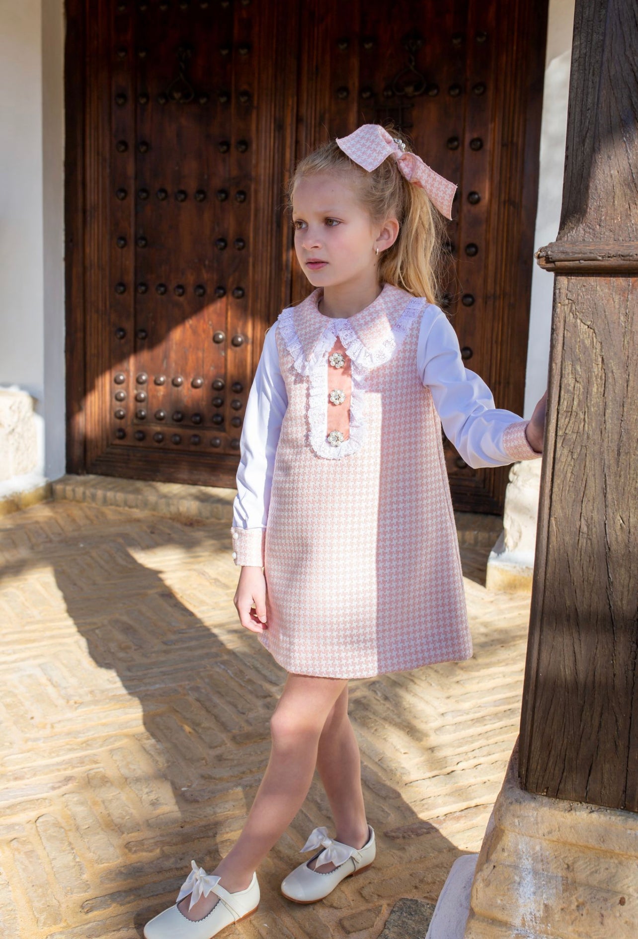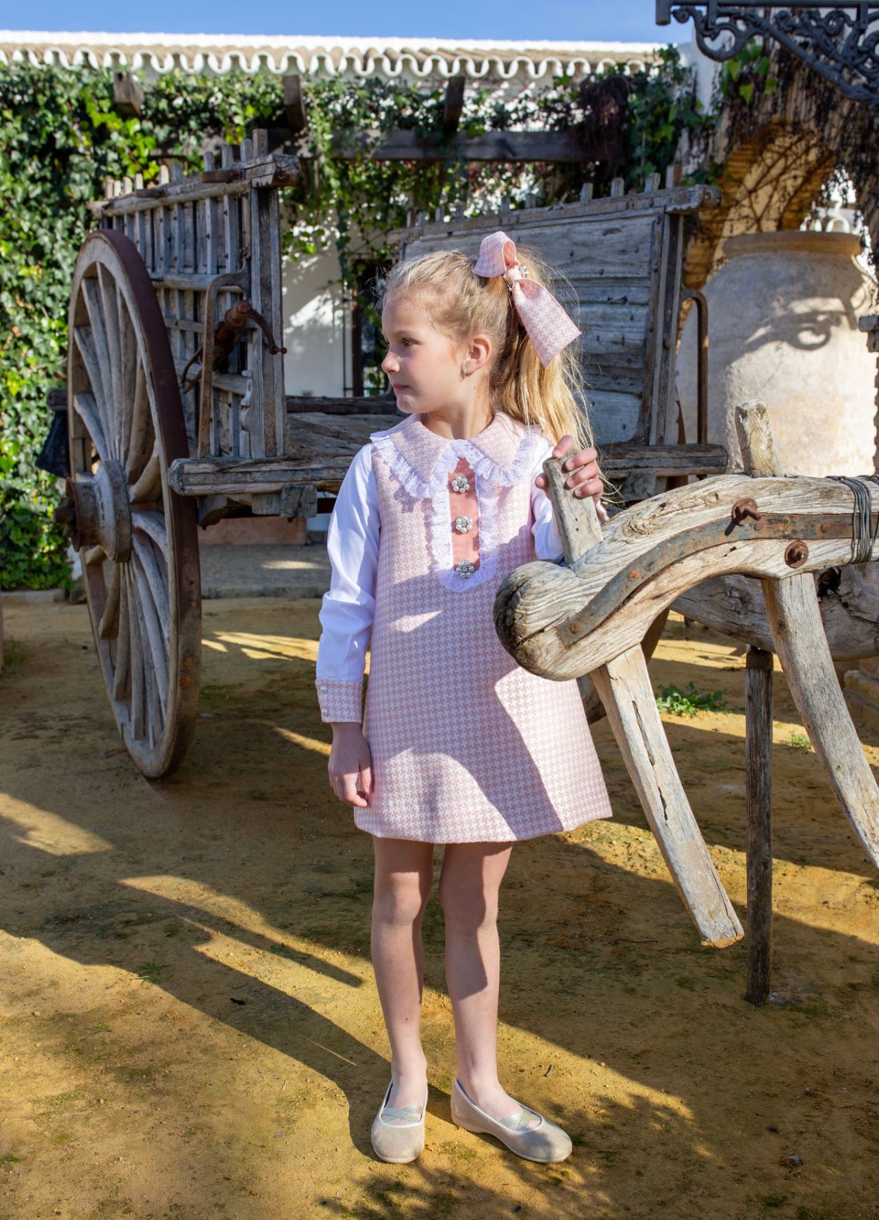 Beautiful Classic Pink Hounds tooth A Line Dress with Beautiful white frill details.