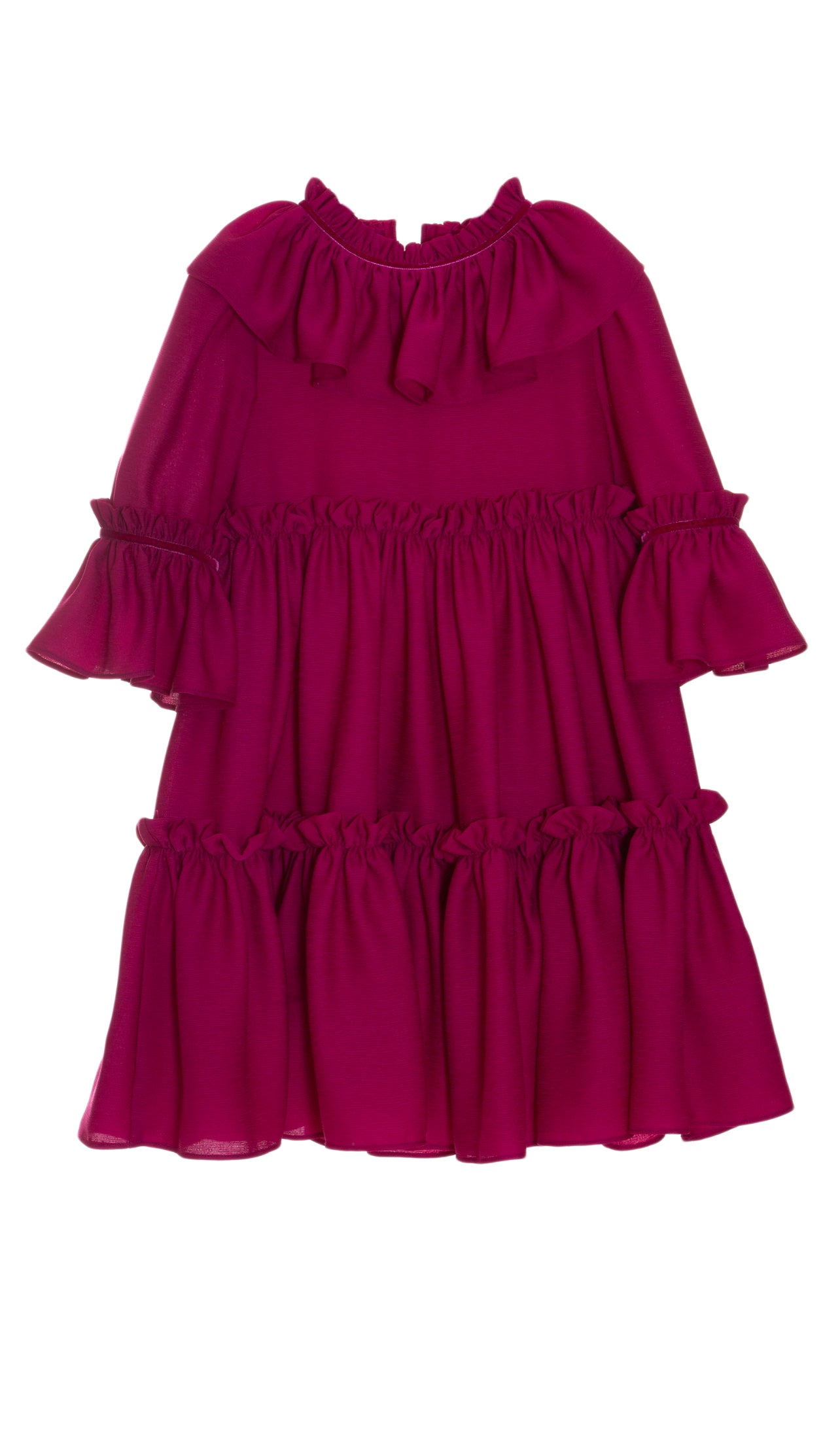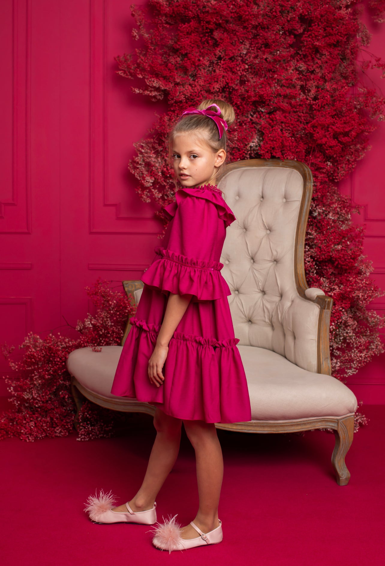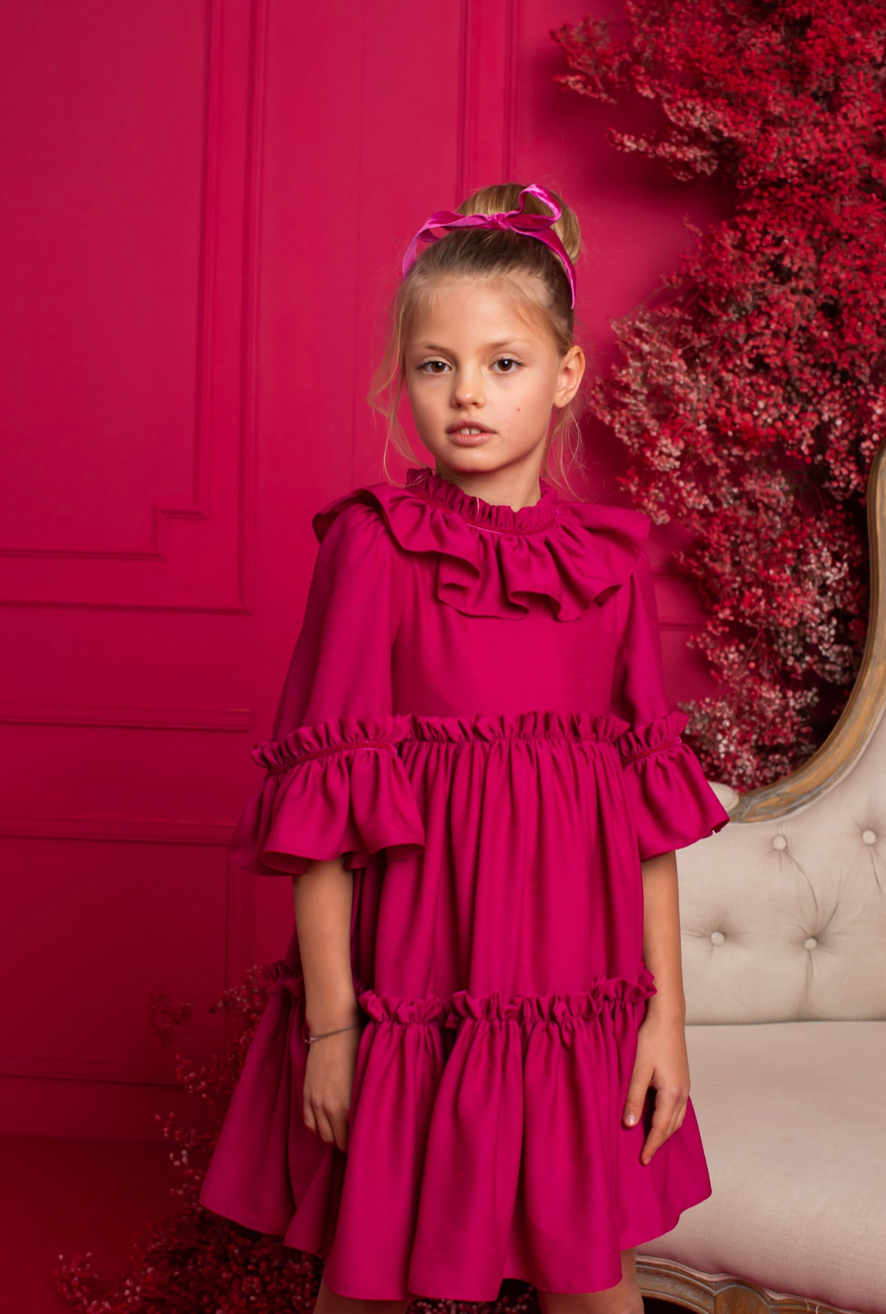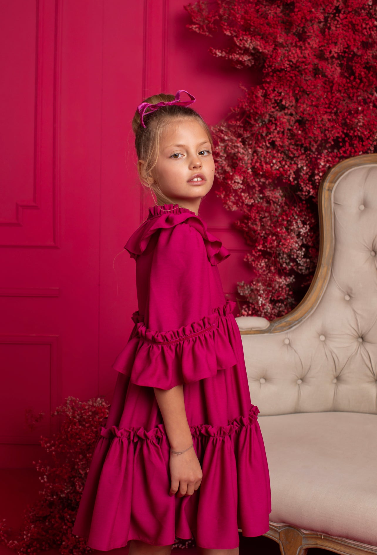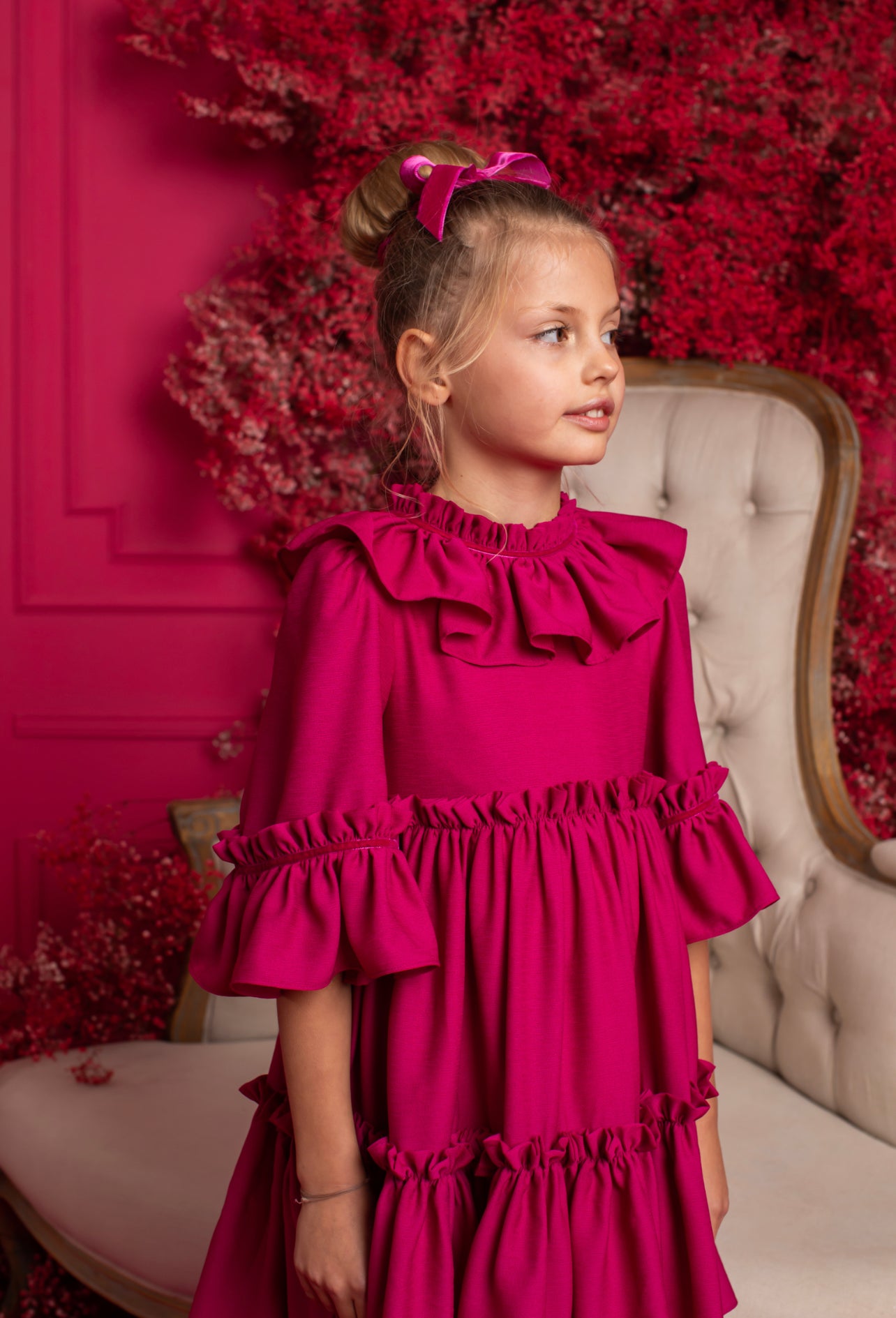 Beautiful Fuchsia Pink Crepe Dress with Ruffled Collar details,