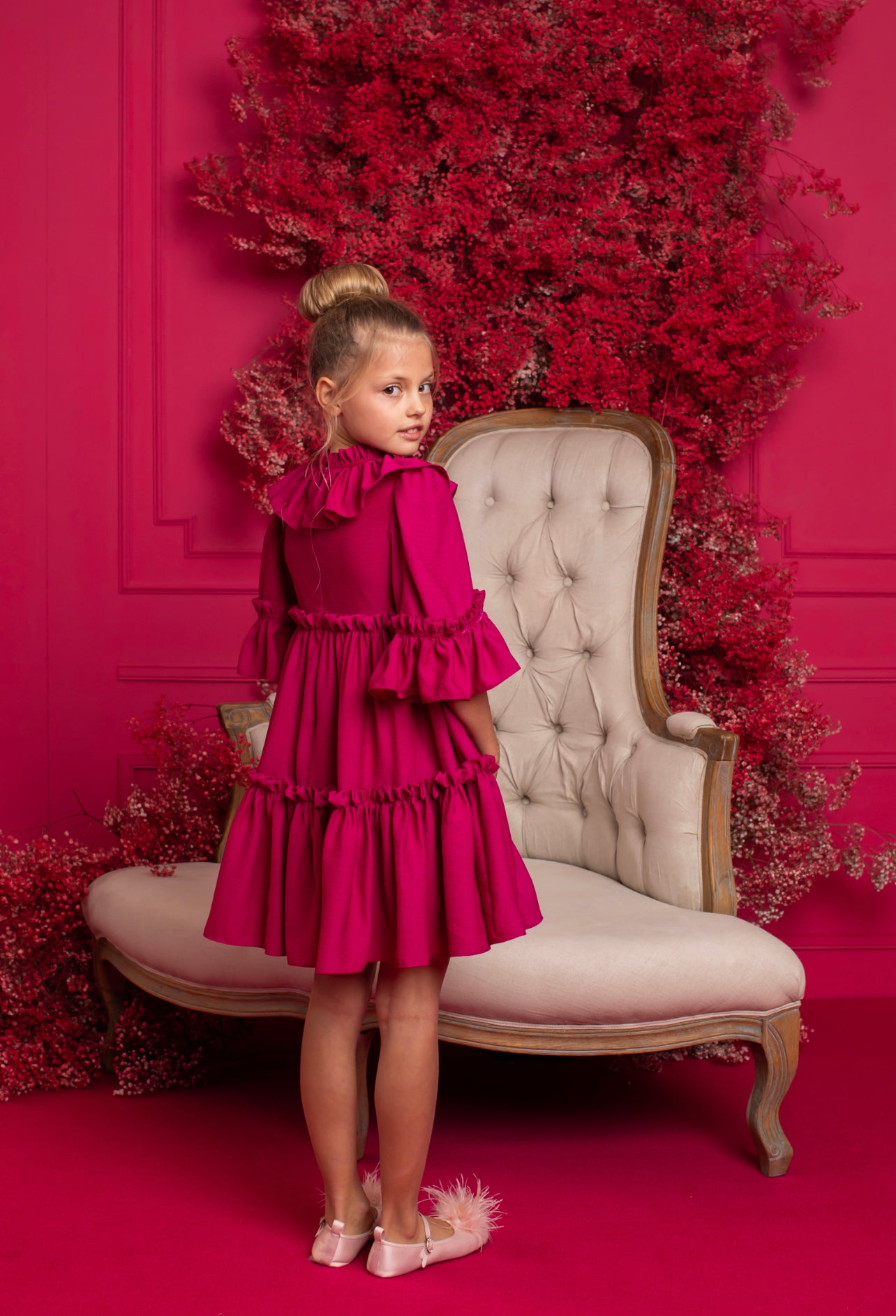 Beautiful Fuchsia Pink Crepe Dress with Ruffled Collar details.Beautiful,Classic and Feminine design that doesn't go out of style.