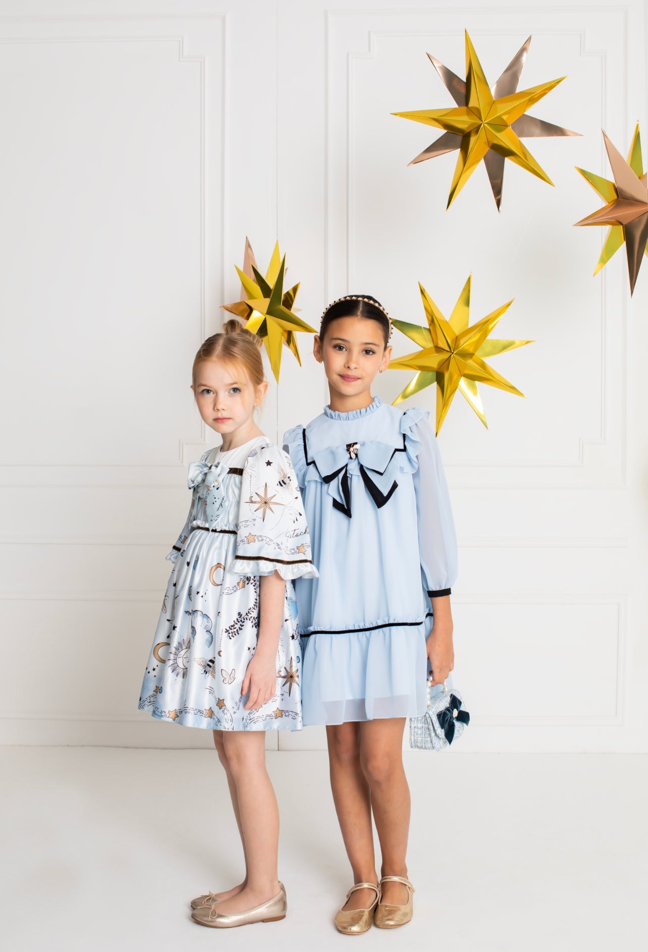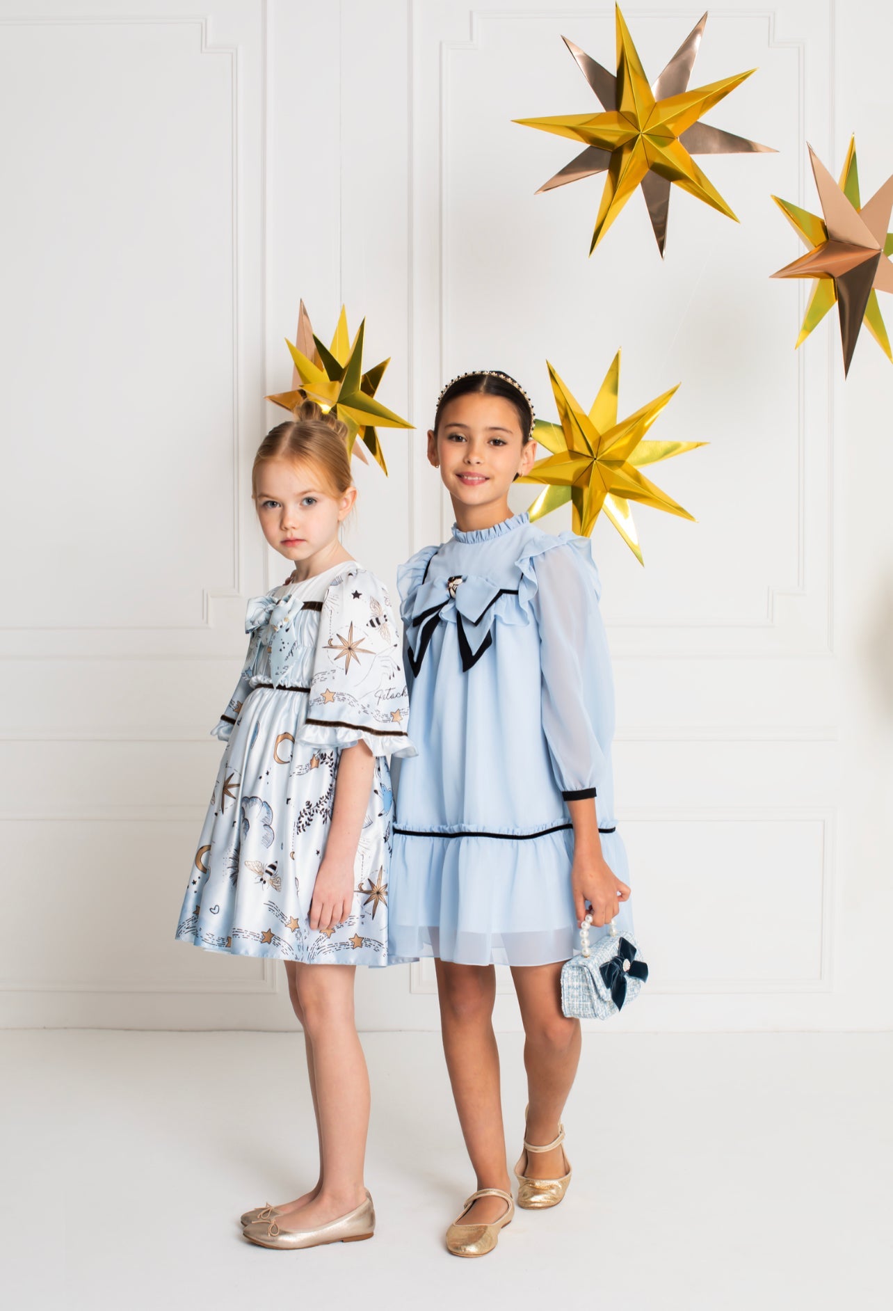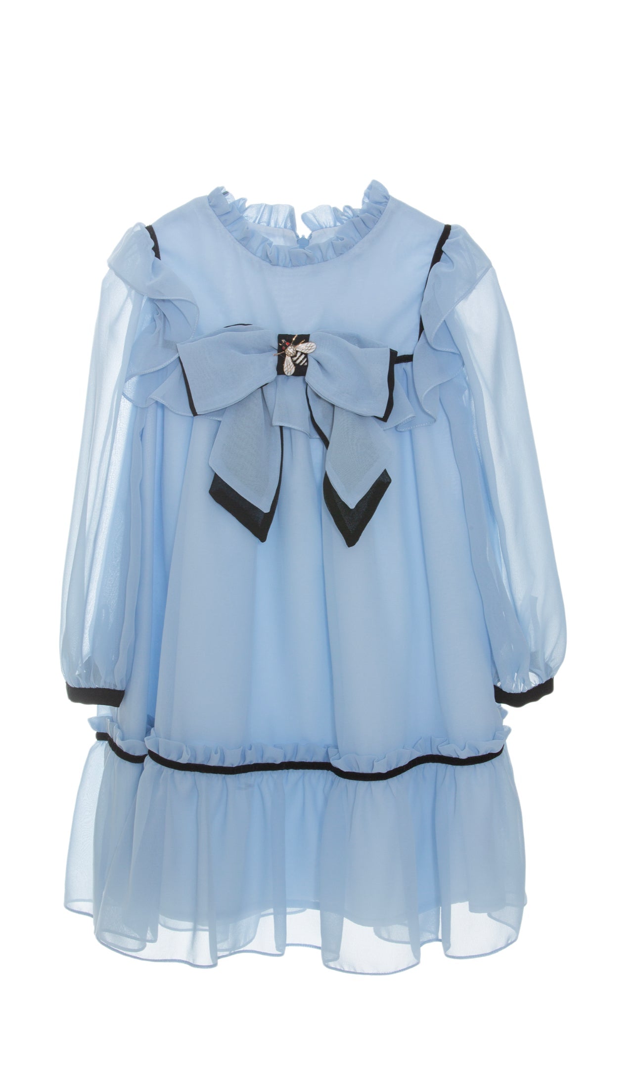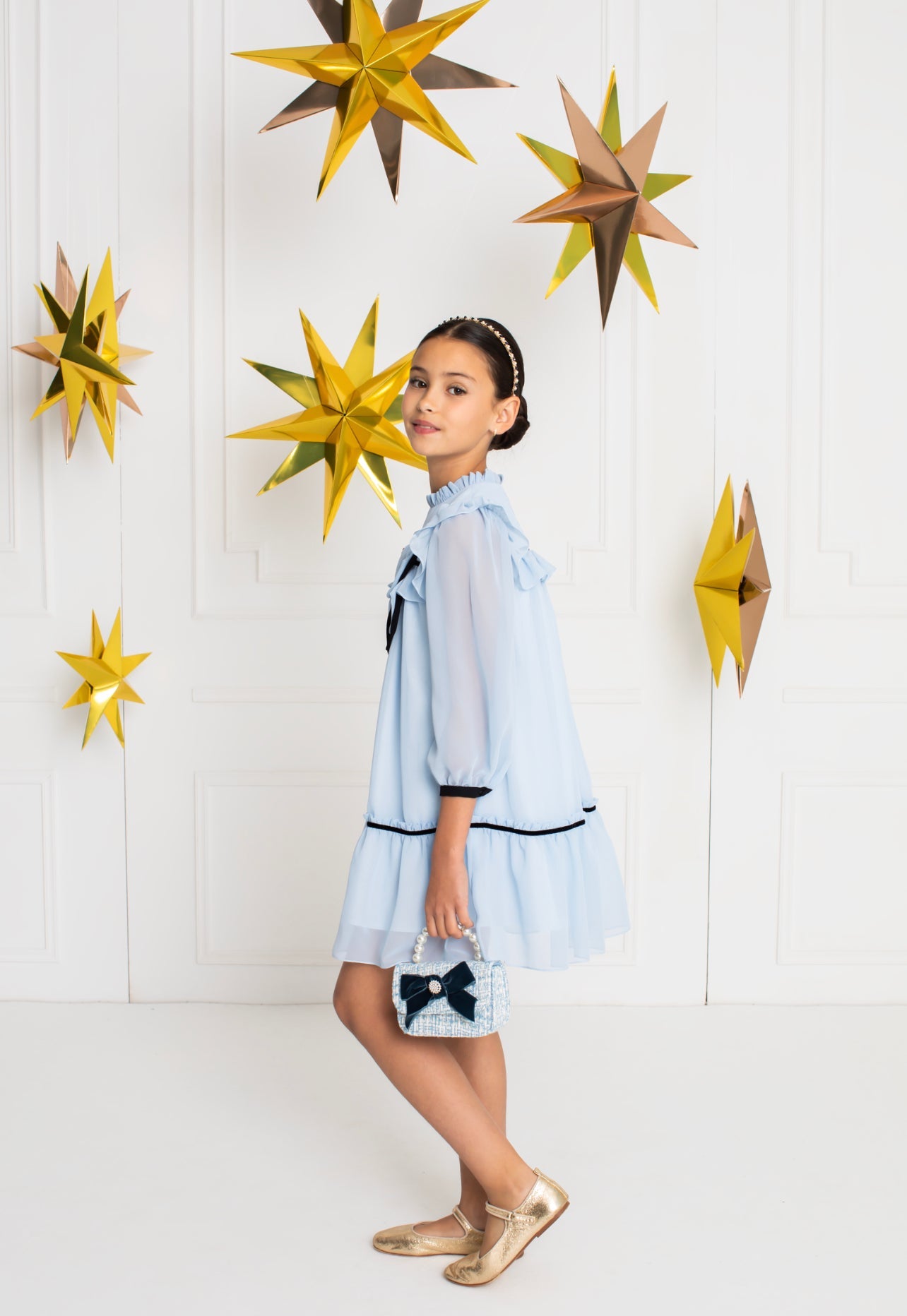 Beautiful Pale Blue chiffon dress with ruffle and Bow details.