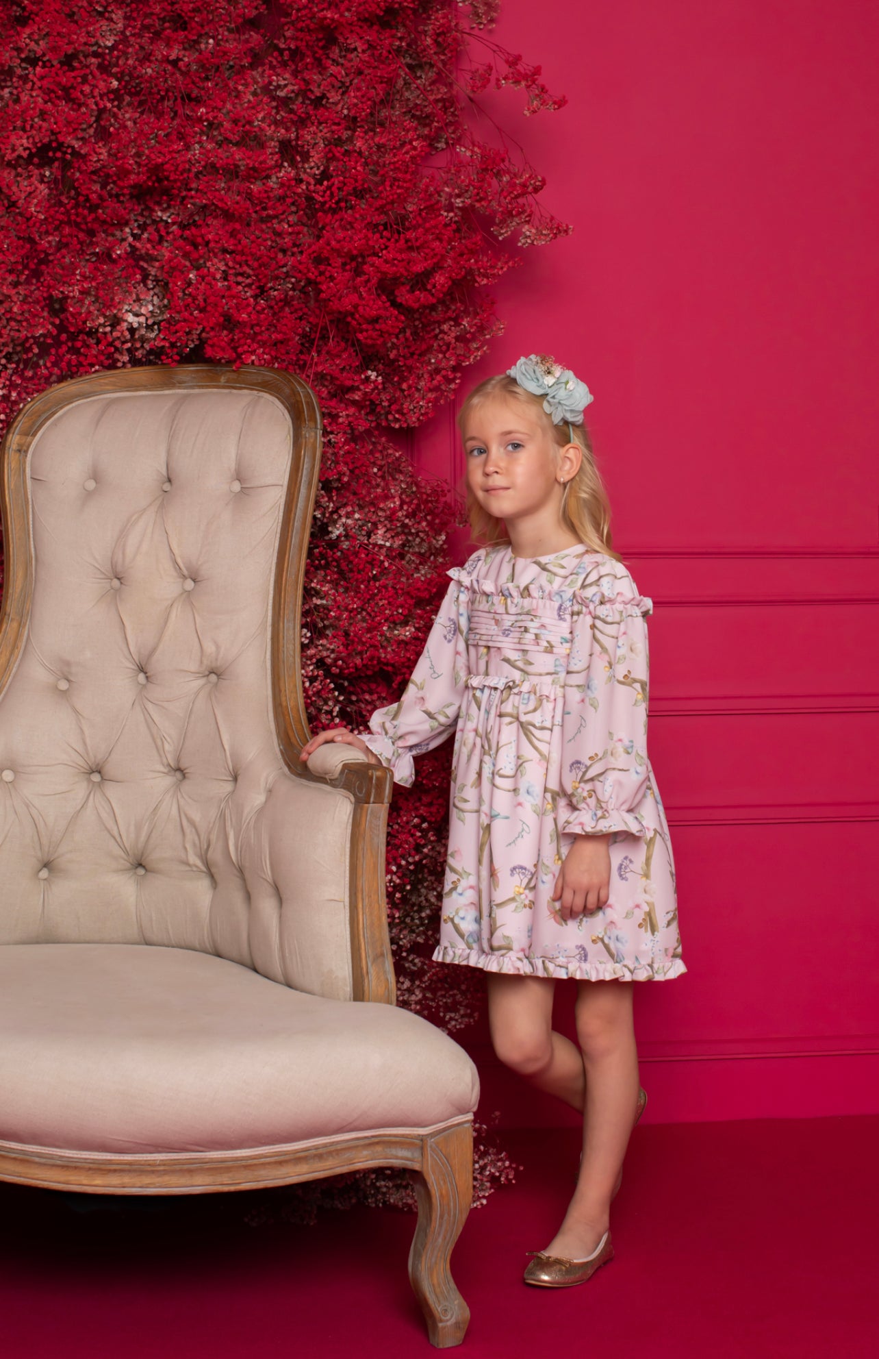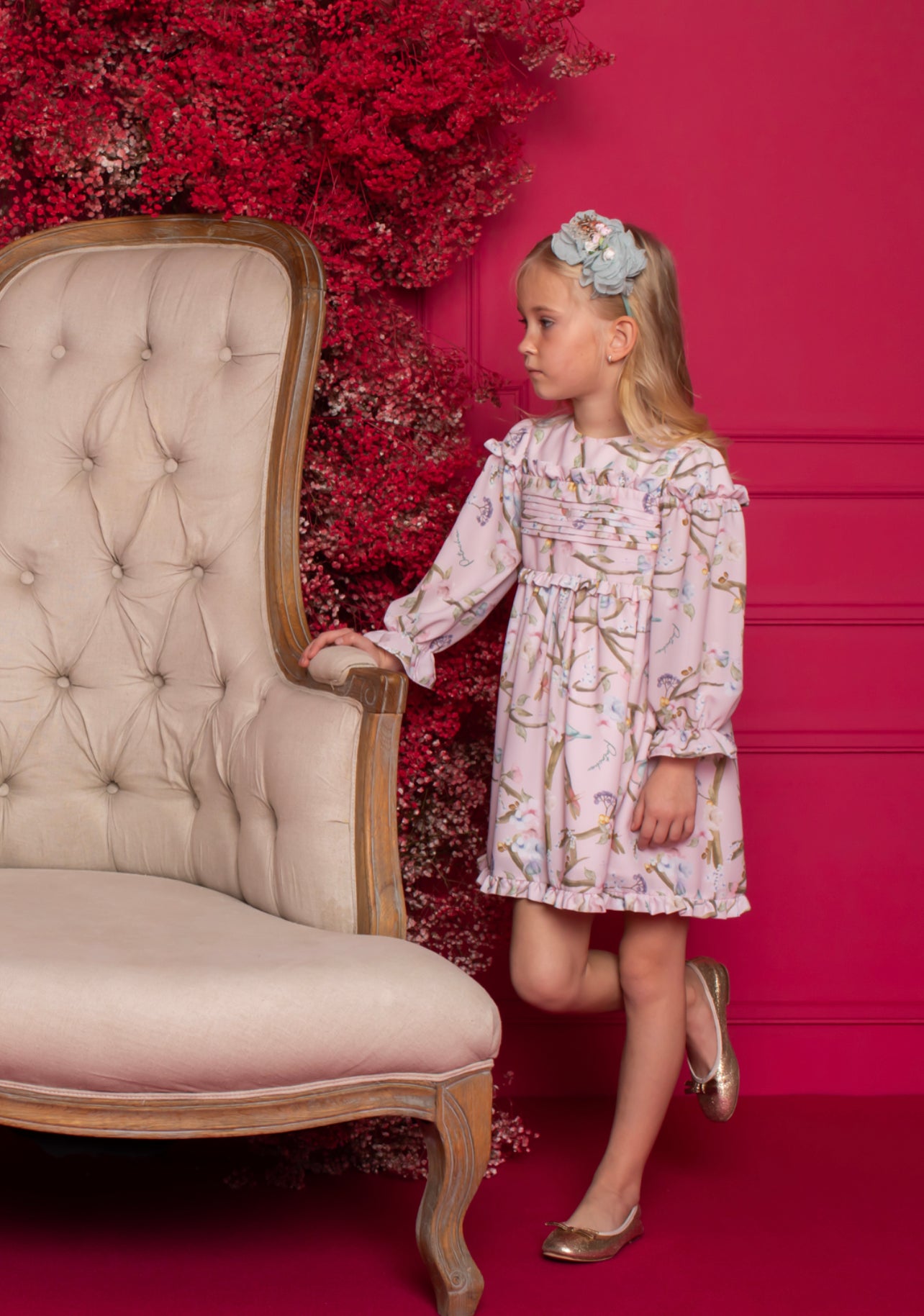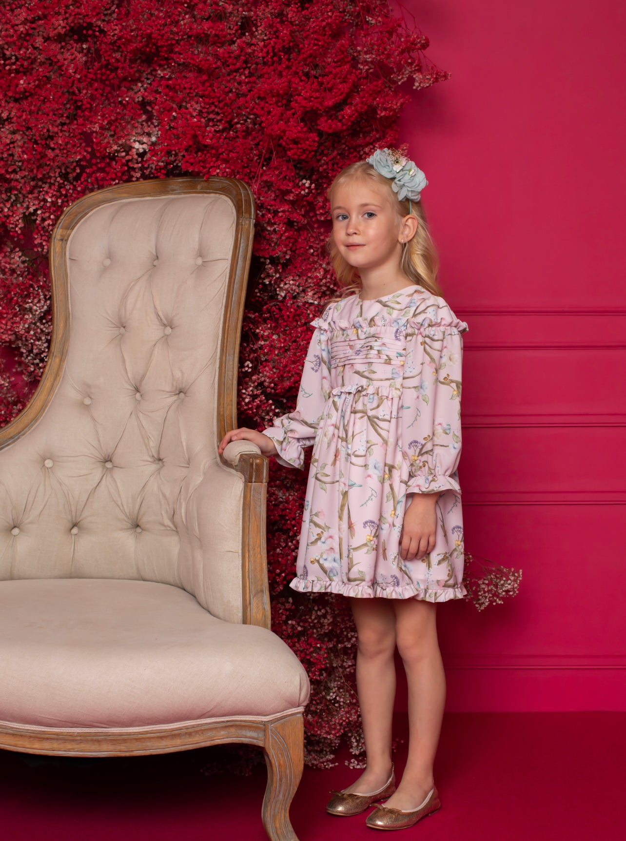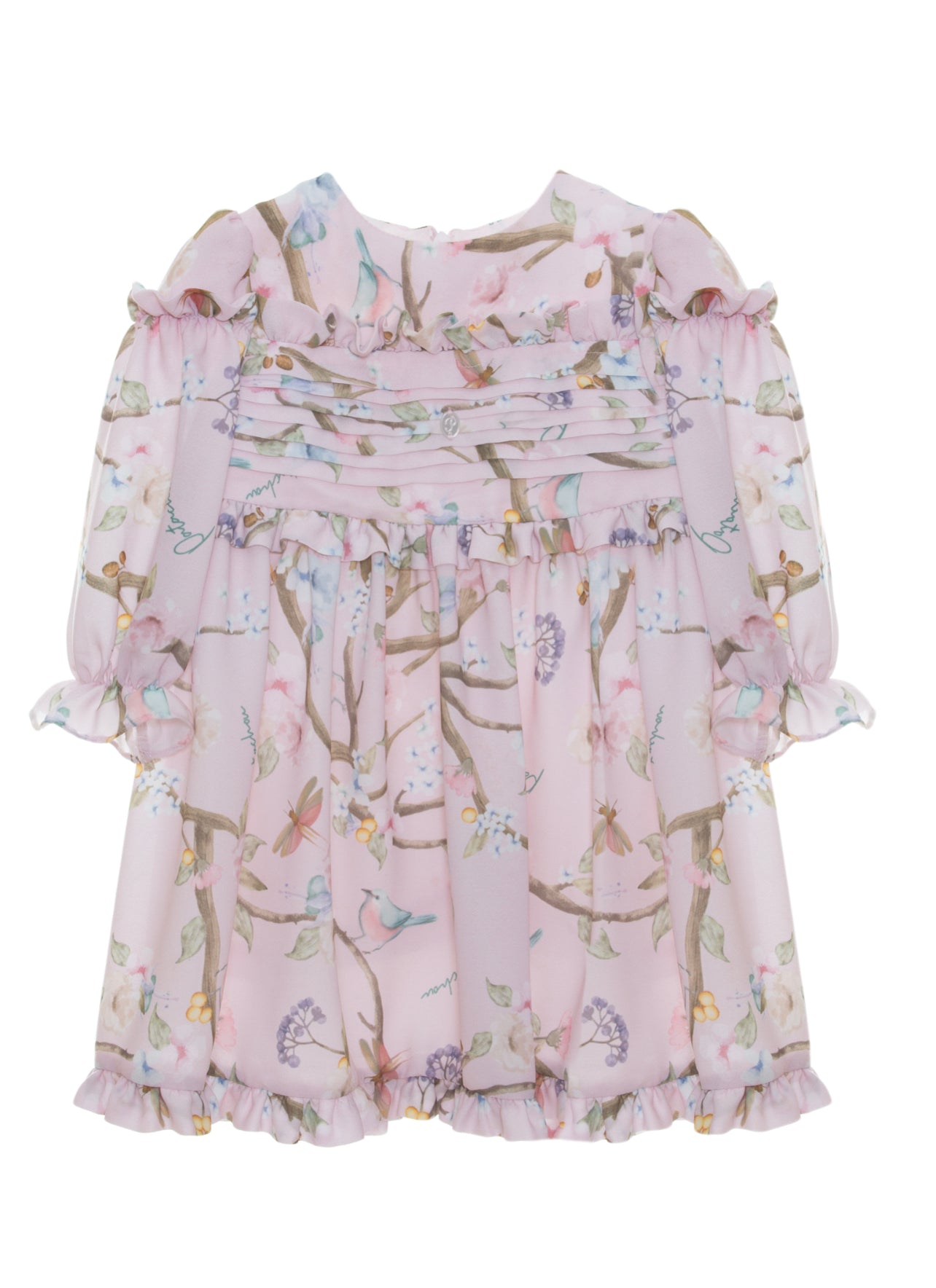 Beautiful Pink Floral print chiffon dress with bow details.Beautiful,Classic and Feminine design that doesn't go out of style.
