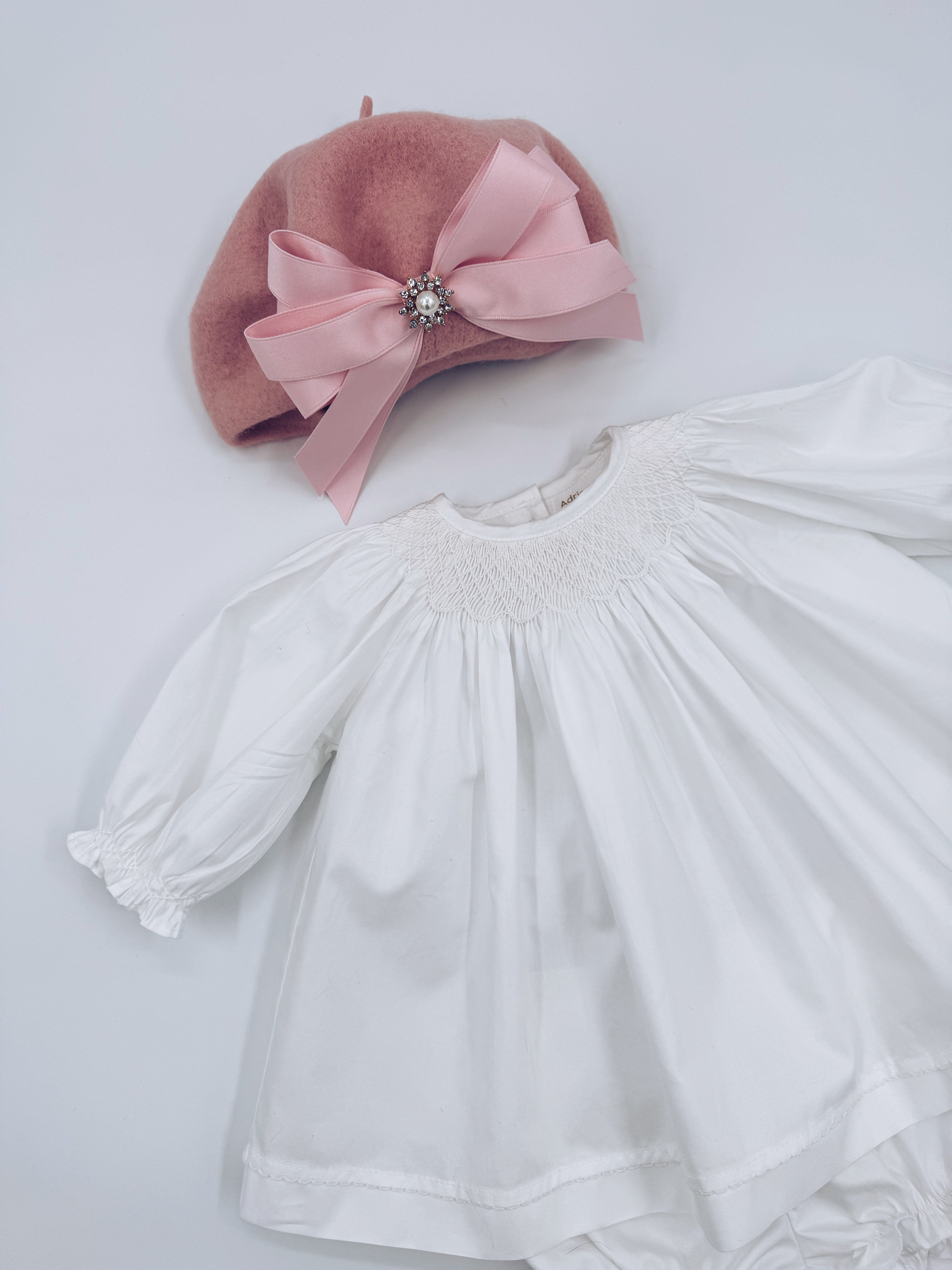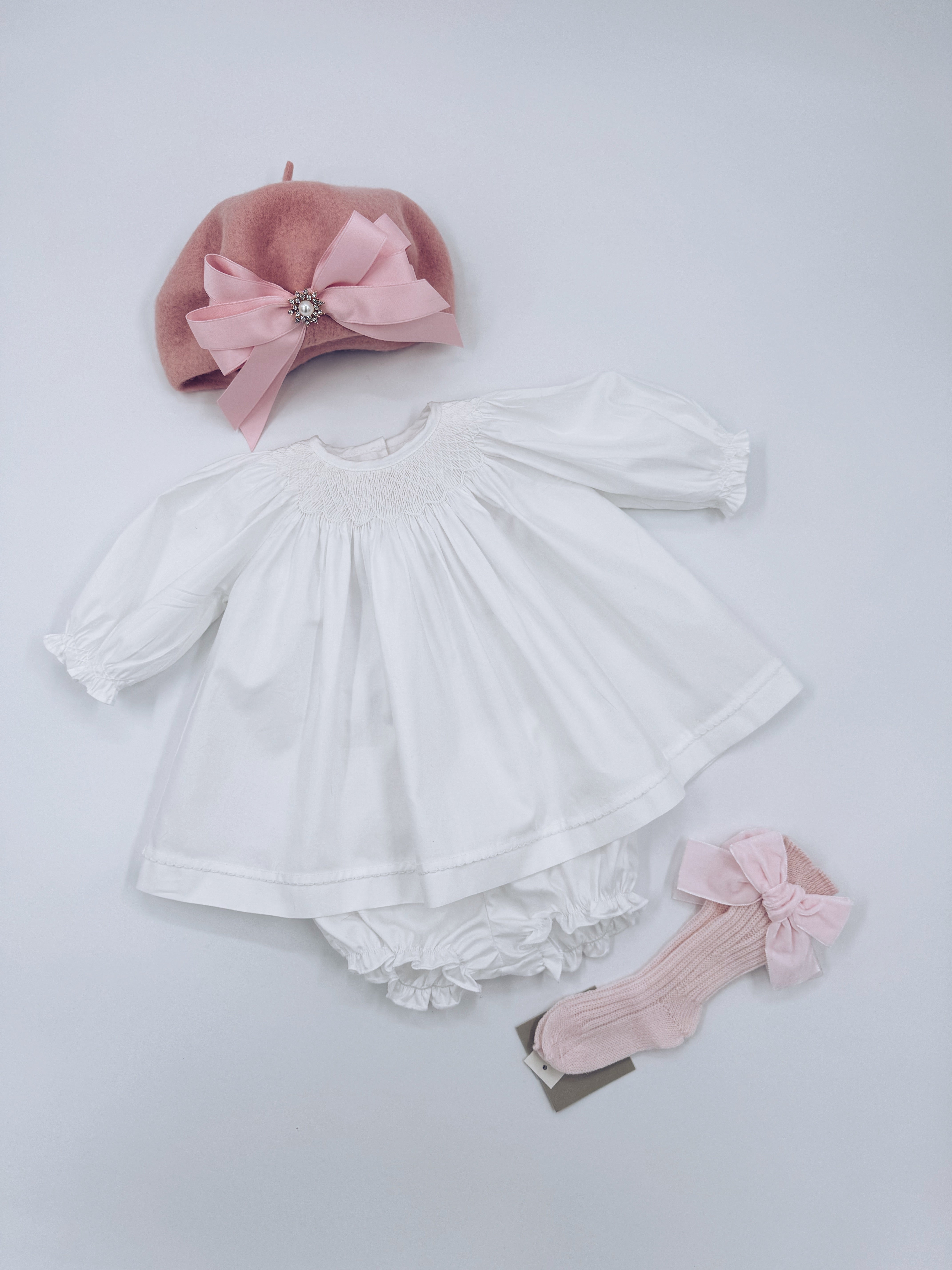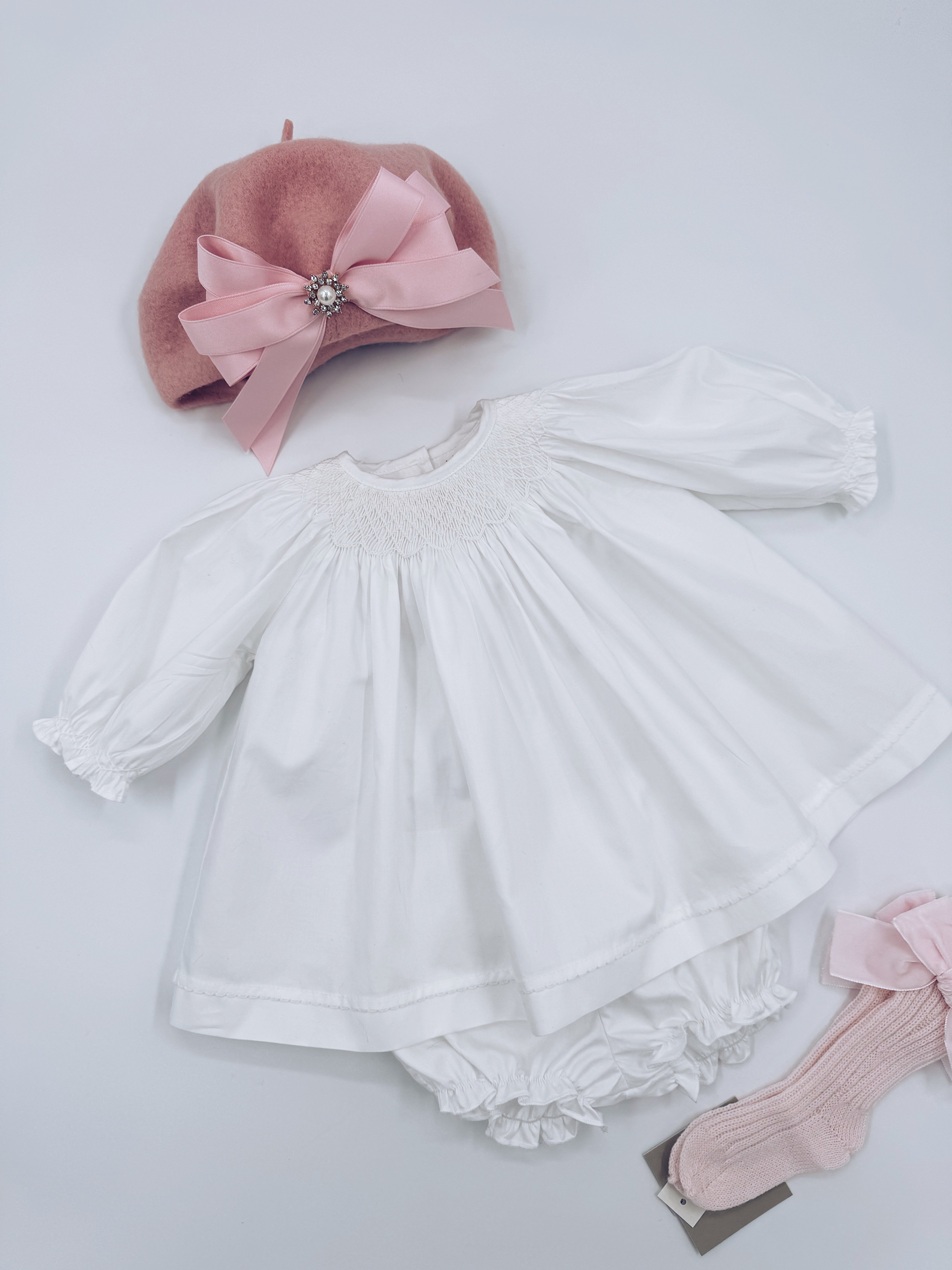 Beautiful White long sleeves Hand Smoked dress and bloomers 2 piece set.