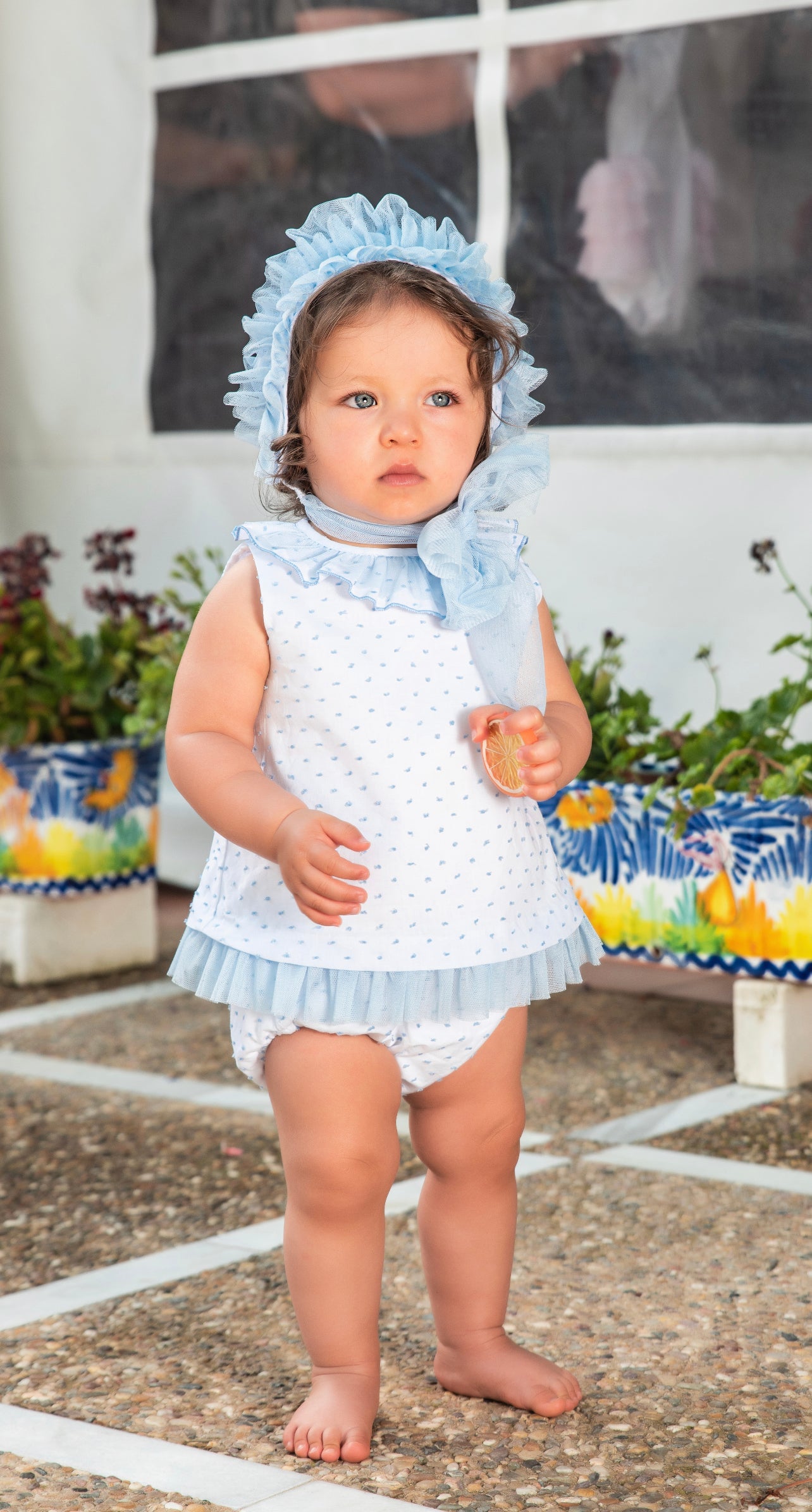 Beautiful Baby Blue Baby Girl Dress and bloomers 2 piece set with tulle frill details.